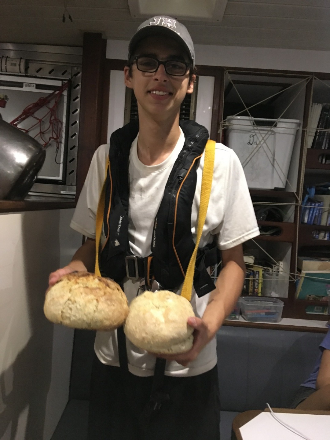 Today was like any other day on the crossing. We wake up, eat lunch, do classes, shower, eat dinner, and go to bed. Thanks to our wonderful head chef, Claire, and her sous chefs, Jackie and CJ, we had an amazing sweet potato casserole along with spinach risotto for lunch. Dinner was fabulous chicken parmesan. There was also bread made by our bread-obsessed and determined bread maker, Cole. He’s been making bread for three days in a row now. This was his best bread yet, but I somehow doubt he’ll stop there. He’s perfected getting the bread to look golden, too, which is probably just encouraging him to keep making more. Nobody seems to mind that he’s taken over this role, though.