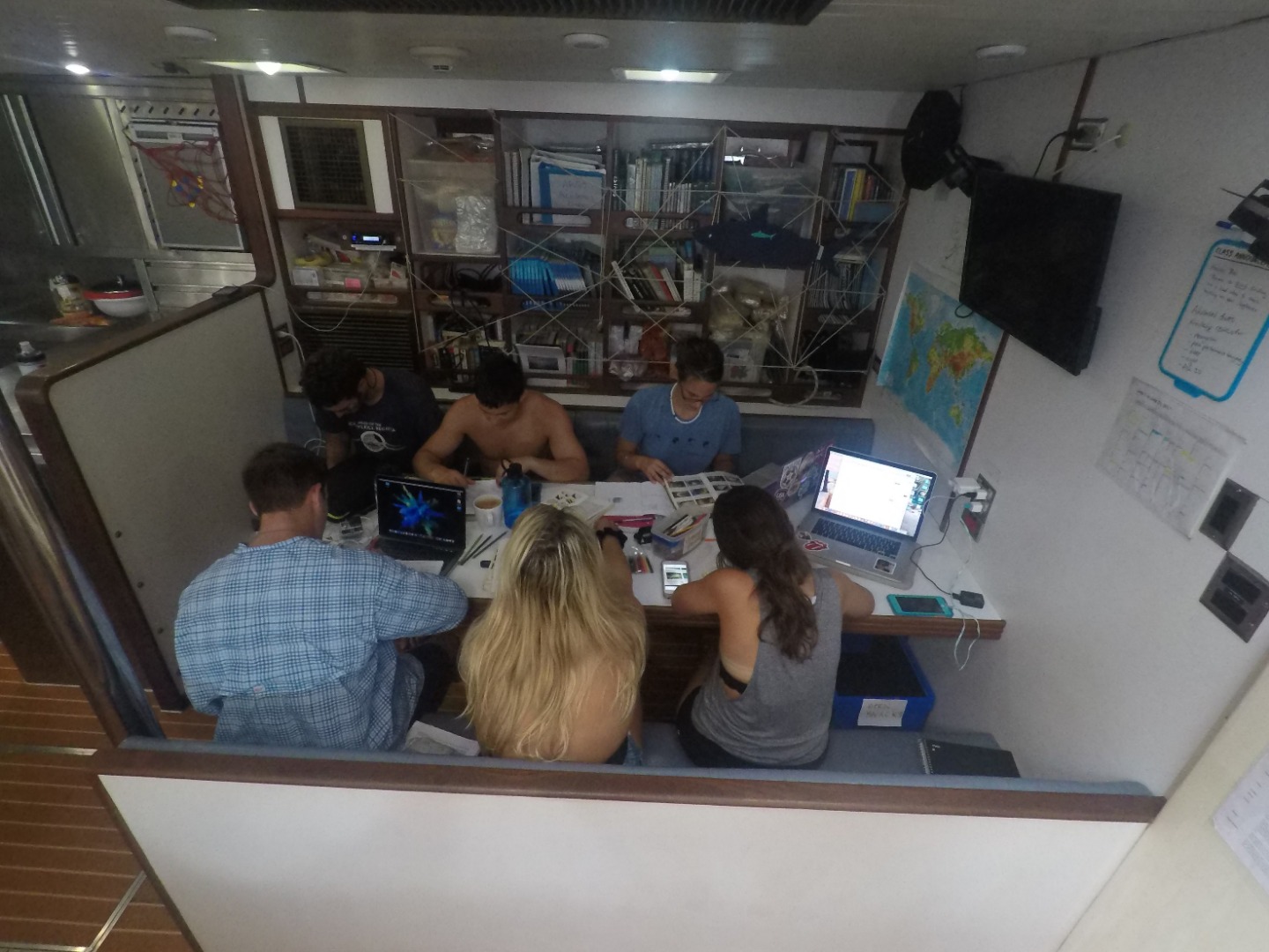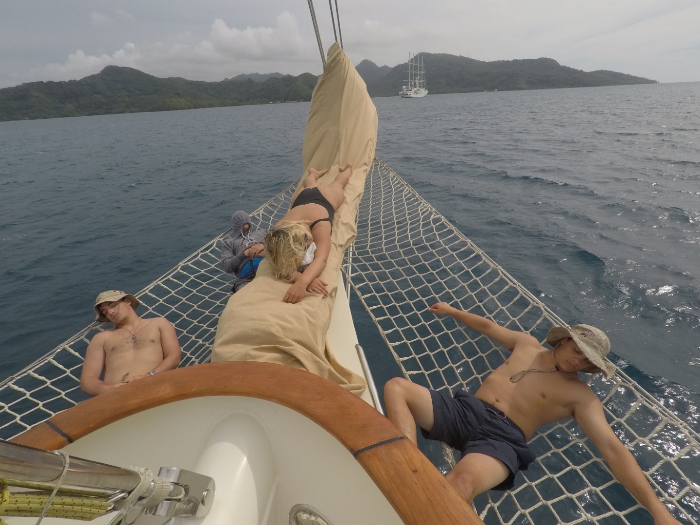Yesterday, we arrived in Tahaa and spent the night in our original anchorage, but unfortunately, we had to move Argo to get better diving locations. The students taking PSCT were then tasked with charting a new course to a better mooring position. After a good night’s rest and a beautiful sunrise, the PSCT students began moving the boat (with professional supervision, of course) to a better mooring spot. Breakfast was cooked by our wonderful chefs, Carolyn, Sara, and Taylor. After filling up on eggs, sausage, and potatoes, the open divers headed into the water via a boat entry for their first open water dive! Certified divers had free time. Many people then worked on Marine Biology homework, did laundry, or caught up on sleep. Such activities were interrupted intermittently by a pod of Spinner dolphins jumping and swimming nearby. When the open divers returned, we had a wonderful lunch of coconut soup, which consisted of coconut milk, rice noodles, garlic, bamboo shoots, and spices. The weather was windy, and the sun was fighting to stay out all day, so soup was a welcome warm meal. After lunch, the certified divers had the opportunity to go on a fun dive. Some students saw eels, while many saw the fish we have been studying in Marine Biology. Once dives were over, there was more free time for everyone to do work, clean, or hang out on the deck. The PSCT students sat with Jim before dinner and learned the basics of celestial navigation, which was incredibly cool and about as complicated as I originally imagined. For dinner, we had a plethora of yummy leftovers to choose from that ranged from lentil soup to mac & cheese. After cleaning up, we have a Marine Biology class where we will have our first Fish ID quiz.