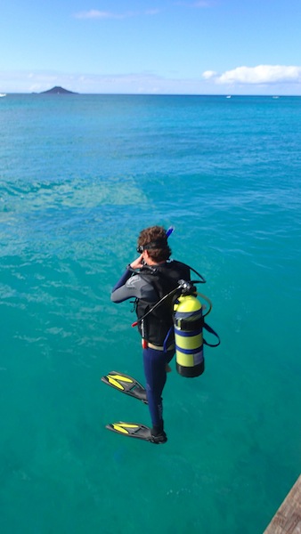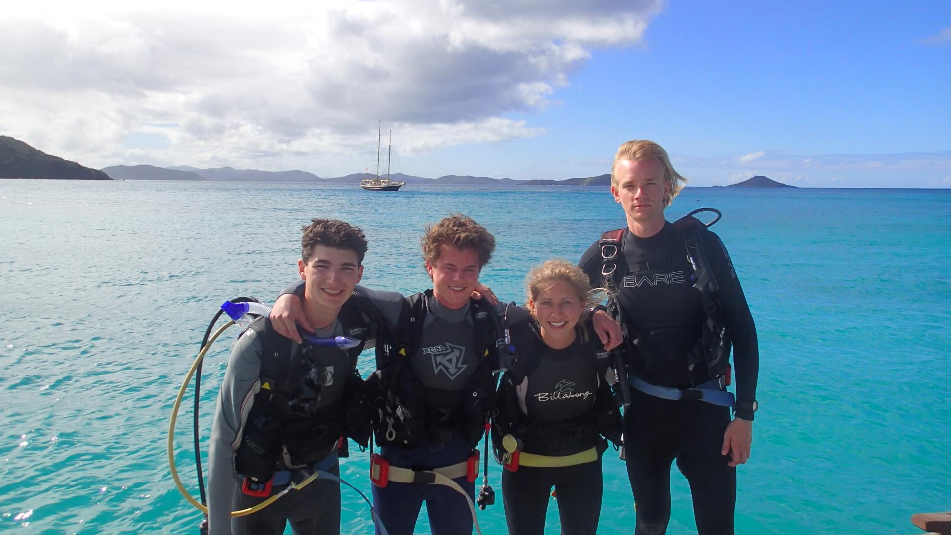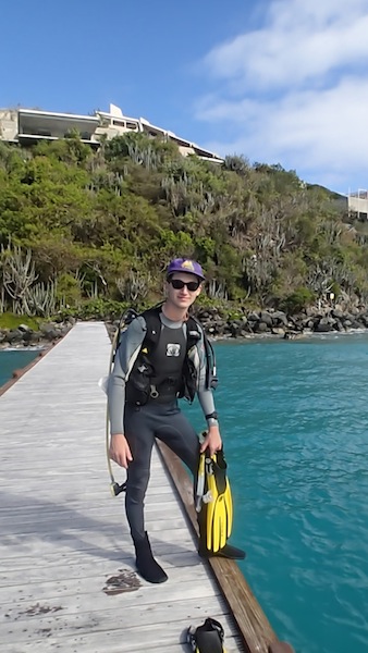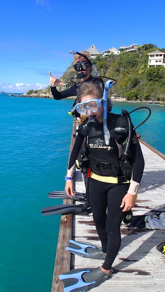 Our day began with eating French toast on the deck while a brilliant rainbow hung over our port side. After finishing the morning duties, the students studying PADI Open Water completed their third classroom lesson and then set up their gear to go diving for the first time. Much of the rest of the day was spent practicing basic skills like mask clearing and buoyancy control. Students working toward their Advanced and Rescue certifications reviewed how to dive off a boat, both a little dinghy and a large boat like Ocean Star. After reviewing basic skills, we had time to take in the underwater surroundings; barracuda, squid, and sea fans waving gently in the current. Most of us agreed that diving in the crystal clear turquoise waters of the tropics beats diving in the cold, turbid waters of our northern homes. We look forward to exploring coral reefs and wrecks in the coming days. After we stowed our gear safely, we raised the anchors and motored around the point to Spanish Town, where we are anchored now. We set up a table on the deck to enjoy stir-fry by starlight, and then the shipmates snuggled into the salon for their first taste of academic fun intro to Marine Biology. As I sit now in the chart house on the gently rocking boat, the soft sound of a guitar is carried on in the breeze from the bow. The other shipmates are sitting together in the Salon quietly, studying and conversing. Everyone’s settling down to get a good rest for the day aheadgood night from all of us on Ocean Star in Spanish Town, Virgin Gorda, BVI.