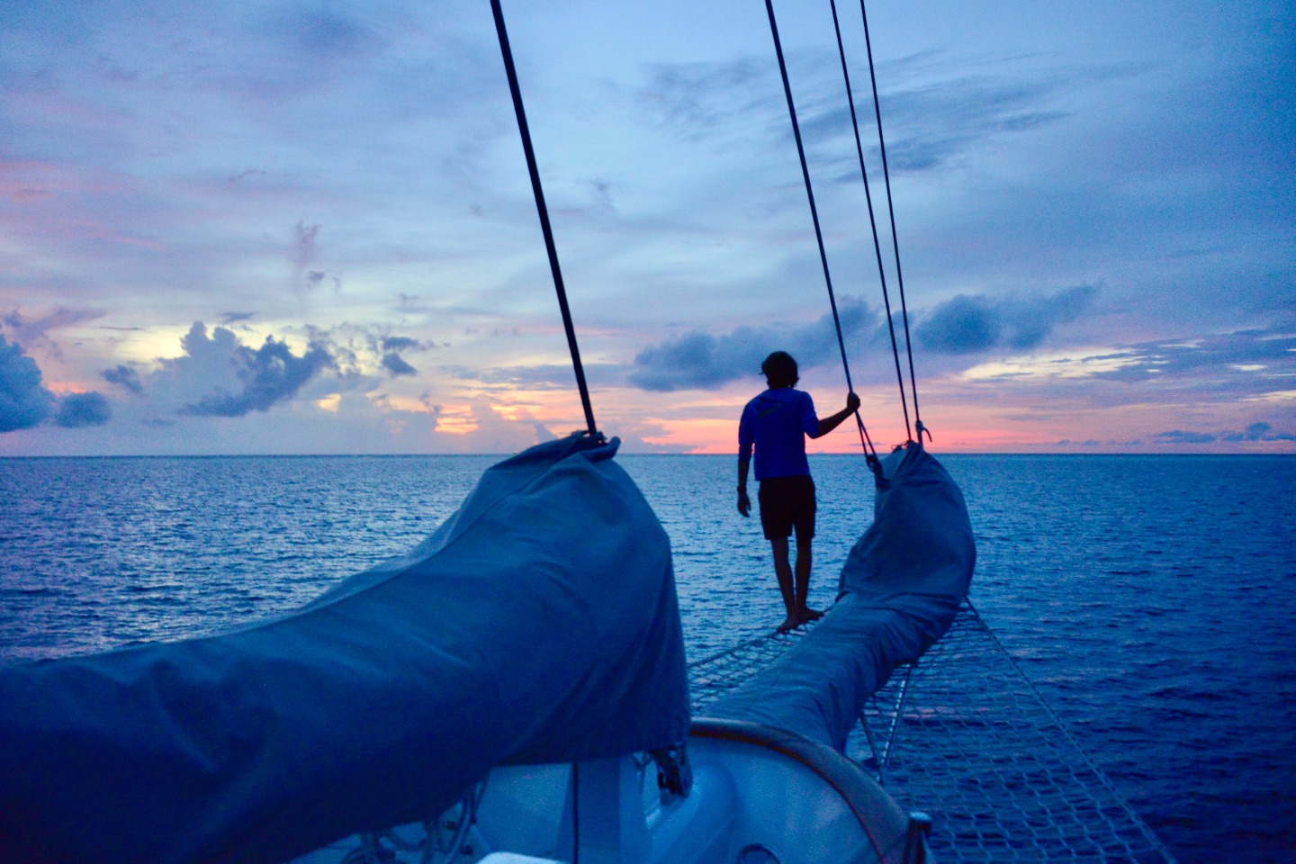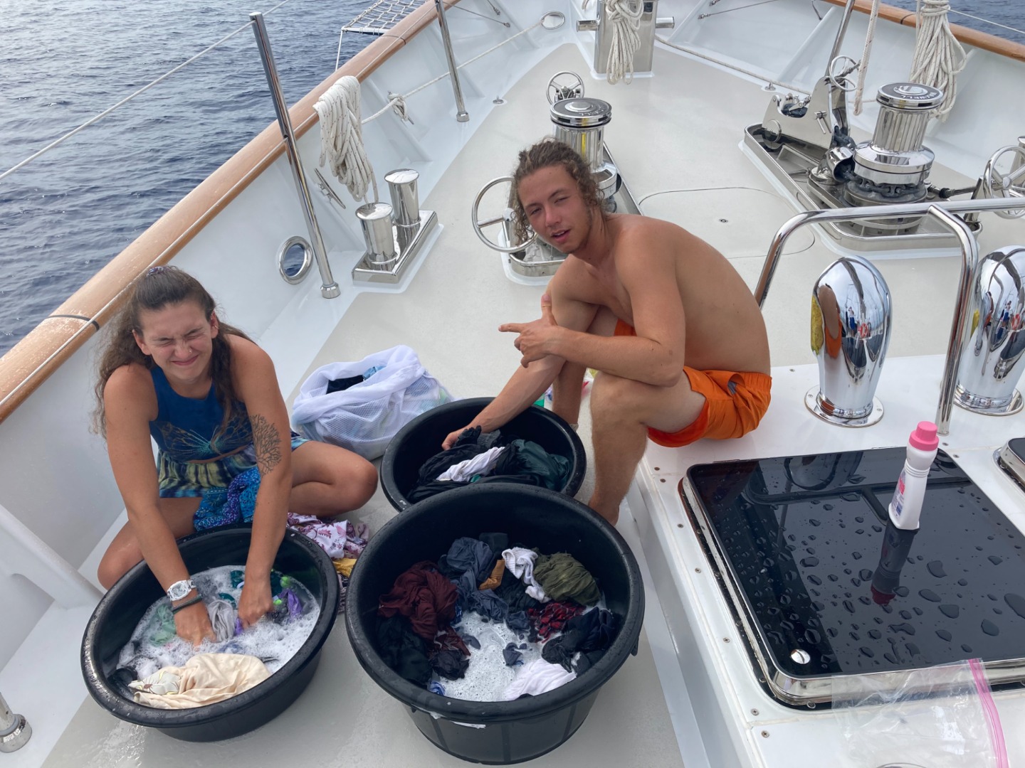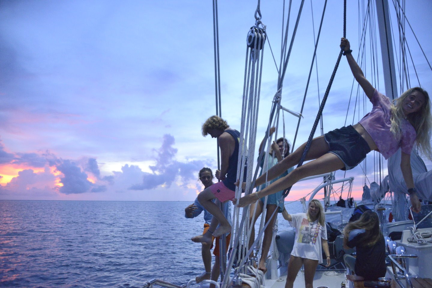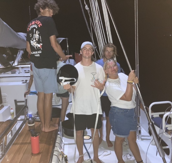 After wake up, Sam and Valentina cheffed up some delicious french toast for breakfast, accompanied by a tasty fruit salad, all of which was eaten down below due to a spontaneous squall that hit our location. After breakfast, we proceeded onto Oceanography class, where we took our first class quiz and then were refreshed on water’s make-up and overall significance within our environment. I can’t put a finger on exactly what it was, but something about having Oceanography in the morning was very pleasant. Twenty minutes later, we had Oceanography. We had our final Seamanship class, where we went over safety procedures and logistics. Directly following class, we were finally joined by our new staff members Smudge and Jess. Shout out to them for being resilient enough to make the trek here, considering the complications. We’re all extremely excited to welcome them into the family and get to know them better.
