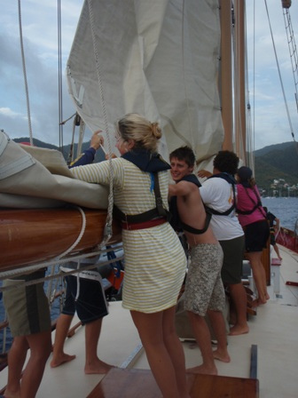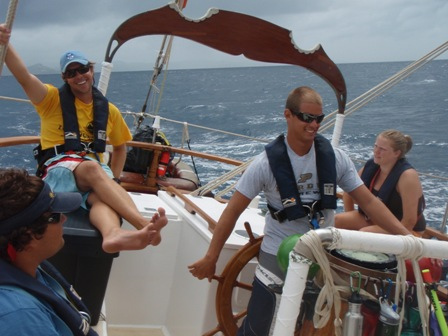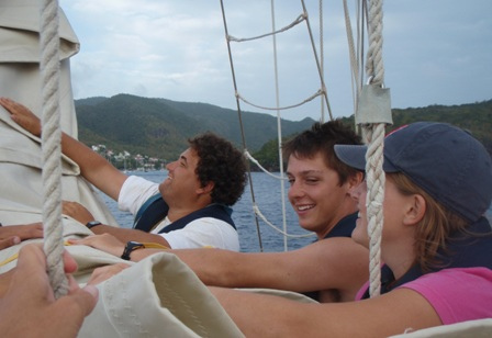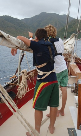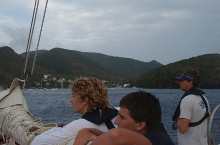 Ready to leave for St. Pierre, the crew assembled in the cockpit and were told to lower the dinghies. Perplexed, we were informed that we were leaking transmission fluid and would not be able to leave until we had a part made. The crew used this time to study for the upcoming Marine Biology exam. After several hours, we decided to take advantage of the extra time in Rodney Bay to check out the lookout fort and snorkel. However, Kevin soon crushed all hope of shore time by bringing the part we needed right as we were ready to leave. However, all was not lost, for we soon had banana bread to ease the pain. After lunch, we raised the sails and were underway. The trip was rather smooth and included a visit by some friendly dolphins. We arrived in Grande Anse D’arlet late in the afternoon, where we had dinner and were about to have our exam. So if you excuse me, should I go study?