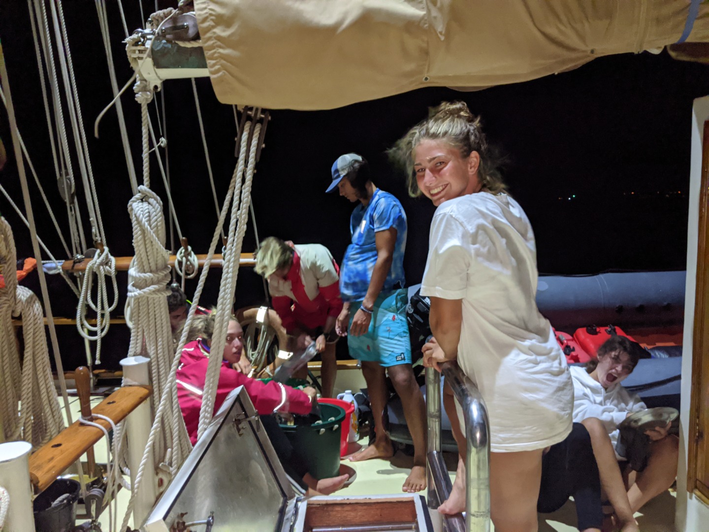 Now, the crew is spread around the vessel with some reading the adventures of Peter Pan as a group, talking with family back home, discussing the snorkeling, studying, and curling up with music or movies. So from me, it’s goodbye for now. Take it sleazy
