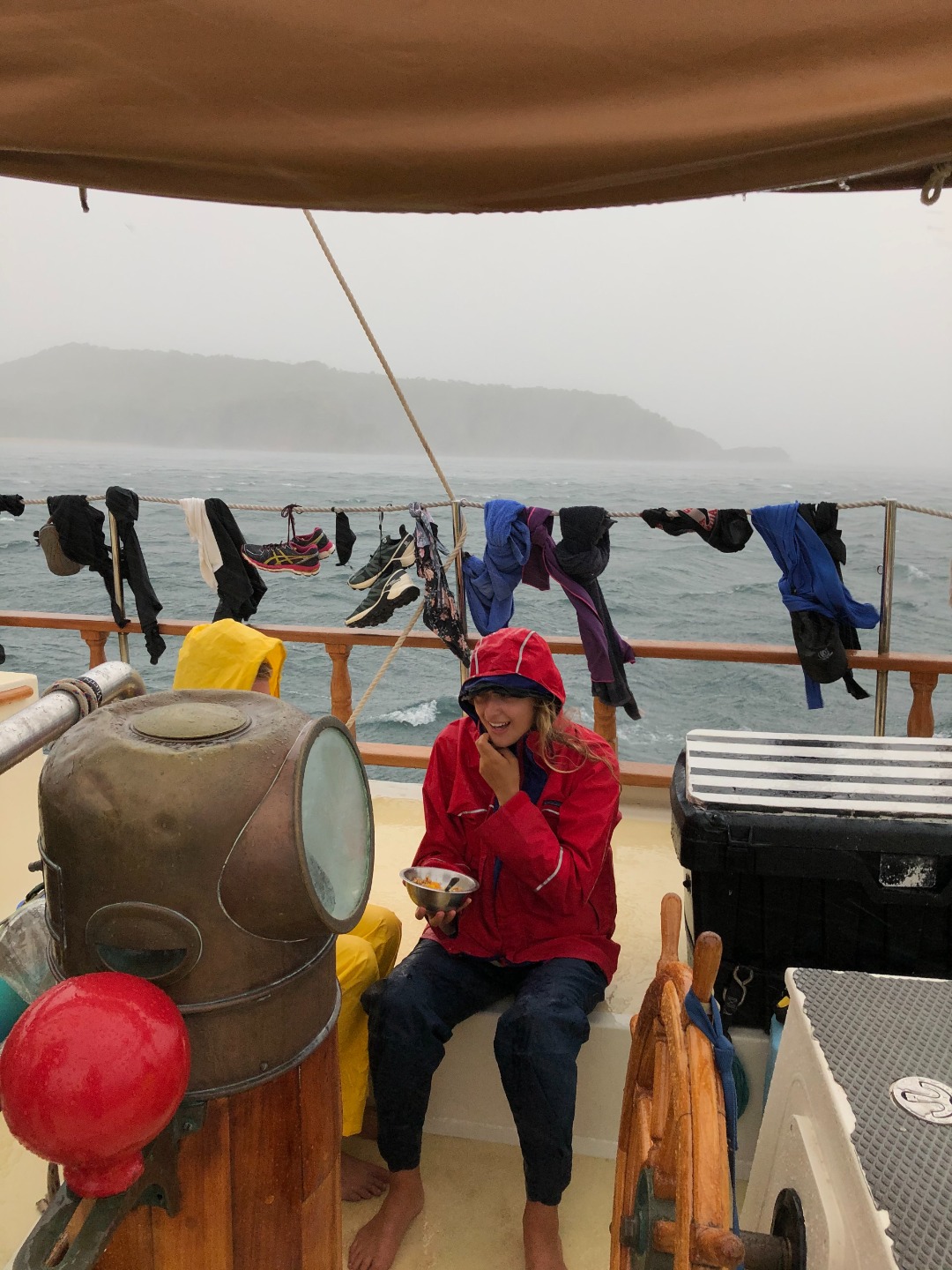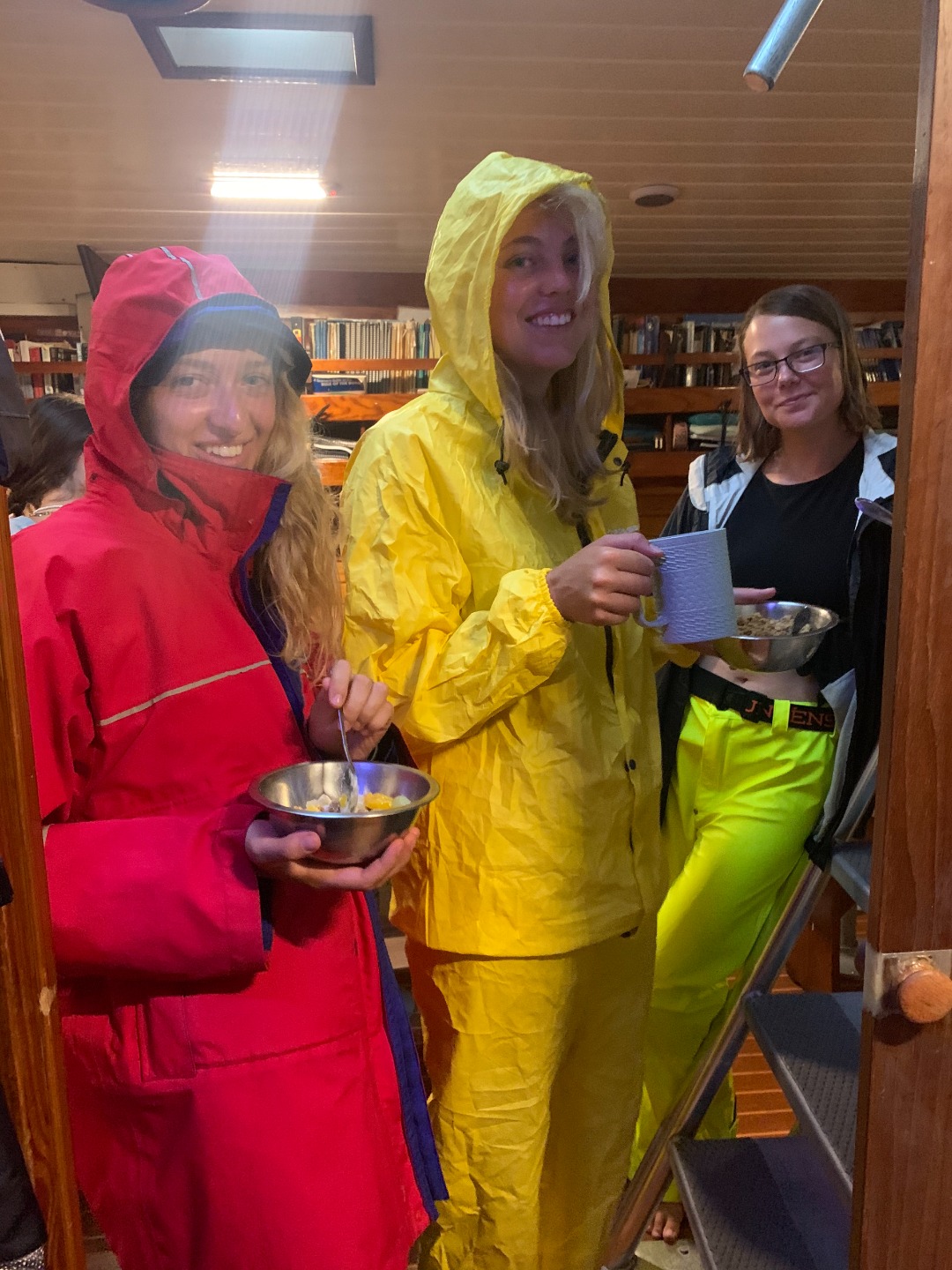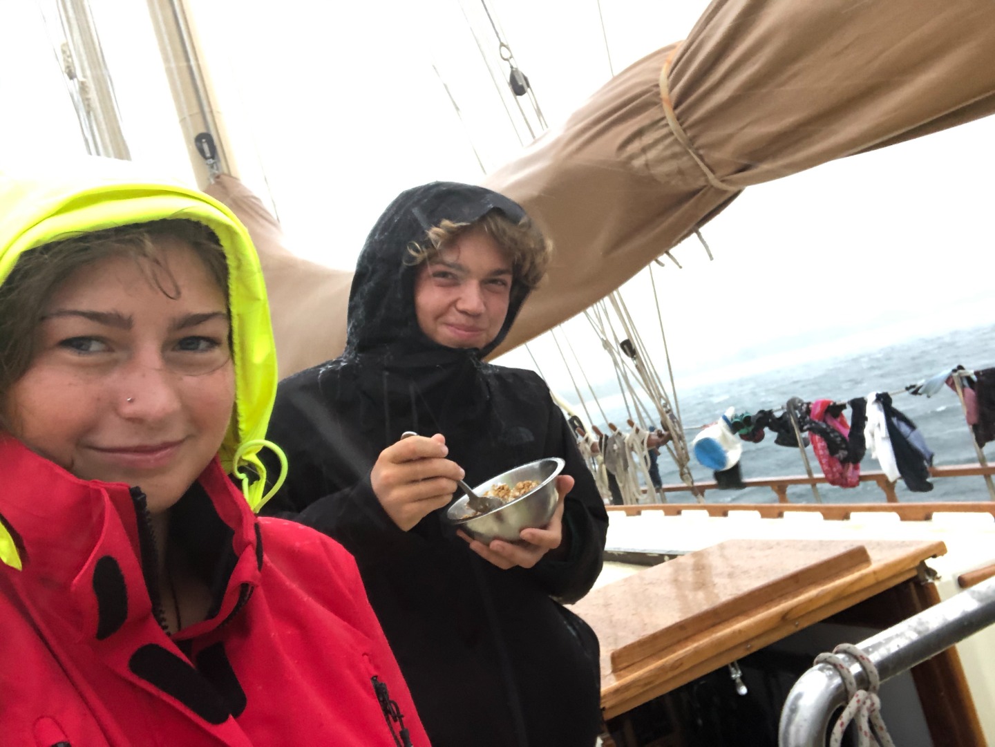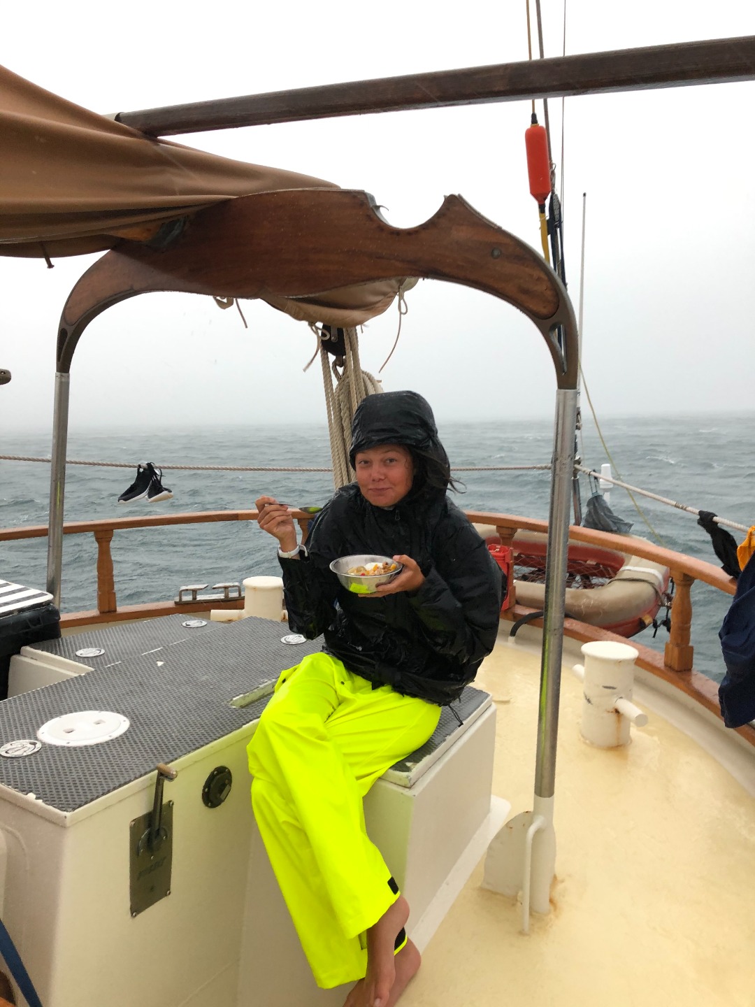 It was a 6:45 am start for me as I prepared my speaker for the crew, ready to wake them at 7 am with the incredible sounds of Black Coffee, a South African DJ, and his song “Come with me.” Just like most mornings, many of the crew were already awake, studying, preparing coffee (that you could drink), and Captain Steve preparing breakfast. Moments before the gophers were about to hand up the breakfast for us to eat on the deck, the wind picked up, and the rain started to pour down. Still, we had a few people keen to test out their foul weather gear and eat in the rain. This required some bravery and skill as they learned they would have to catch their cereal rather than the usual spooning it in the 35 to 40-knot winds.