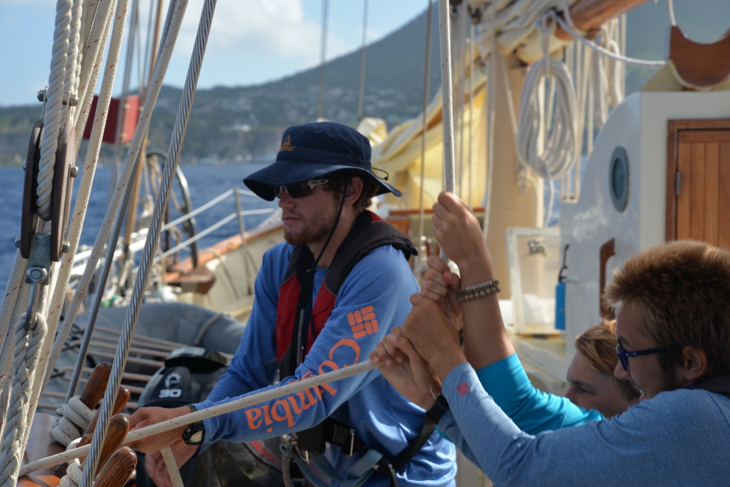 Pictured: a student-led passage from Statia to Saba; view of Statia as we departed; staff cuddle puddle in the chart house