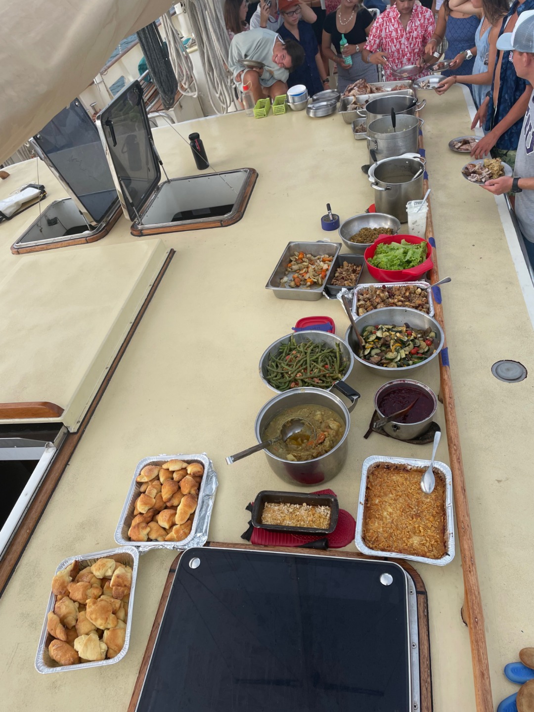 This brings me to the real climax of today. Thanksgiving on Argo is an undertaking. Actually, it has been the only place I’ve ever experienced it, and I believe that Matt also had his first Thanksgiving experience today. For the last 36 hours, people have been rotating through the 2.5 square meters that is the galley in preparing the mind-bending spread we were treated to this evening. With dishes spanning from the traditional turkey to sticky rice, this really put the old adage about there always being room for dessert to the test. However, a tremendous quantity of calories aside, I am struck by the extent to which large meals such as this are largely an exercise in facilitation. Inherently they are, of course, wonderful, but I think there is more to our consistent capacity to push ourselves to eat until movement itself is a challenge. I think this is the function it plays in the facilitation of community. Though we eat together every day, some of these gatherings are more equal than others. They offer an opportunity to take a step back, breathe in and appreciate the people that we gorge ourselves alongside.
