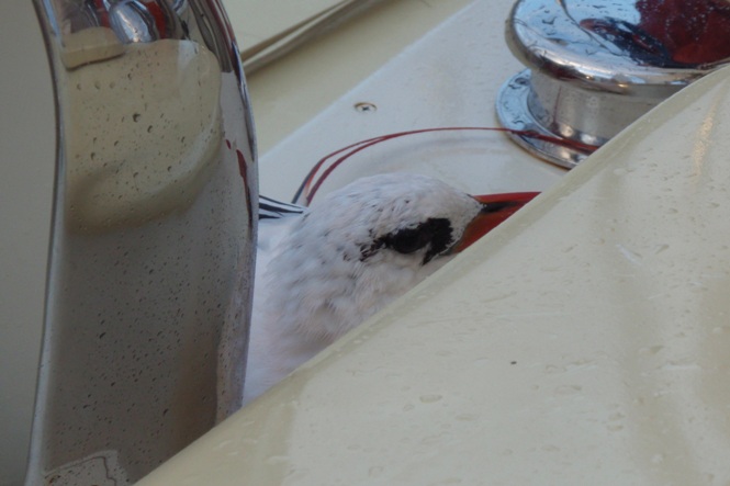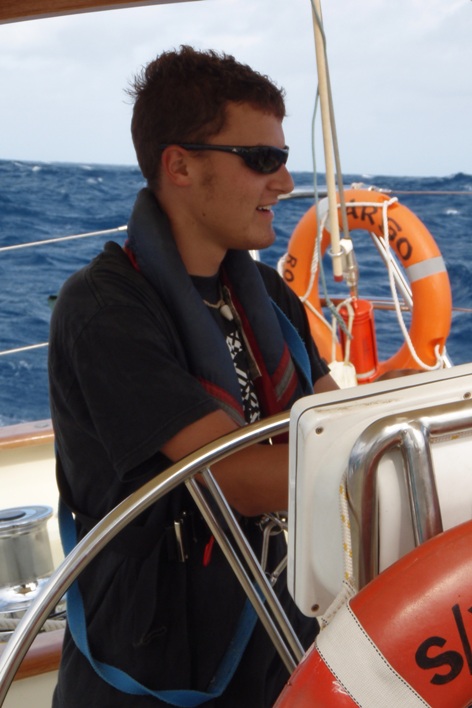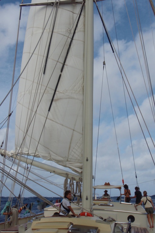 Another day in the middle of nowhere, and apparently, today, we are at least 1000 miles from any kind of land. Fitting then that this is the day we see more things than the last 5: two logs, two lots of whales, and a light, well a glow at least that we can pretend was a boat. We also acquired a boat pet for a short while, at least. A bird decided to use us for some shelter overnight, so we decided to name him Goat. There was no good reason why, but it seemed fitting. The goat stayed with us, happily munching on some flying fish that kept peppering the boat and those aboard. After breakfast, we decided that it was time for the goat to go as another bird was flying around looking for him, so bundled in a towel, Francis picked him up and sent him on his way. There were two classes, showers and meals as usual, and a slop served up by Gaylin Cooking Co. to keep us all in good health. Watches continue as we head further toward our destination.