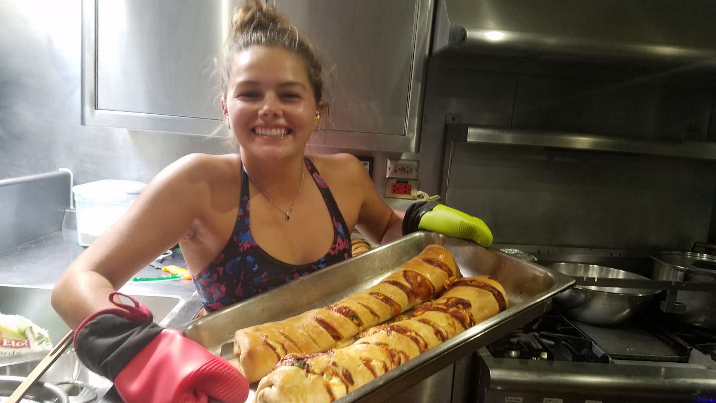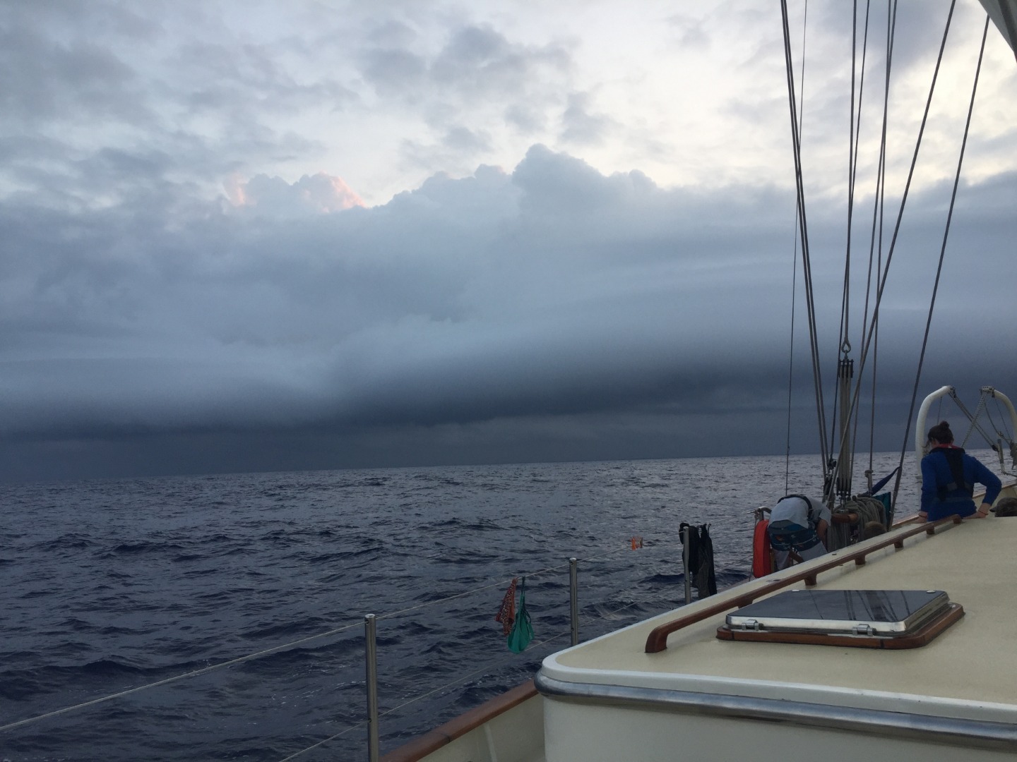 Today was a very exhilarating day aboard Argo. First, Claire Maco was serenaded at 4 AM to celebrate her birthday by both Watch Team 1 and Watch Team 2. After everyone got some sleep, Claire was again sung to during lunch. I am writing this entry prior to dinner, so perhaps she will even be sung to for a third time before you have read it. While the first few days of passage had been relatively calm, which meant that we did not have any sails up, we were thrust into an All Hands On Deck situation right before class started in order to raise four sails. This surprising development both delayed today’s classes (Seamanship and Marine Bio) and prevented everyone from getting the beloved nap within the 2-6 window that we have grown so accustomed to. Even more excitingly, we have crossed the 5000-mile mark since Darwin (with Mikaela and Charlotte at the helm)! Several people on Watch Team 3 took credit for being at the helm, which is probably the reason for Watch Team 1 needing to straighten us back on course once Watch Team 3 was relieved. Jules was our head chef today and is pictured with her Stromboli, which turned out excellently. It was a true team effort in the galley, with Lindsay having to be bread-signaled in to save Eric’s pizza dough-making fiasco, and the chefs had to work through the class to make sure dinner was out on time. Tonight’s squeeze question will be “What would be your last meal on Earth,” leaving the possibility for future meals to be consumed en route to or on the moon, and especially pertinent distinction given the Argonaut’s obsession with the moon. As Mikaela’s photo shows, we were approaching a weather system around 7 PM, so hopefully, tonight’s watches won’t be too wet!