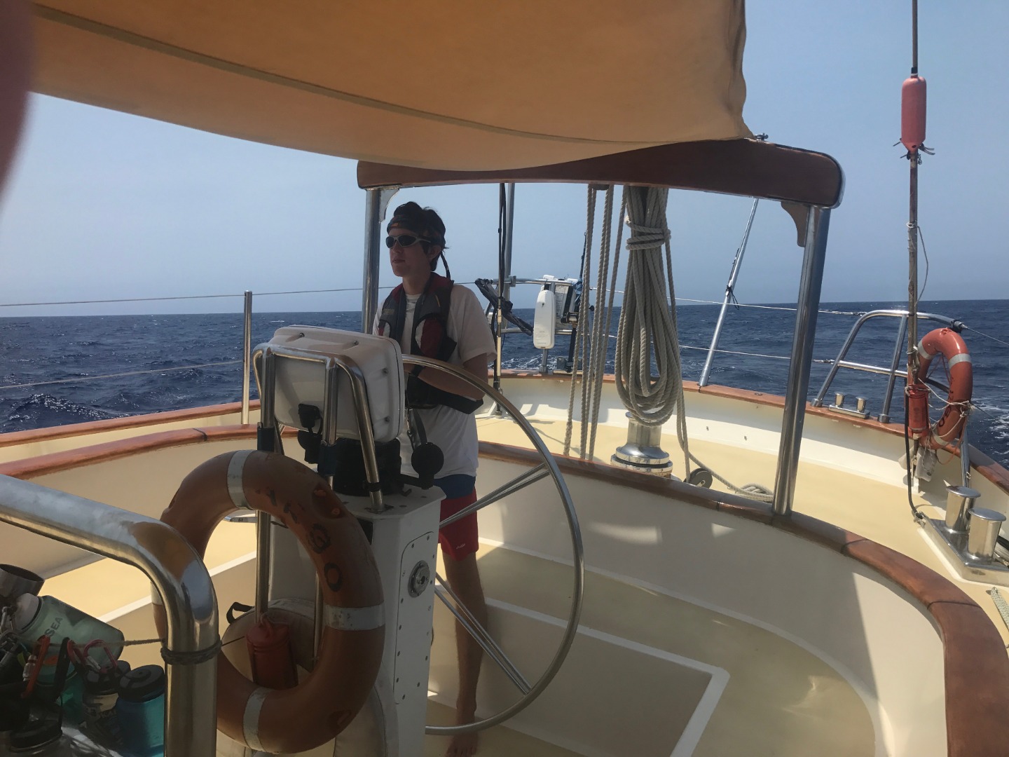 I am settling into this next passage with very little difficulty so far. My Watch Team was fortunate to start with the 4-8 AM Watch, which allowed us to start the cycle well-rested and relaxed. Today, my job is being the skipper, which is why you’re reading a blog post written by me. Tomorrow I am one of Jonluc’s sous chefs, so if you have any tips about how to make Huevos Rancheros–or what that is–and chicken pad thai, please call the boat’s sat phone to let me know. You can see the photo below of me on the helm; as you can see, Dad, I am not wearing my prescription glasses, instead opting for my contacts per your instructions. Other than that, I am still merrily on a boat that is sailing in an ocean; not much has changed.