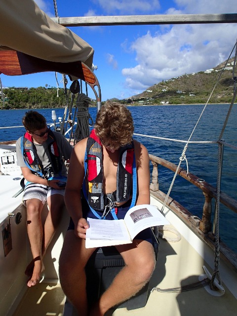 The sky was clear, and the sun was already shining bright by the time the boat woke up for our last day at Nelson’s Dockyard. Rescue divers in training began their day by finishing up the last of their theory work while our shipmates worked on some rigging that needed some attention before we left the dock. After lunch, March Madness brackets were evaluated, and current standings were announced. On to Falmouth Bay! We cast off from the dock, picking up both the anchors we dropped for the med mooring without a hitch. The move was only to the next bay over, so it went by quickly. Soon after, potential rescue divers put their kits together and jumped in the water to play victim and rescuer, practicing some tows and rescues we’d learned about earlier. The afternoon passed quickly, and after a fantastic treat of Ceviche and tartar from the fresh fish to accompany our chili, we headed down to the salon (family room) for a class on marine mammals.