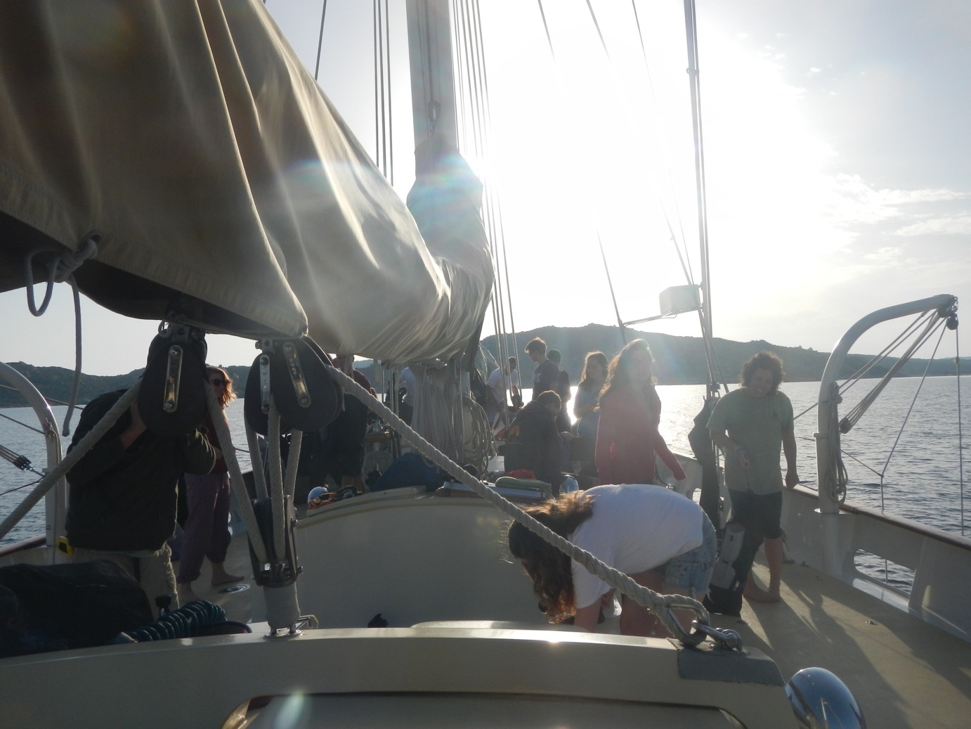 The first thing we did today was clean Argo. It took almost the full morning to soapy wash the deck, clean our cabins, etc. When Argo looked like the Argo we saw on the first day, we made sandwiches for ourselves and went off to the beach. At first, we were all separated; some of us went to one end of the beach to tan, others went to the other end to play football and rugby, and others even went sailing. At 3:30, most of us were tired and left for Argo. We had a good dinner followed by an introduction to our science classes, and now we are ready to sleep, do our anchor watch, or just hang out on the deck and have fun.