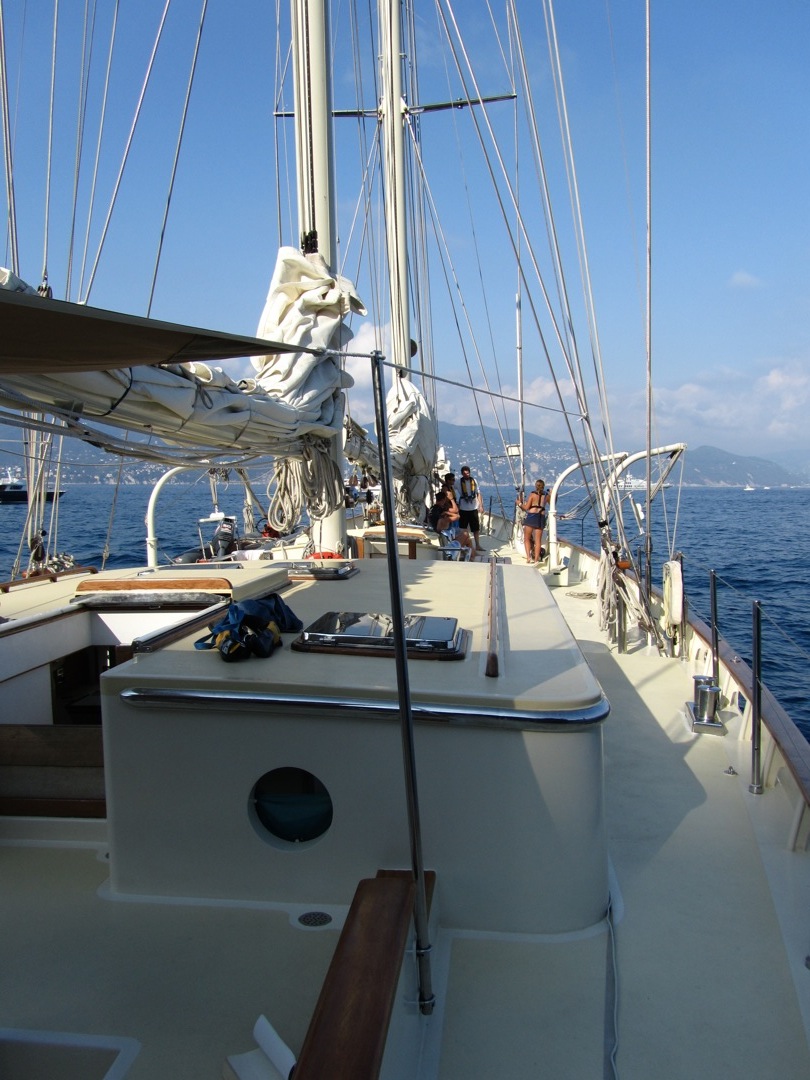 After a delightful breakfast of fluffy scrambled eggs flecked with rich, salty Italian pancetta, we journeyed ashore to the quaint town of Portovenere. This old Italian fishing village is infinite in its charm, with the old pastel buildings tucked in shoulder to shoulder, hiding unique shops that offer authentic local goods like pesto, olive oil, and wine. The students came back loaded with great gifts for friends and family and full of delicious local fare. After a tasty lunch, all hands pitched in and got us underway to our next destination: Portofino. We pulled up anchor and motored along the gorgeous, dramatic northwestern Italian coastline, which was dotted with homes on impossible perches, the quaint fishing villages of the Cinque Terre, and fellow sailboats meandering up and down the coast. A tailwind picked up on our way, and we pitched sails for a dead run, but alas, the breeze was only a perfunctory exhale from the mouth of Aeolus. Undaunted, we packed the sails away and continued along for the panoramic remainder of our 35-nautical-mile journey. Around 6 p.m., we arrived at the spectacular point of Portofino, whose distinguishing features include structures ranging from crenulated medieval fortifications to modern luxury homes thronged along dramatic tree-lined cliffs that drop sharply into the crystal blue waters of the Adriatic. With Argo now secure, we are free to relax on board this evening with a movie night and popcorn, all of which will be set up on deck thanks to Captain Sean’s projector and speakers and my spur-of-the-moment purchase of popcorn kernels a few days ago. Tomorrow brings the promise of another day of adventure, excitement, and discovery, only adding further to this epic and halcyon summer. May we please extend this summer into eternity?