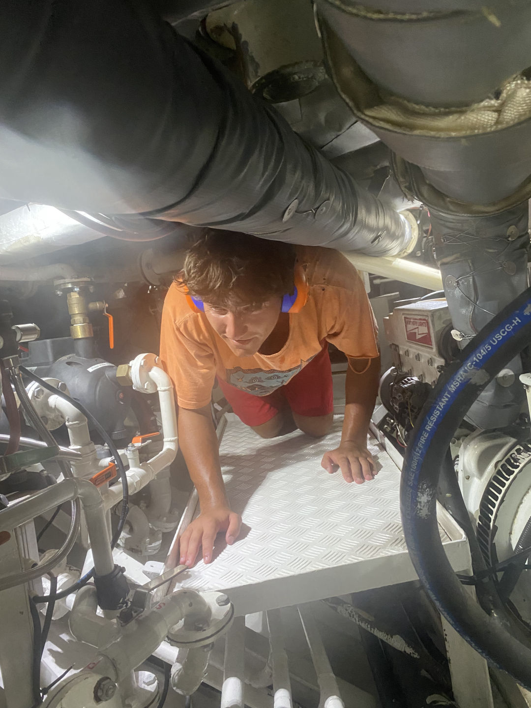Wooooo!!!! Another splendid day living on Argo. I woke up today at promptly 6:55, waking everyone up at 7 with my “GOOD MORNING, GOOD MORNING, GOOD MORNING.” Emma and I went swimming and did the last martingale jumping of our voyage. It started raining right before breakfast came on deck, so most sat in the salon waiting it out. I did some dancing and free diving! After a lovely crumble breakfast made by Claire, we started the FIRST EVER IN SEAMESTER HISTORY “third” student-led passage. A quick 20 minutes later, our passage to Slipway had concluded. During the passage DeMop, Ellie, Zoe, and I explored the engine room. We crawled to places we didnt even know existed. A smashing time if I do say so myself.