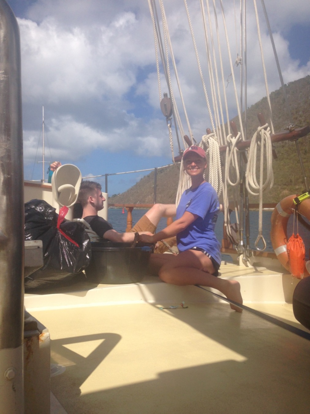 With the promise of on-shore time before our dreaded 30-hour passage to Nevis, it was all hands on deck this morning to get ready. We raised anchor with the precision of a group of college students who have been on a ship for two weeks (we still need a little help) and motored out of Sandy Spit back to West End. At the helm, I learned of the intricacies of water traffic while others enjoyed a simple yogurt and granola breakfast. And in a truly incredible feat of engineering skill, Steve attached and raised the jib singlehandedly.