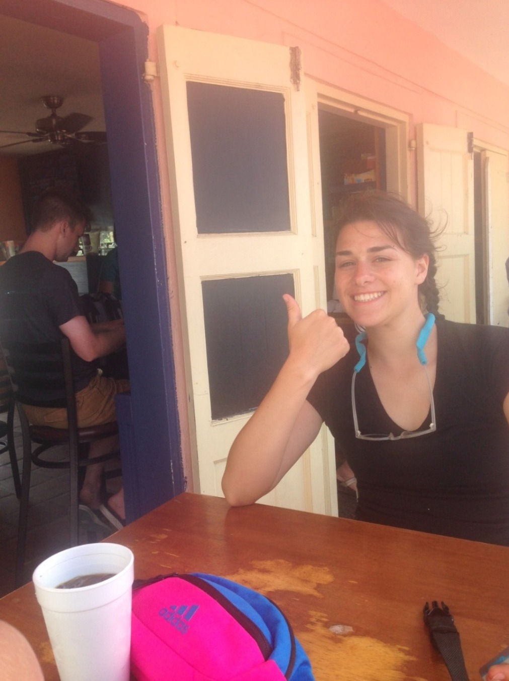 Kylie, Skye, and Jules walked the two-mile death march to the store and asked for their whole supply of Dramamine while Mari, Dan, Tessa, Claire, Miranda, Kyle, and I stayed at the cafe to drink iced coffee and enjoy the slightly overcast day. It feels wrong to complain about how beautifully blue and sunny it is all the time, but the sunburn on me is thankful for some shade. A relaxing day overall before the exhaustive four hours on, four hours off pattern of passage watch.
