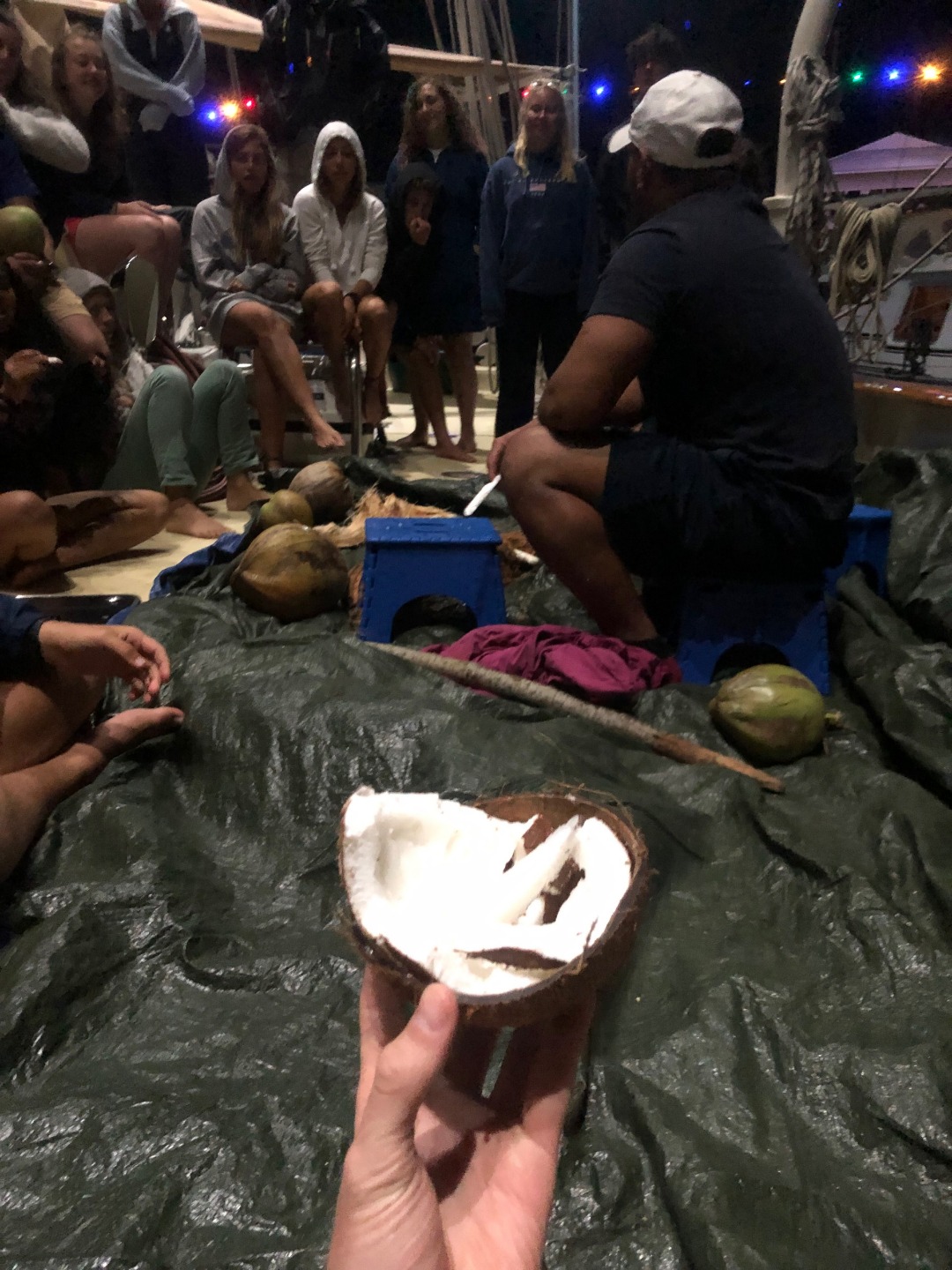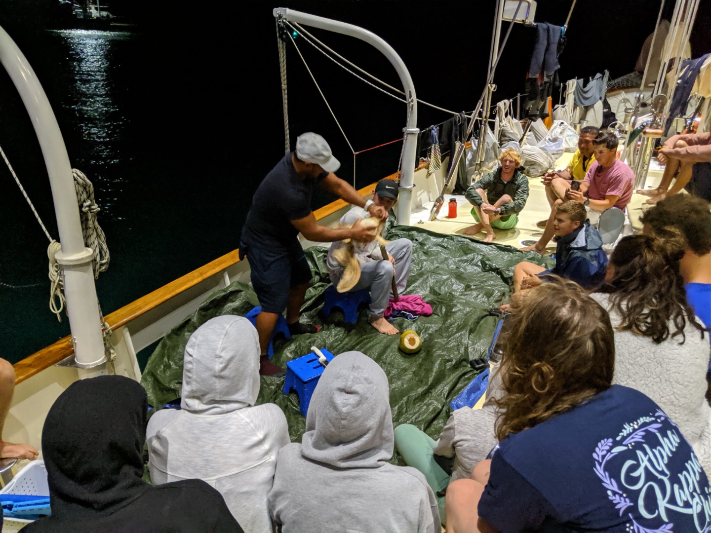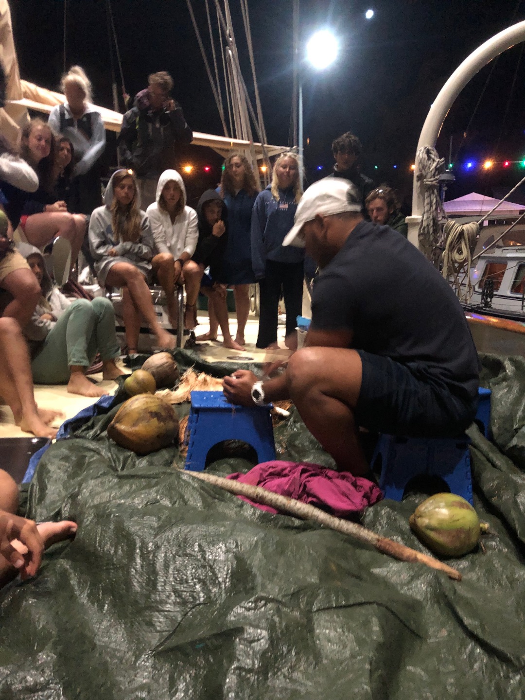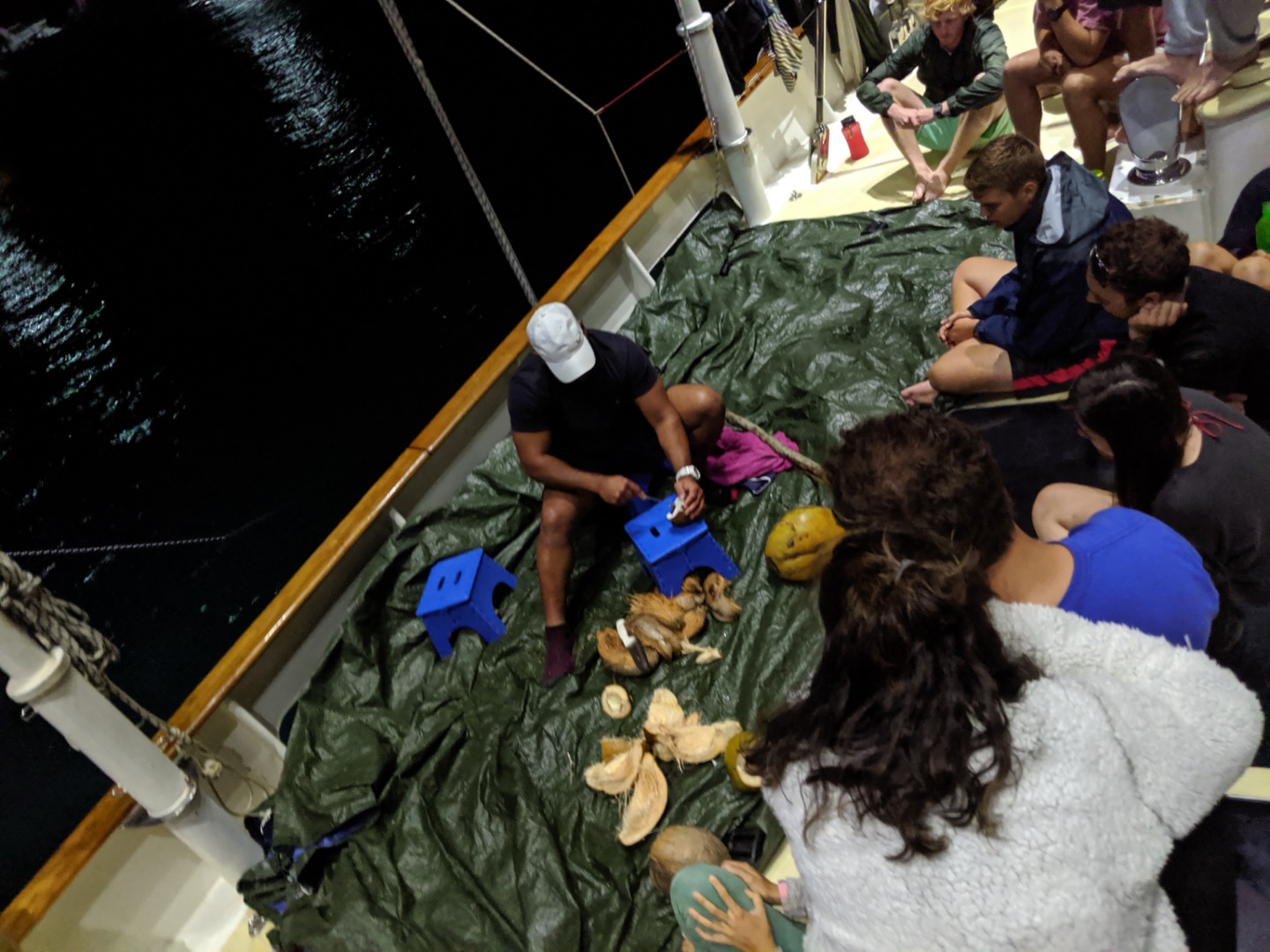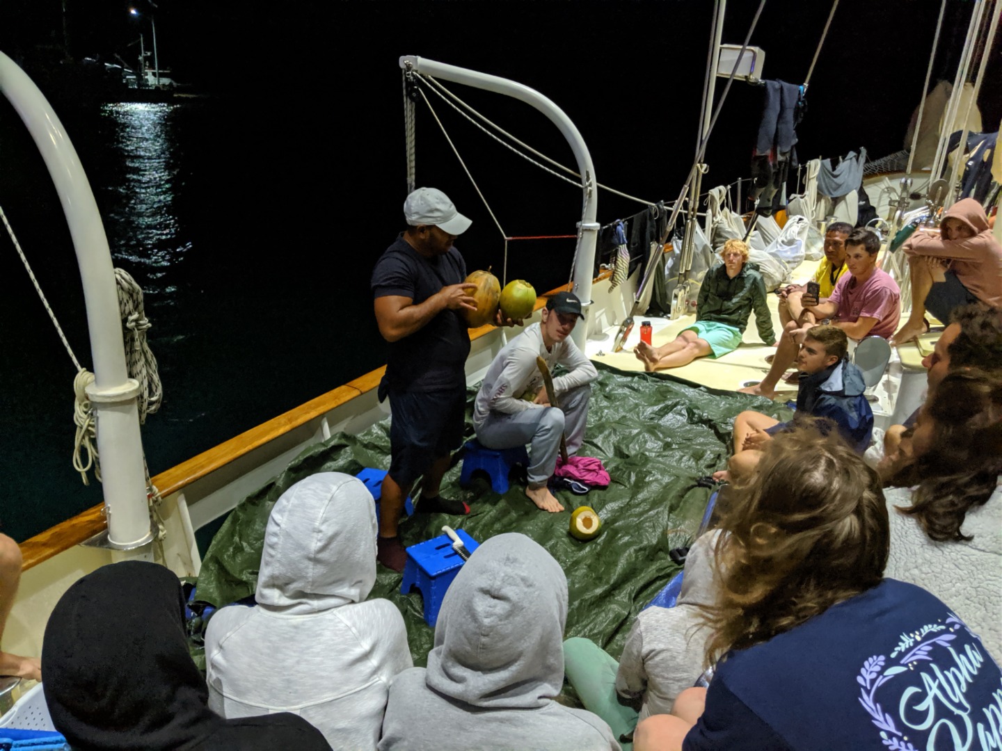 It was another excellent day here in Rarotonga. Two more dive groups went out today to dive the beautiful reef, and the visibility was incredible. The health of the reef is spectacular compared to many of the other sites I have dove over the past few years. There were some amazing swim-throughs and coral structures, and there was a myriad of reef fish tucked into the nooks and crannies. Rarotonga is a very lovely place to be. The harbor is a bit of a challenge because of how exposed to the ocean swell it is, but this deters most other boats from visiting and has therefore kept the marine environment pristine. It also has made Argo the talk of the town because we are the “big yacht” on the dock that everyone sees. The students and staff spent many hours cleaning and polishing the vessel over the past few days, and the onlookers who have stopped by have taken notice of how fine Argo looks. The gentleman who gave us the tour at Te Vara Nui the previous night came by this evening for a tour of Argo and brought some gifts of coconuts and bananas. The students and a few staff members were thrilled to learn how to safely and properly open the various species of coconut and sample the differences in the meats and waters. It was a really fun and interactive demonstration that the students got involved in. They eagerly look forward to their next shore leave, where they plan to test out their coconut opening skills, and where they will hopefully enjoy a refreshing beverage on the tranquil beach as a reward. The evening wound down with a marine biology class taught by Margaux.