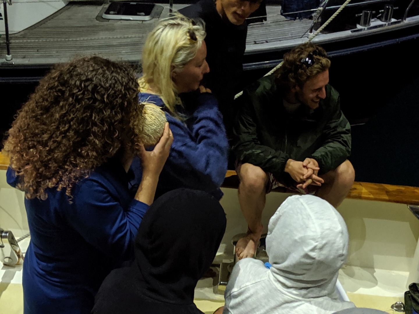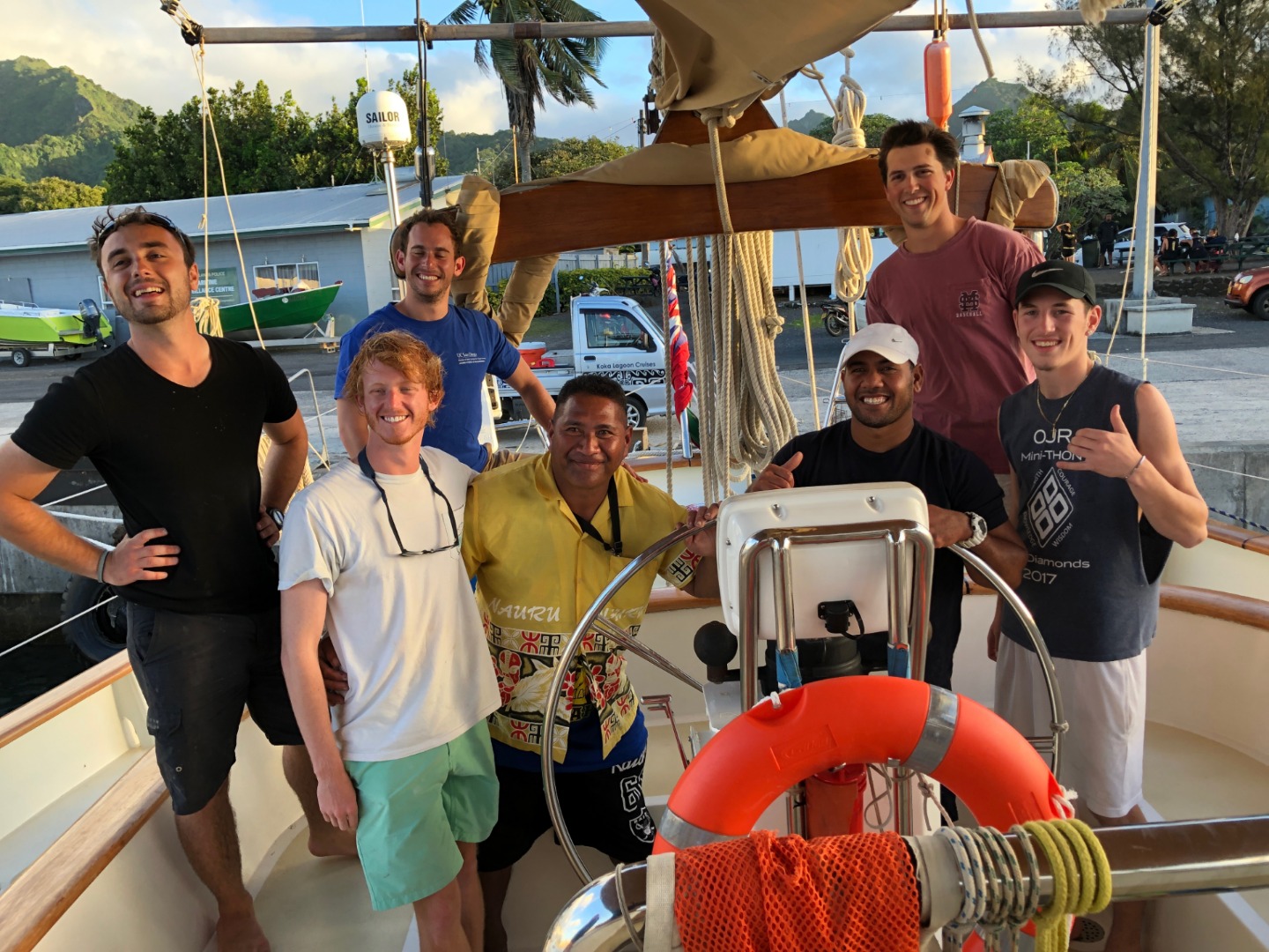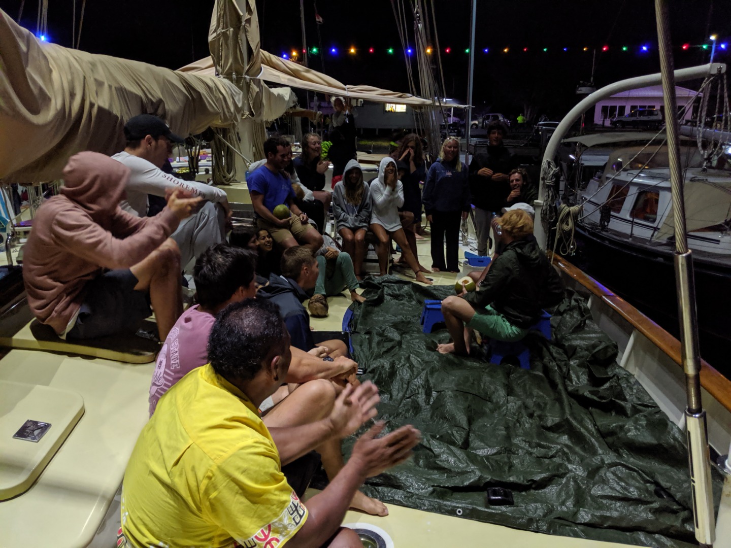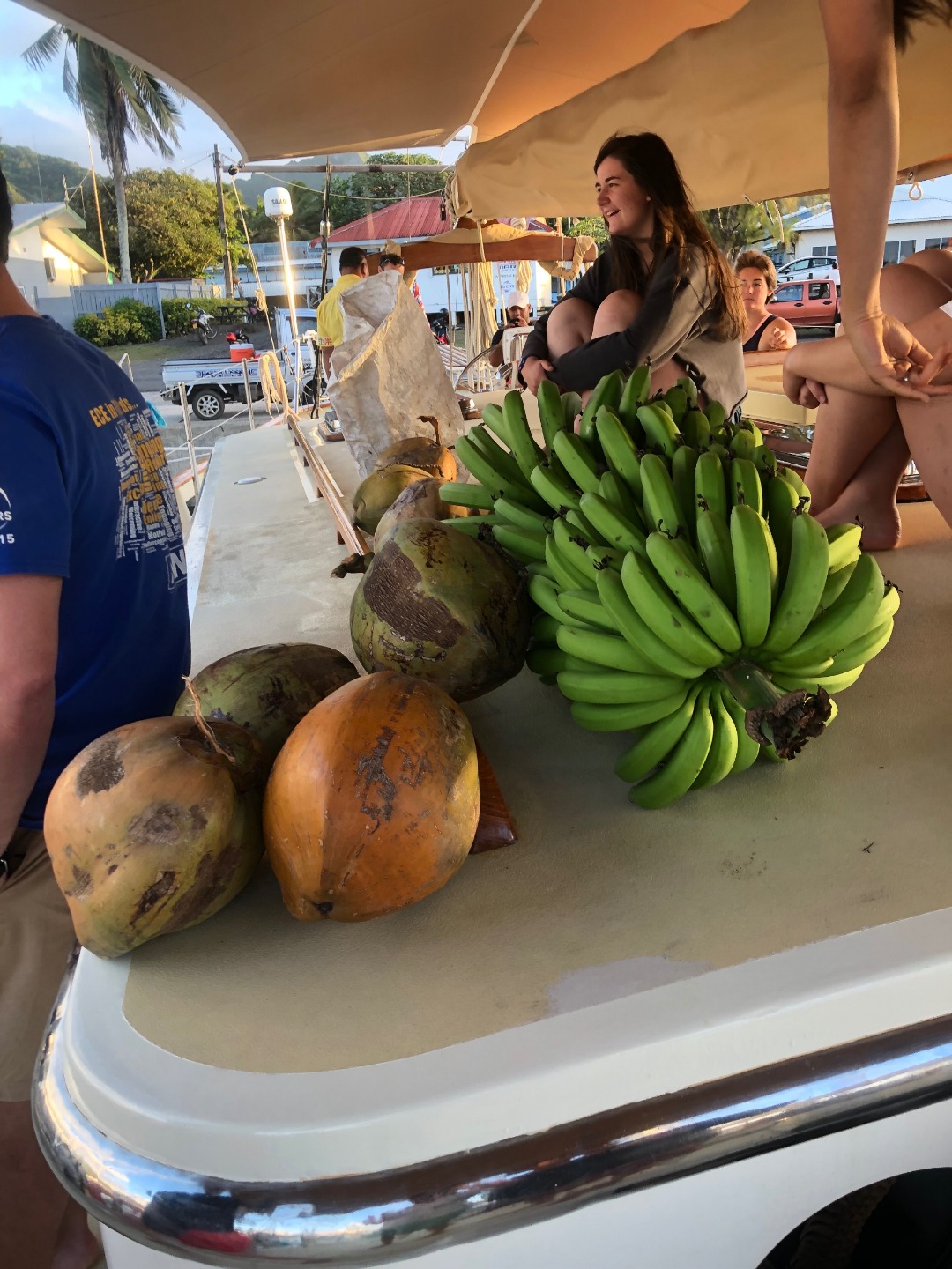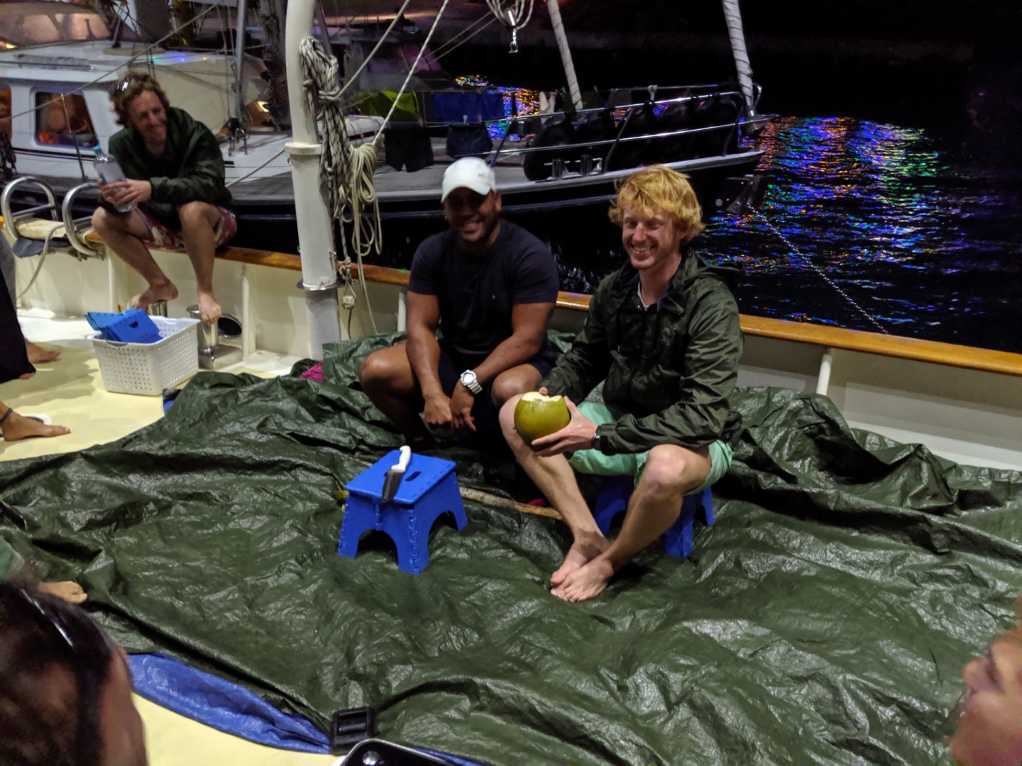 It was another excellent day here in Rarotonga. Two more dive groups went out today to dive the beautiful reef, and the visibility was incredible. The health of the reef is spectacular compared to many of the other sites I have dove over the past few years. There were some amazing swim-throughs and coral structures, and there was a myriad of reef fish tucked into the nooks and crannies. Rarotonga is a very lovely place to be. The harbor is a bit of a challenge because of how exposed to the ocean swell it is, but this deters most other boats from visiting and has therefore kept the marine environment pristine. It also has made Argo the talk of the town because we are the “big yacht” on the dock that everyone sees. The students and staff spent many hours cleaning and polishing the vessel over the past few days, and the onlookers who have stopped by have taken notice of how fine Argo looks. The gentleman who gave us the tour at Te Vara Nui the previous night came by this evening for a tour of Argo and brought some gifts of coconuts and bananas. The students and a few staff members were thrilled to learn how to safely and properly open the various species of coconut and sample the differences in the meats and waters. It was a really fun and interactive demonstration that the students got involved in. They eagerly look forward to their next shore leave, where they plan to test out their coconut opening skills, and where they will hopefully enjoy a refreshing beverage on the tranquil beach as a reward. The evening wound down with a marine biology class taught by Margaux.