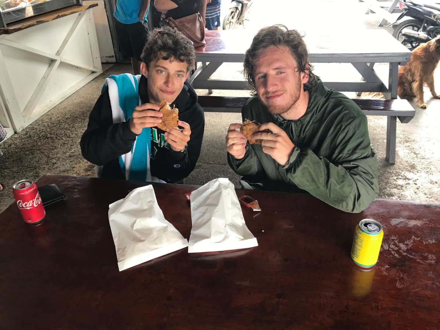 Pictured: Diving Edna’s Anchor and Coral Gardens; Evan and Henry enjoying some fried chicken during the surface interval; Evan, Henry, Maddie, and Danny at the dock during the surface interval; our guests who brought gifts of coconuts and bananas; our own personal “coconut show” onboard Argo.