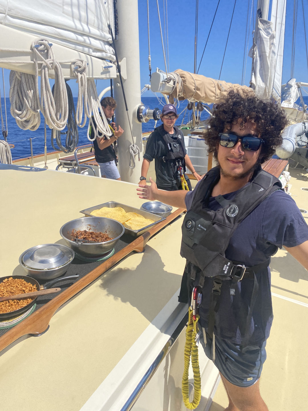 BUT we still have at least two weeks left, so no more dwelling on the daunting end date of this remarkable experience! Today was another passage routine day accompanied by sail-handling with Gabe, marvelous food from Santana, and fascinating oceanography lessons with Amanda. We are sailing through such a neat area because not only is it beautiful, but the Mediterranean Sea is considered a negative estuary. In a normal estuary, you have incoming salt water from the ocean that mixes with freshwater input from river runoff. Saltwater is denser than freshwater, and densities don’t like to mix, so the freshwater input sits on top of the salty water. In the Med, you get the opposite effect because it has such a high salinity (We have measured it to be around 40 PSU compared to the average 35 PSU). The saltiness of the Med increases its density. It causes it to sink below the Atlantic Ocean waters, which creates a unique vertical circulation, the exact opposite process that occurs in positive estuaries! SUPER FREAKIN COOL!
