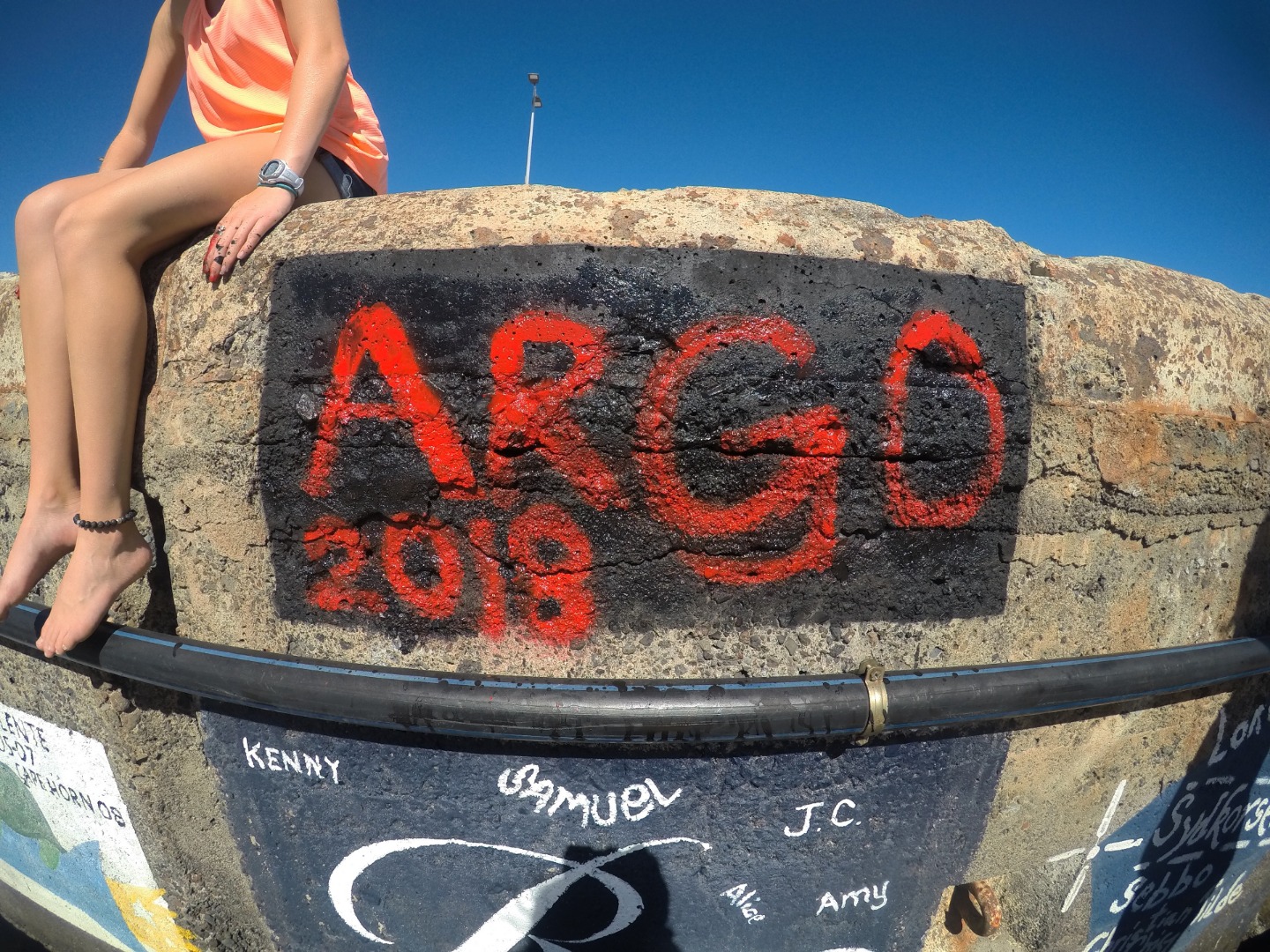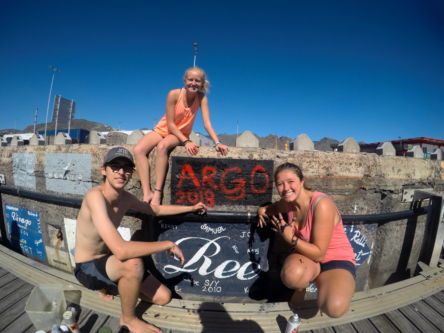 Pictured: Sunny view of Argo; Cole, Sydney, and Claire leaving our mark at the dock in Tenerife.