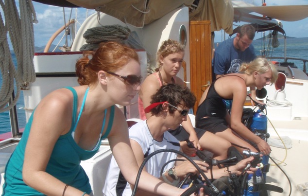 This morning was the first after a night of Anchor Watch. Each crew member had to be on deck for one hour of the night to make sure we didn’t drift. I had to wake everyone up at 7:15 for breakfast burritos. After breakfast, eight out of the ten students began a review of their scuba knowledge and proceeded to experience their first breaths underwater. The other two, myself included, had time to snorkel and swim on the sandy beach. While snorkeling, we saw starfish, stingrays, several varieties of fish (including a barracuda that followed us around), sea urchins, and corals. For lunch, we had “seared cheese,” aka grilled cheese, tomato soup, and pasta salad. The leftovers had to be thrown overboard, adding necessary nutrients to the sea.