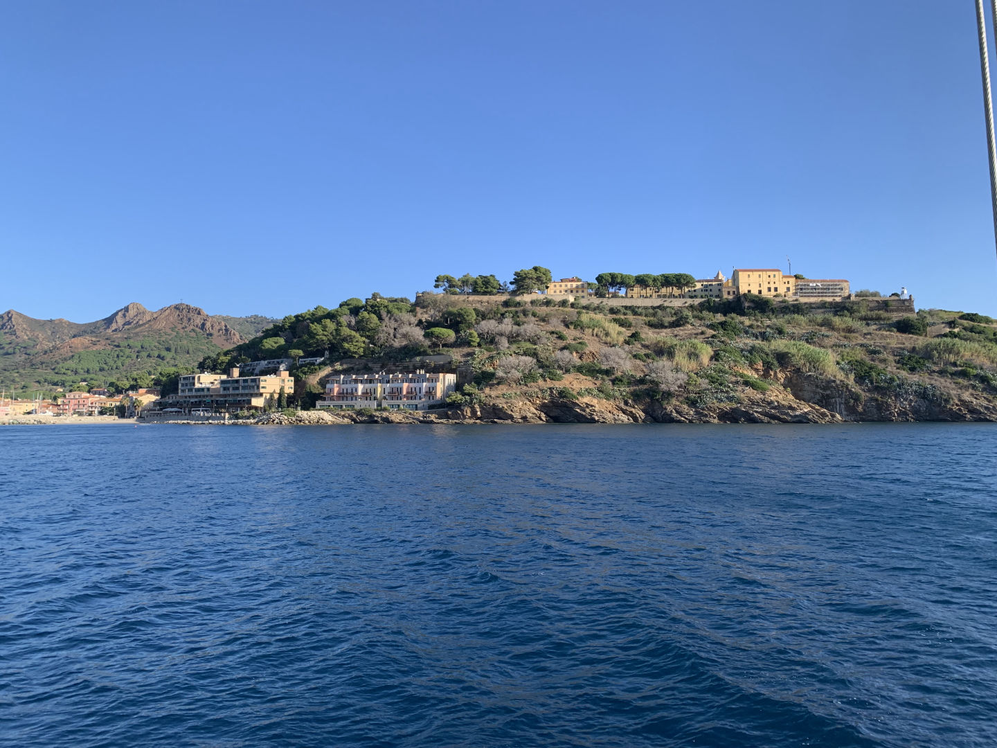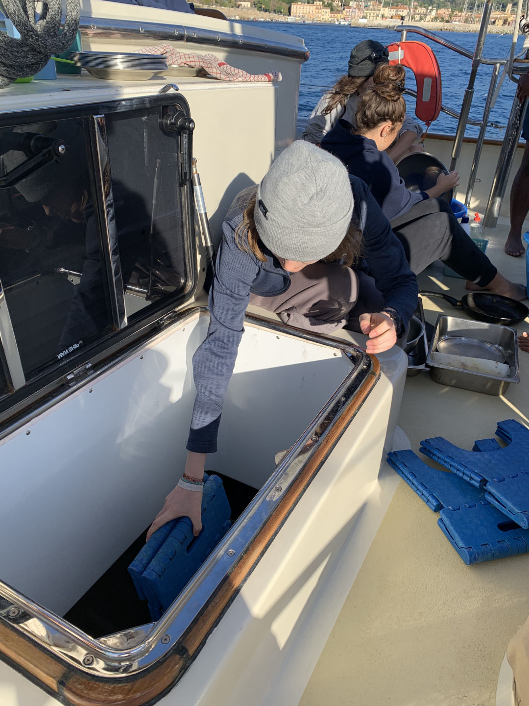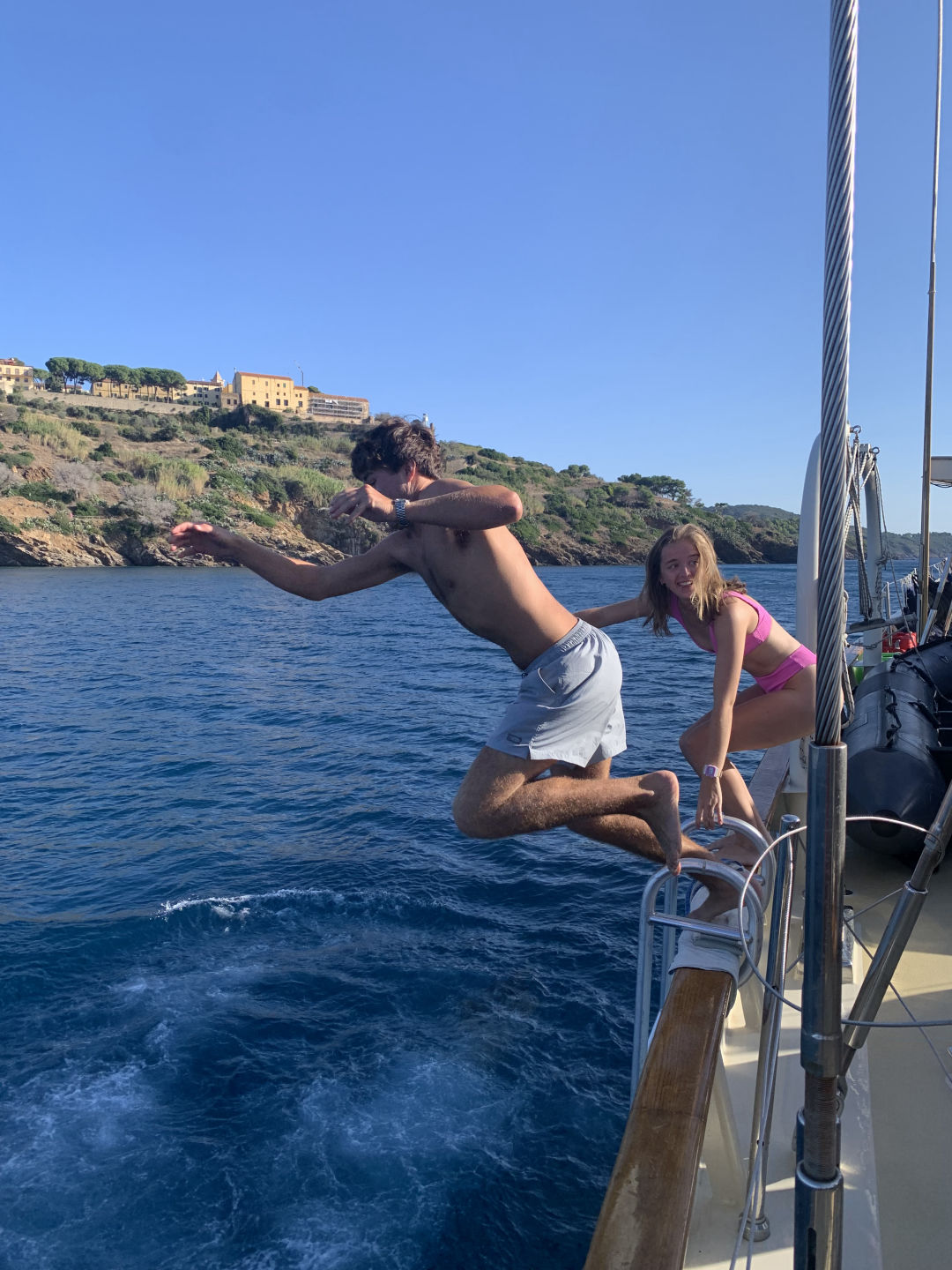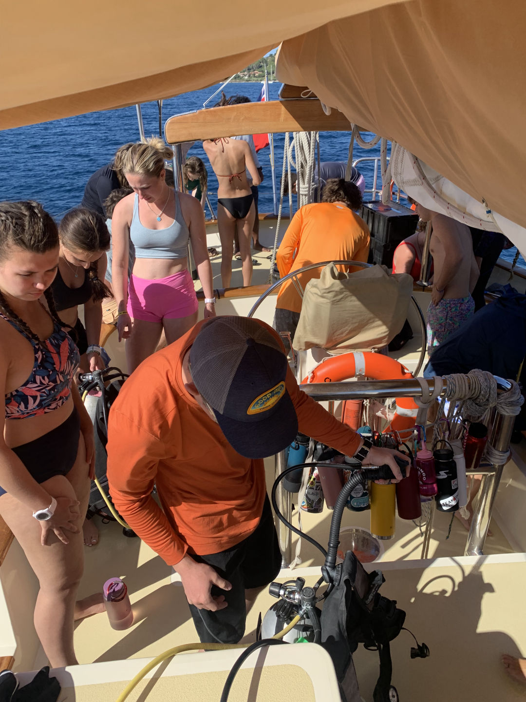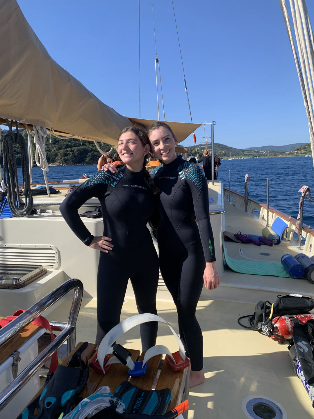 We started the day with me waking everyone up with some bird noises, which I picked out during my watch last night. After that, we had some delicious Swedish pancakes, and we got ready to do our swim test, which we were all super excited about because it was our first time jumping in the water. The water was actually really nice, even though it was kinda of cold on deck. Then, the already certified divers went on our first dive and did a check-out dive while the divers getting certified practiced putting together their dive gear. On the dive, we did some basic skills just to refresh ourselves because a bunch of us had not dove in a while. While we were diving, the non-certified divers also got to swimShoutout to Caroline for accomplishing her goal of learning to do a backflip. After lunch, we had to motor to a different part of Elba because something on Argo needed to get a part fixed on the dock. The motor was super nice and pretty. We then had our first class! It was leadership where we learned what we were going to be doing in that class. After class, we had dinner, and there was a gorgeous sunset. Some of us (me and Caroline) are also SUPER excited to have our first ocean shower tonight because we are on anchor. Overall super fun and eventful day.