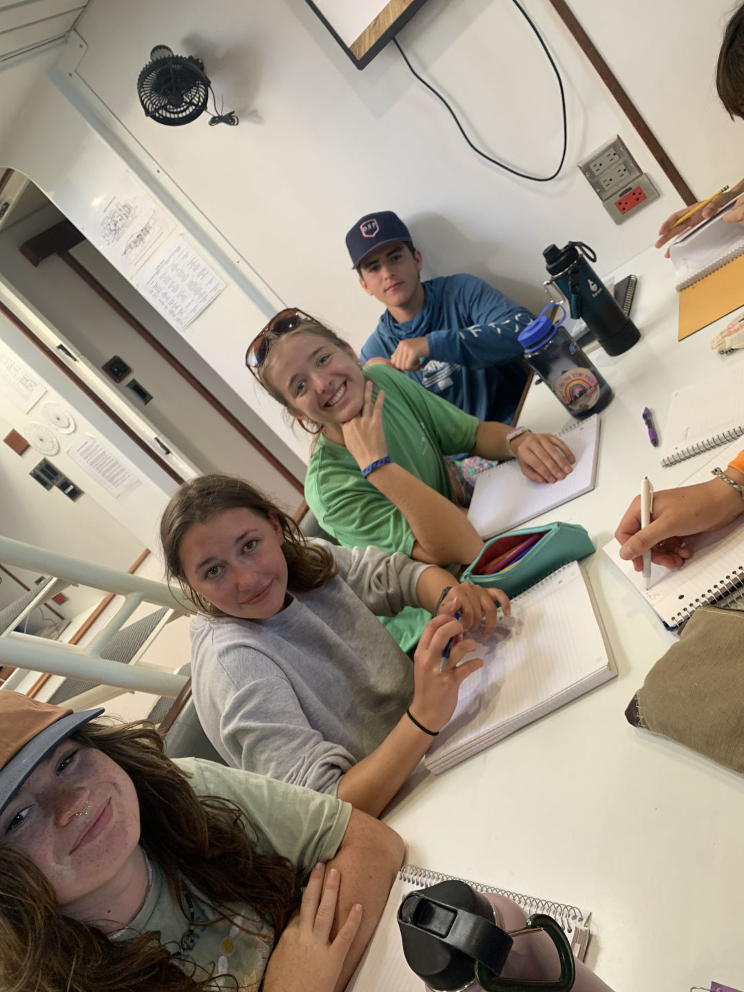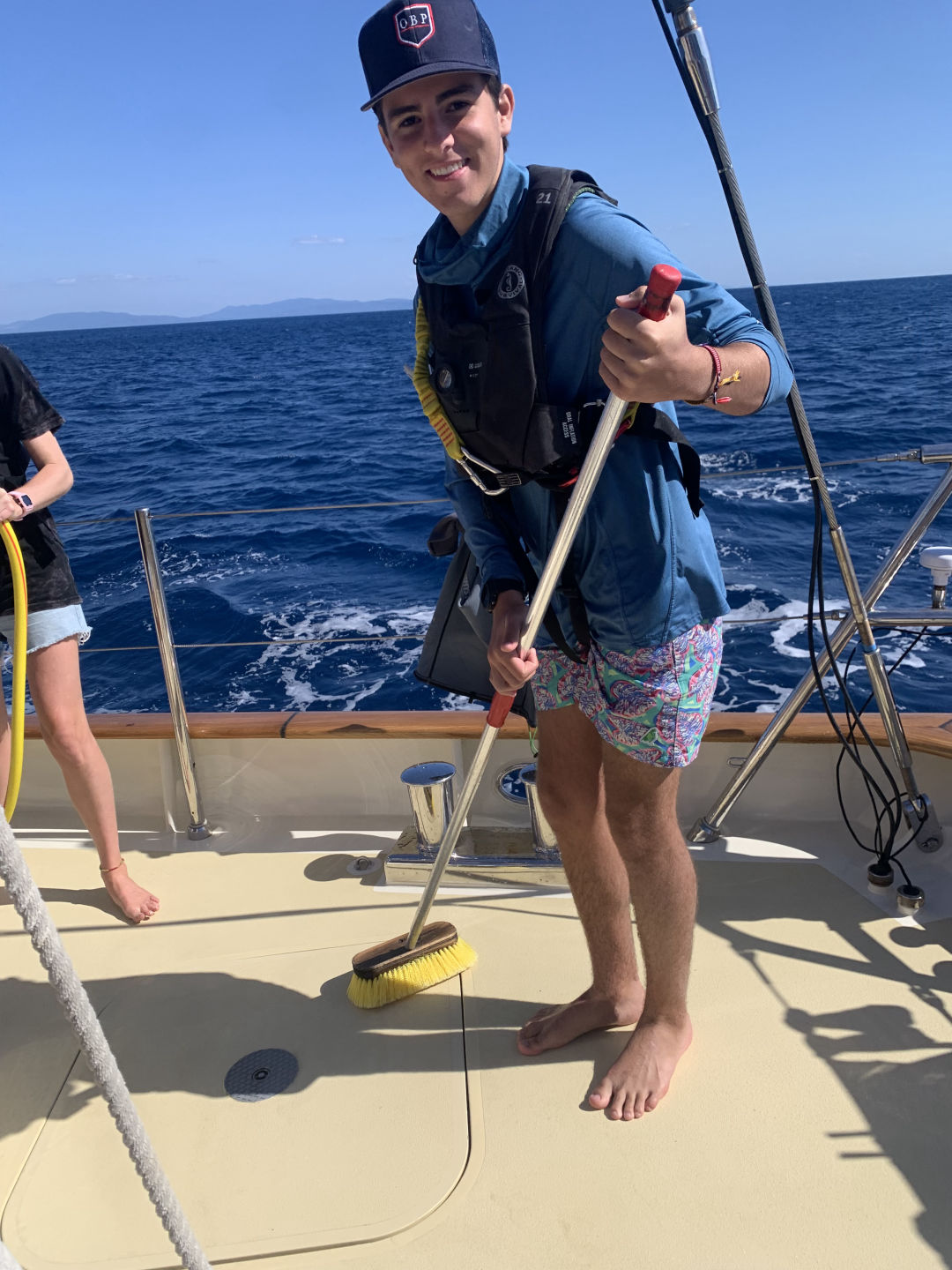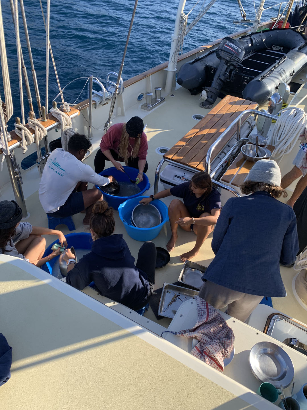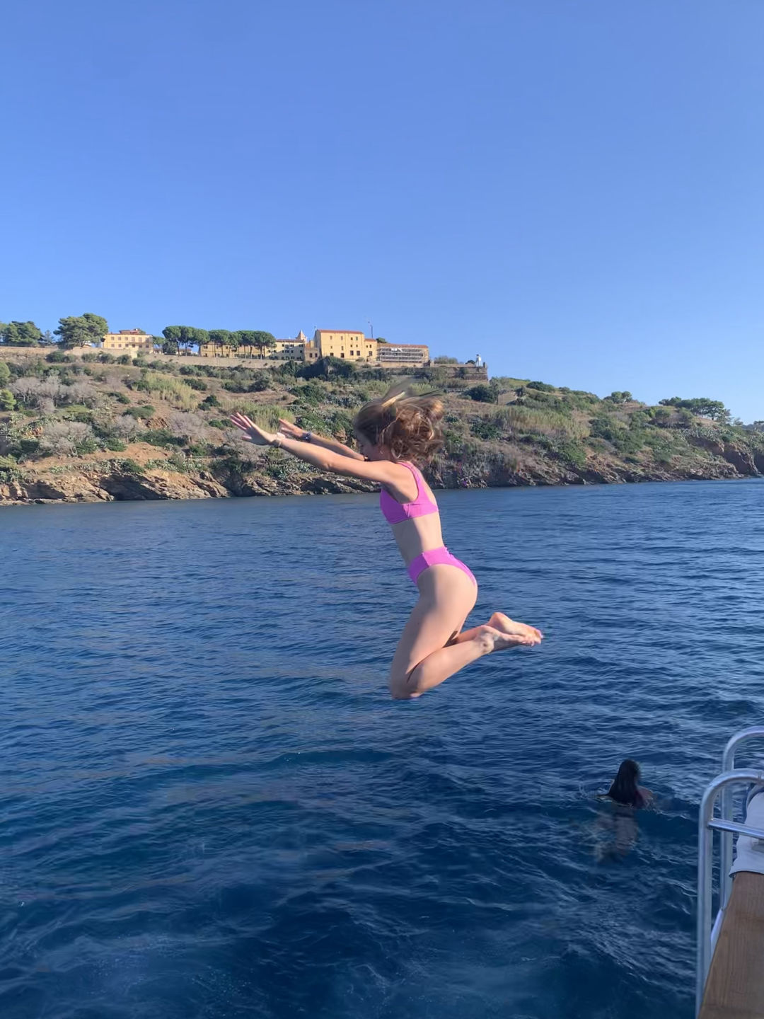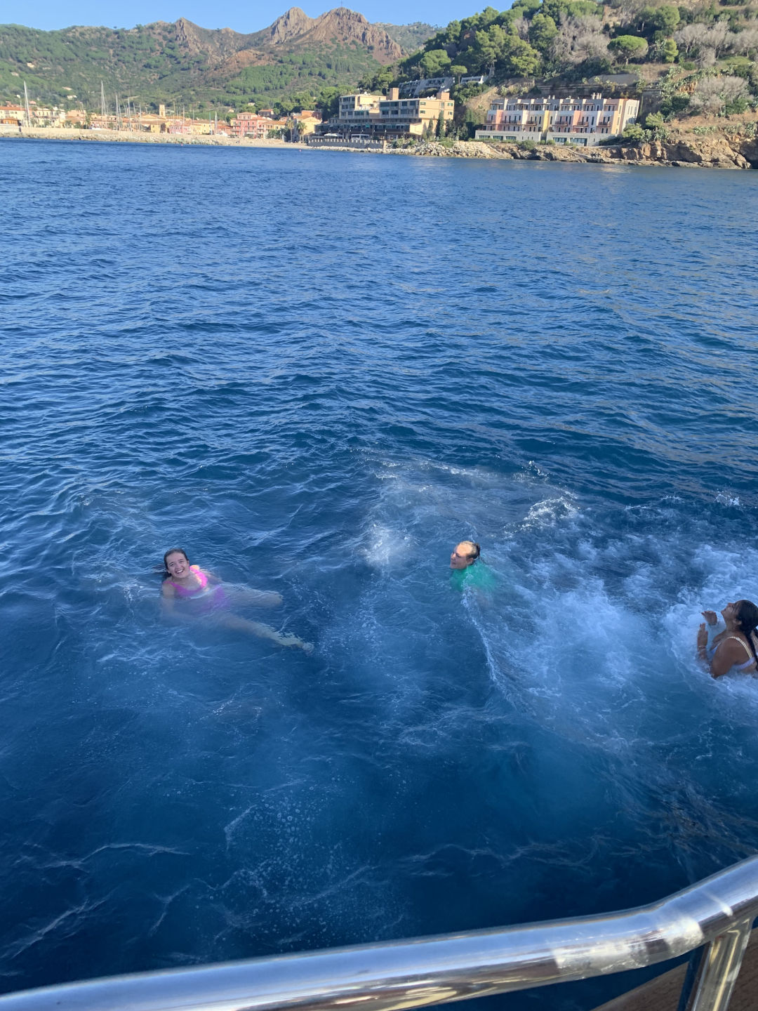 We started the day with me waking everyone up with some bird noises, which I picked out during my watch last night. After that, we had some delicious Swedish pancakes, and we got ready to do our swim test, which we were all super excited about because it was our first time jumping in the water. The water was actually really nice, even though it was kinda of cold on deck. Then, the already certified divers went on our first dive and did a check-out dive while the divers getting certified practiced putting together their dive gear. On the dive, we did some basic skills just to refresh ourselves because a bunch of us had not dove in a while. While we were diving, the non-certified divers also got to swimShoutout to Caroline for accomplishing her goal of learning to do a backflip. After lunch, we had to motor to a different part of Elba because something on Argo needed to get a part fixed on the dock. The motor was super nice and pretty. We then had our first class! It was leadership where we learned what we were going to be doing in that class. After class, we had dinner, and there was a gorgeous sunset. Some of us (me and Caroline) are also SUPER excited to have our first ocean shower tonight because we are on anchor. Overall super fun and eventful day.