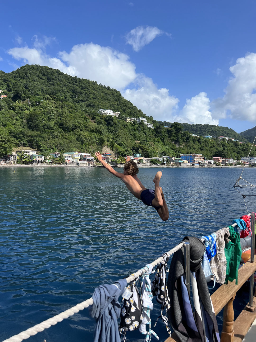 The crew had an early start to our morning, as we were moving from Portsmouth to Roseau bright and early. Those who were not already awake were awoken by the sound of the anchor chain being raised at the ripe hour of 6:30 am! Unfortunately for those who tried to savor those last 30 minutes of sleep, I made my way around the boat, waking everyone else up. Chia seed pudding ala Steph was then served for breakfast. After a bit of motoring and lots of schoolwork time, we arrived in Roseau. Lunch consisted of black bean burgers and fries, filling the crew up before another wonderful leadership class led by Kate. Following the post-leadership swim, those working for their EFR certification had their last class before the exam! As class dispersed, we heard the rain start. Downpour. Absolutely no surfaces left un-drenched. It didn’t matter much, though, as one by one, we all cannonballed into the sea. Dinner shortly followed, a wonderful curry with the most amazing homemade naan EVER! After dinner, the advanced open water class has its very last knowledge review before our advanced certification!