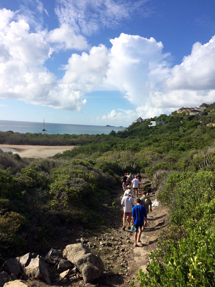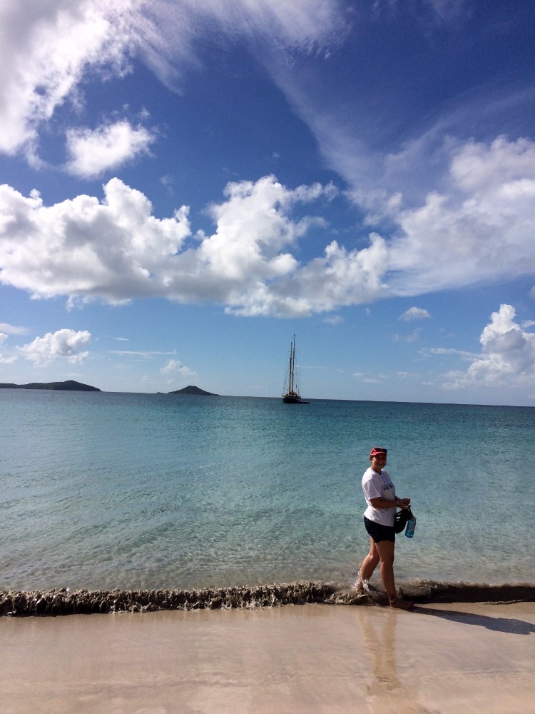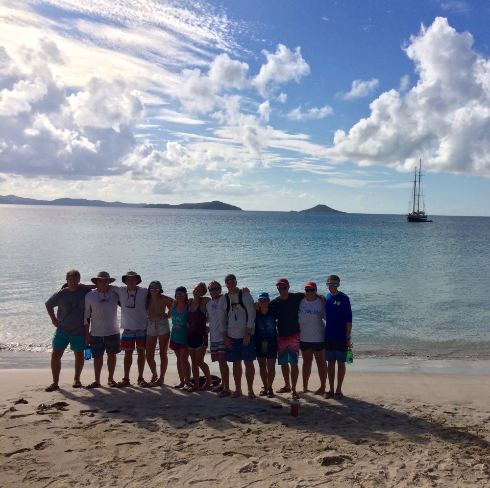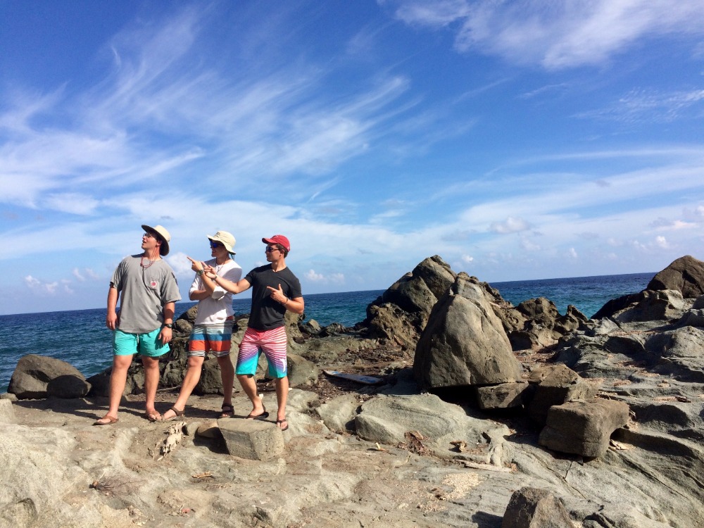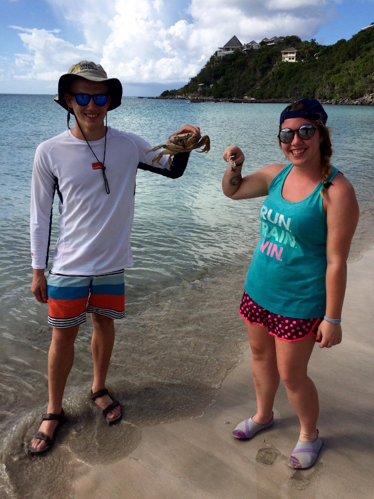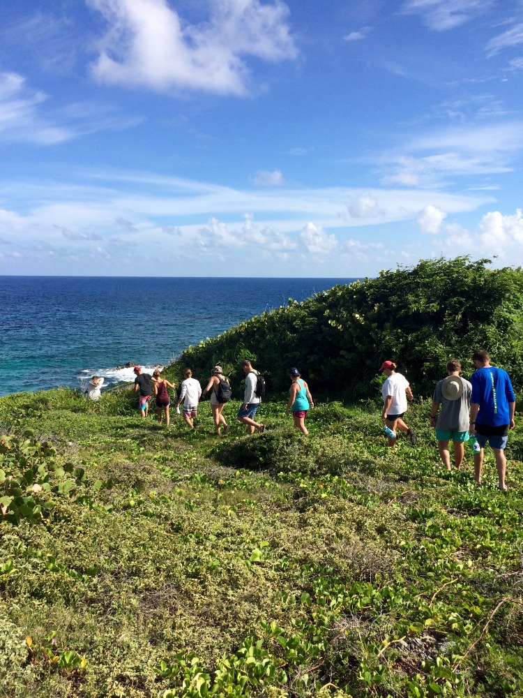 Post-dive table practice, we loaded into the dinghies and went to the nearby sandy beach, something we hadn’t experienced since starting the voyage. Once there, we walked along the beach looking for interesting objects. Among the twelve of us, we found crab carcasses, small pieces of coral, and bits of trash. A ten-minute hike to the other side of the island resulted in our arrival at a beach vastly different from the first. We were now on the windward side of the island, as opposed to where we started on the leeward side, which had large rocks and low-lying shrubbery as well as much more wave action. Again, we walked around looking for interesting objects and were surprised to find a very different collection of items, including large chunks of coral, shells, and driftwood. Interestingly enough, the vast difference between these two beaches is simply due to how the wind hits each side of the island.