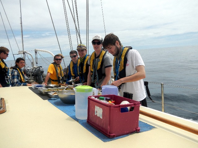 A special hello to all those who are reading this blog. You obviously really care about your associate’s well-being. The stars were absolutely incredible last night. Seeing the Milky Way with a clear sky, free from light pollution, really puts your life into perspective. The sea was calm, and the sky was partly cloudy. This weather allowed us to enjoy our classes without getting seasick. Today we discussed the main influences in our life, did homework, learned about the ecosystem, and did watch. A lot of readers probably think that it is very difficult to get used to our 4 hours on watch and 8 hours off watch schedule, but it’s not. My watch team actually prefers the 12 am-4 am shift the most. During these hours, we save most of our snacks by not being really hungry. Today we discovered that from 8 pm-12 am. There is a team of pirates that steals our food and puts it in our bellies. They are called the Deadly Watch Munchies. Hopefully, we will catch these pirates, but for now, we have enough snacks to feed them.