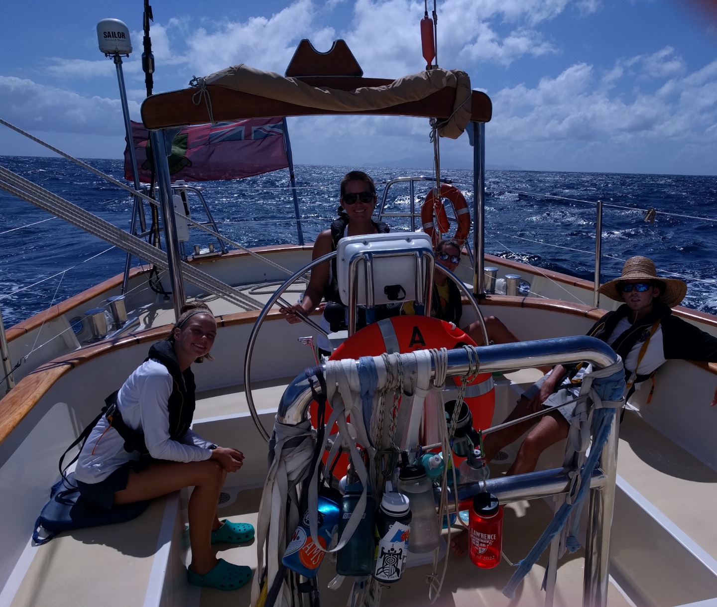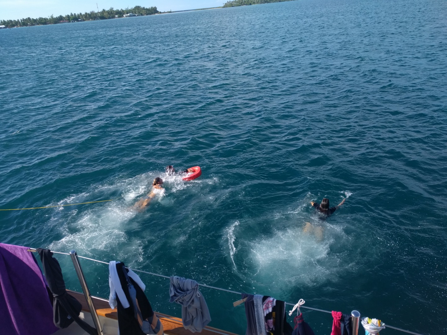 Jack, Alexa, and Amanda under sail from the passage into the Atoll