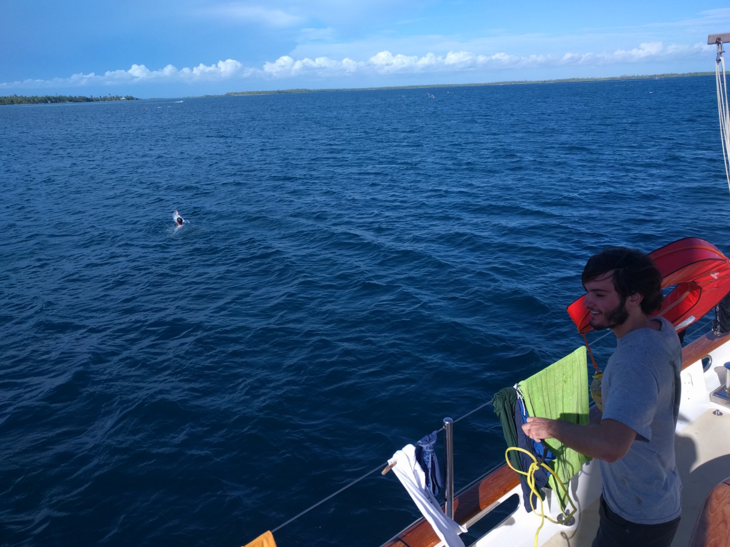 Seby attempting to throw a floatation device to a panicked Tim in the distance for rescue practice