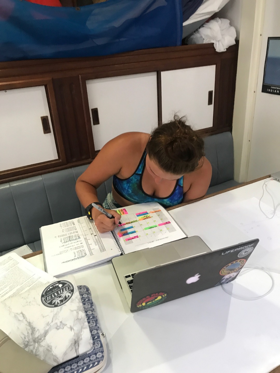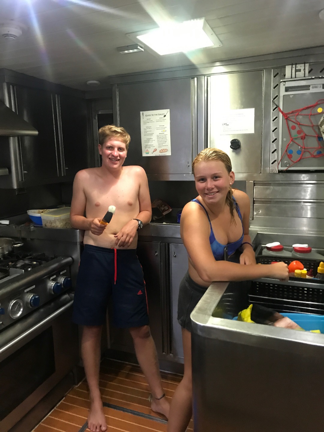 Today was the last day in the first half of our time on Argo, as tomorrow is our halfway day. Watch team 2 enjoyed a beautiful sunrise while the rest of us slept, and some of us woke up to a wonderful lunch prepared by Mara, Johnluc, and George. We have now switched to the 2nd chart for plotting during watch, which is really wonderful because it has Mauritius on it, so we can see how close we’re getting much more easily. After lunch, we had a Leadership class, where Tina had Carolyn come in and teach us about conflict resolution. It was a very interesting class, and it was very fun watching Carolyn and Tina pretend to be roommates fighting as we tried to solve it. After Leadership, we had a mandatory study hall for our Oceanography midterm that is coming up tomorrow, which was greatly appreciated by all. Showers were an adventure today, and we had fun doing bucket showers round two, courtesy of Jack and Grace, because there was an issue with the shower pump. The chefs worked tirelessly to make delicious enchiladas for dinner and chocolate chip cookies for dessert, a rare treat. After a beautiful sunset, another day on Argo is finished, but another night has just begun.