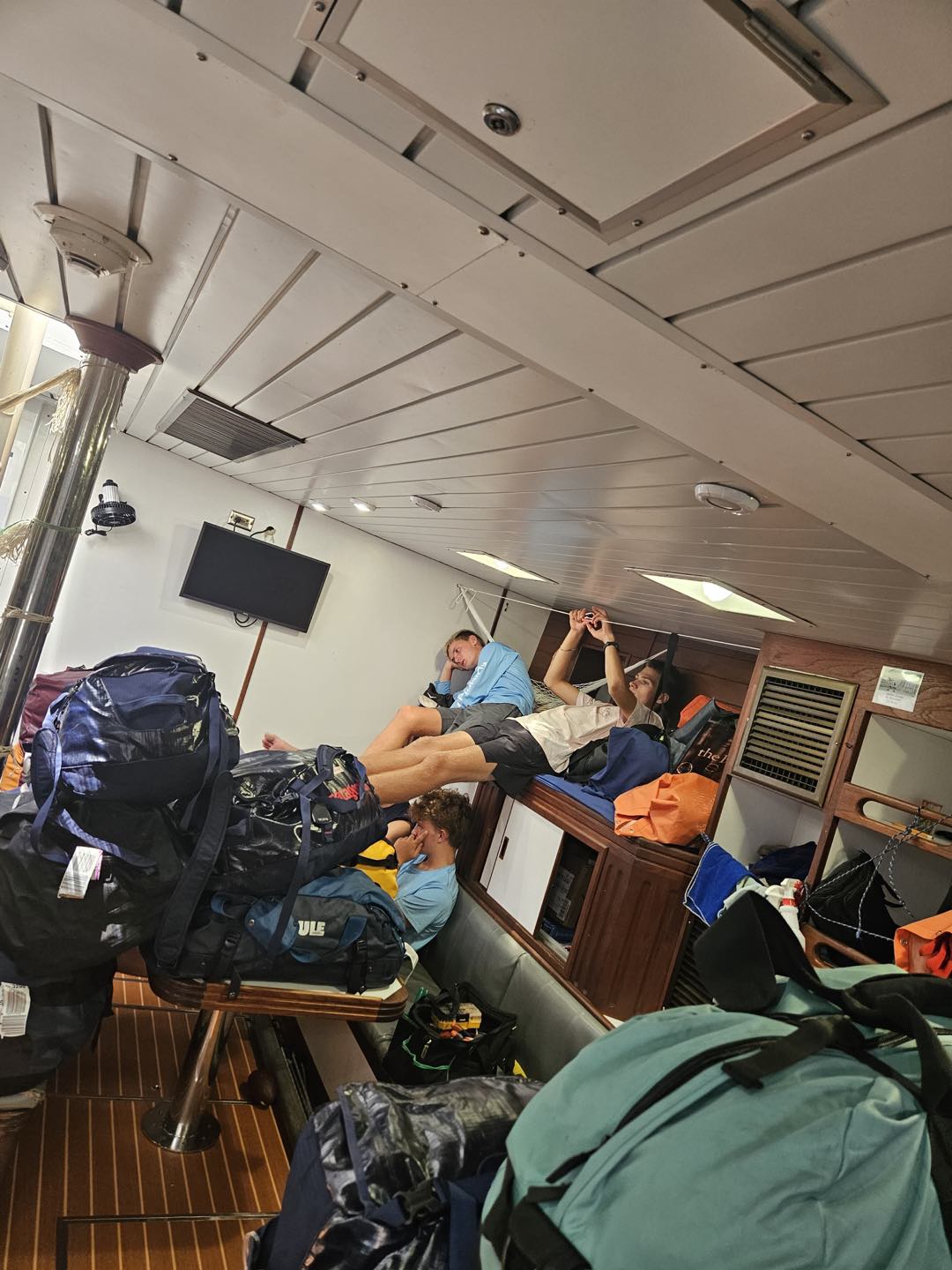 Breakfast this morning was a quick one of yogurt and granola, pulled together by Payton and his sous chefs, Jack and Greyson. Breakfast wrapped up, and we broke into our final big clean of Argo. Shane and Zac led the team of Avery, Logan, Brady, Sadie, Ella, Brig, Payton, and Dylan to clean the deck while everyone else was down below finishing packing and doing a final galley and head clean. Emily and Emma were our trash masters today, so they had the big job of removing everyone’s final snack trash, as there seemed to be a lot of wrappers stored away to try and get out of trashmastering along the way. As the morning rolled by, Argo started to look like she did 39 days ago again. Suitcases packed and ready to go stacked in the saloon, bunks tidy without the last week of laundry sitting at the foot, and the heads nice and clean.