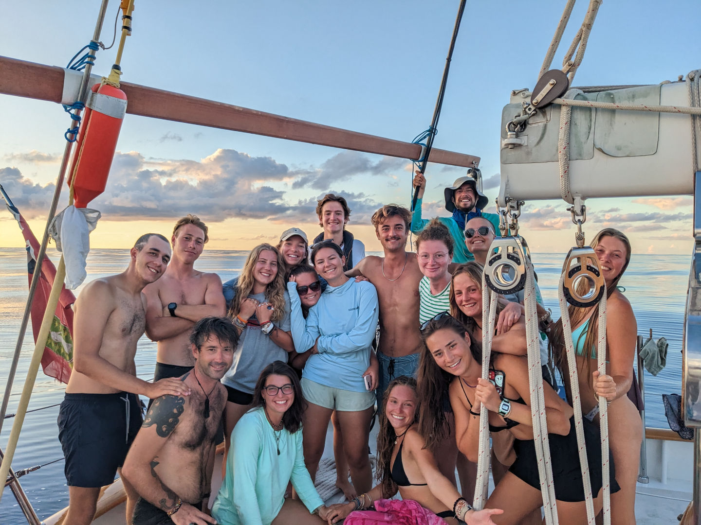 As the crew learned tricks and spells, beads of sweat poured down their faces, feathers, and scales. Alas! They were revived with a hop, skip, and jump into the cool Pacific Ocean. We swam and swam and swam, cooling our bodies and rejoicing. In the meantime, head chef and merman Ben was cooking up a storm in the galley with Charlie the elf and Miles the wise ginger. The pizza dough was thrown and sometimes not caught. The pizzas were sauced and decorated with everything from cinnamon to mushrooms. The creatures dined and gobbled while enjoying one of the most magical sunsets many have laid their eyes on. As the sun disappeared, they flew and hobbled into clean up. There was a short period of the dark sky until a red moon rose, sweetly surprising us all. The creatures were tired and ready to relax. All those not on watch made their way back to their homes. They will continue this cycle until they arrive at the end of the rainbow (see you soon, Tahiti).