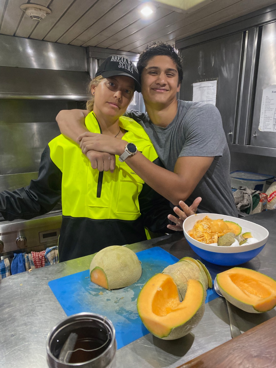 1. Navarre and Carolyn cutting cantaloupe for breakfast