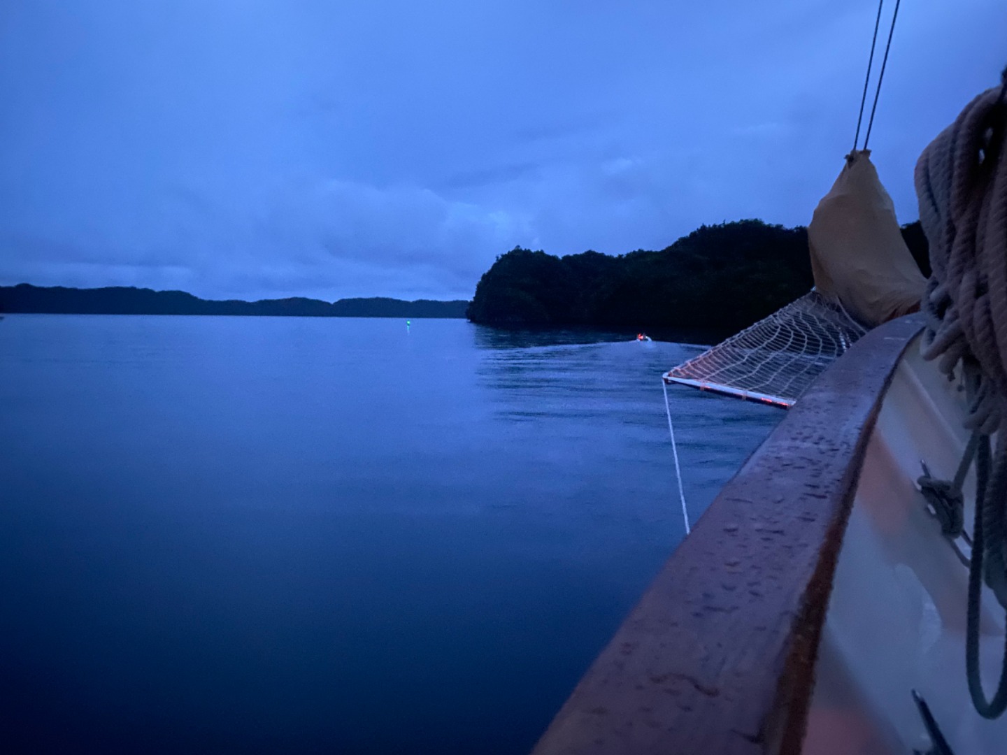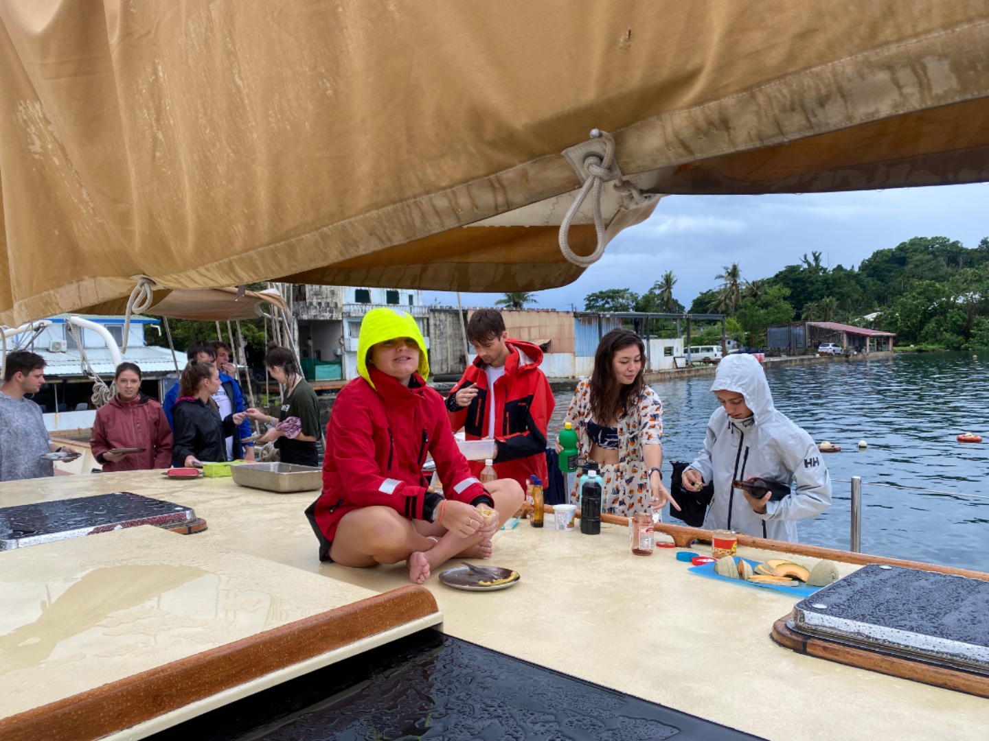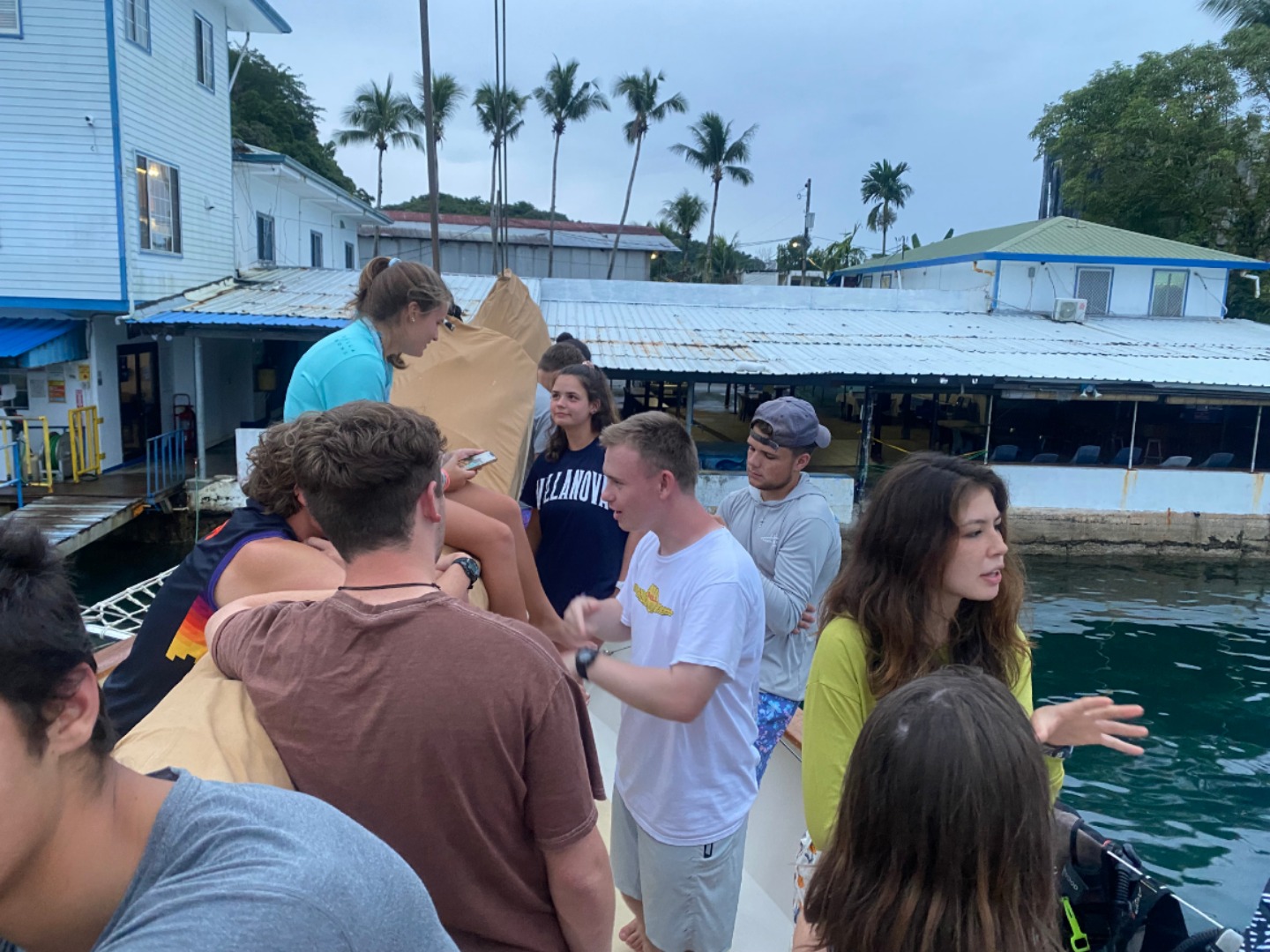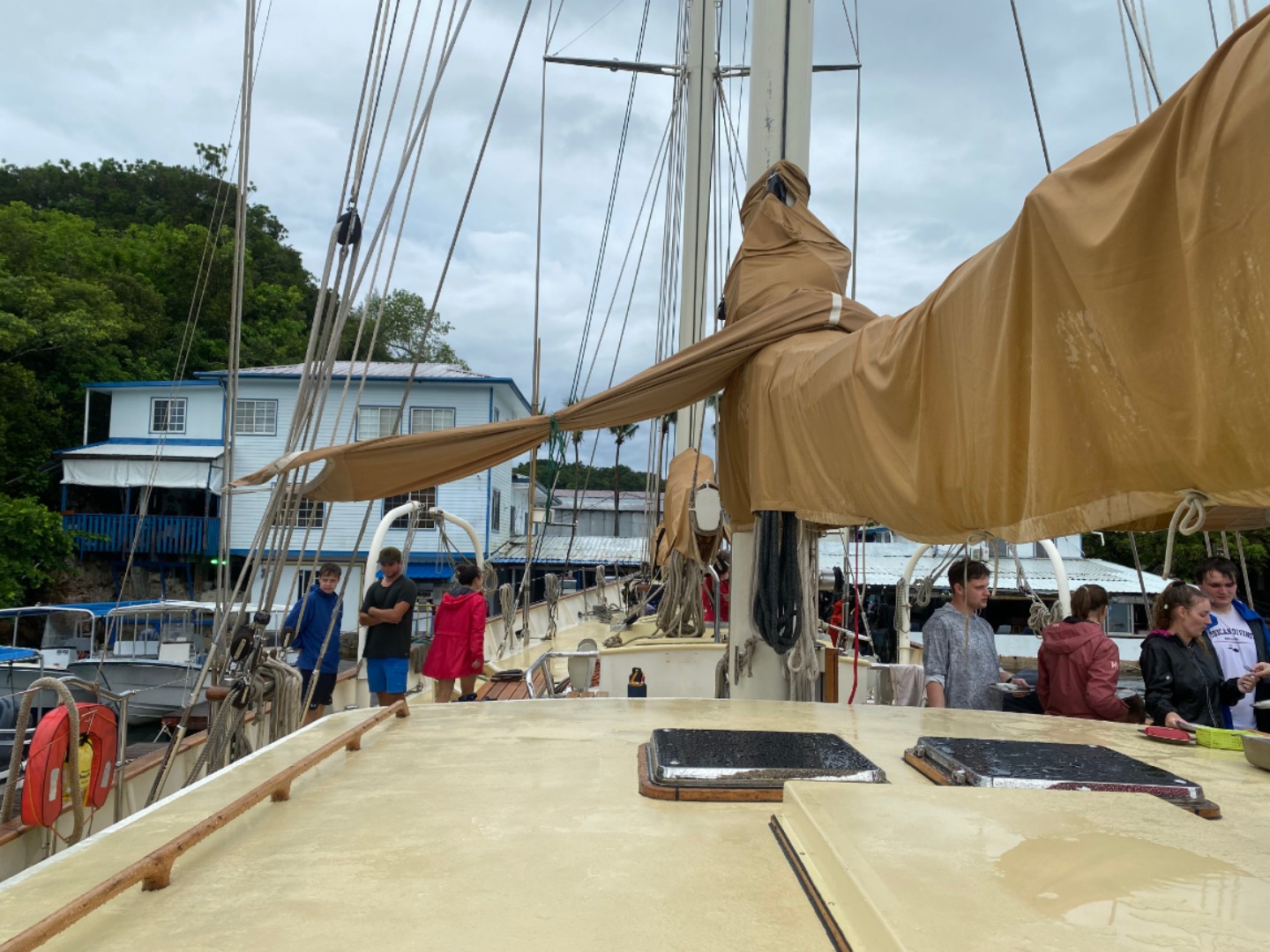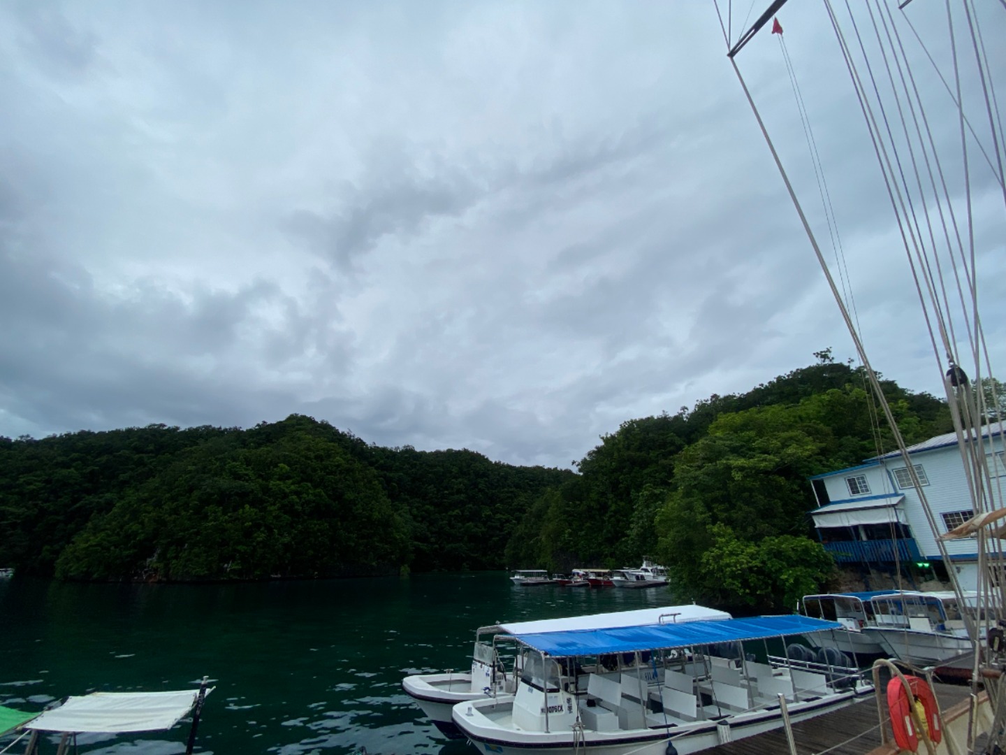 This morning was definitely the most eventful morning we’ve had since arrival. At around 7:15 am, we began the process of leaving the area of the dock that we were anchored at to get fuel from Sam’s Tours. The whole process of moving Argo is very detailed and lengthy and takes the whole crew to accomplish. My job was to be the relay between Tim, our captain, and Amanda C., our program manager, as she was on a dinghy and couldn’t communicate directly with Tim. Of course, as we are beginning our first move of Argo, it began POURING and continued to pour on us the entire time without letting up until we had finally completed the move and successfully docked at Sam’s. We then finally ate our breakfast which was crepes made by Tim, Rykleigh, and Will. We had some free time after breakfast, and then we convened in the salon for our “intro to academics,” which prepared us for taking classes on a boat without the internet (so weird). After that, we had Greek salad for lunch (not my fav). After lunch, we got to listen to our new friend, Matt, who taught us a lot about Palau’s history and interesting information. I really enjoyed his talk. We then began to dive into the classes that we will be taking on board this semester! I am especially excited about Marine Biology with Carolyn and getting to learn more about the marine life that is surrounding us for the next three months! We had some free time after that, and a few of us made some friendship bracelets and got to talk about our pets and families, which was pretty cool! Then we got to move Argo off the dock and out into the bay a little bit, which was SUPER COOL. Since we are now out at anchor, our anchor watch shifts start tonight. Overall, we had a pretty awesome day, and I can’t wait to continue experiencing new things with my new family!