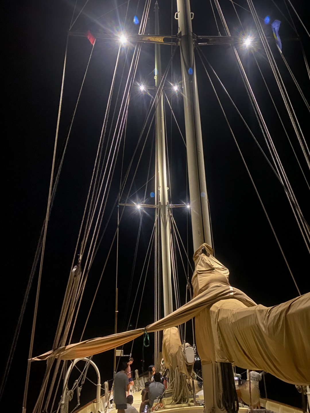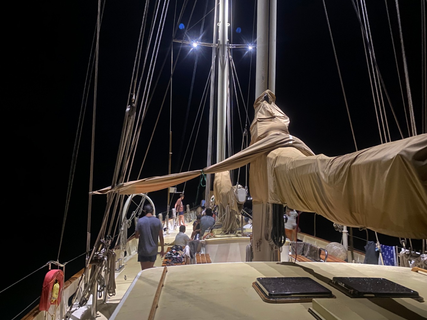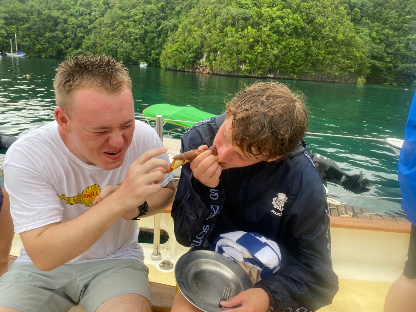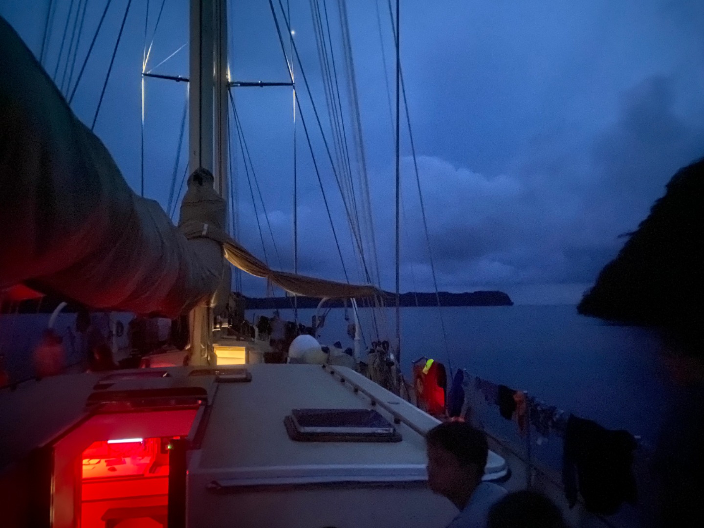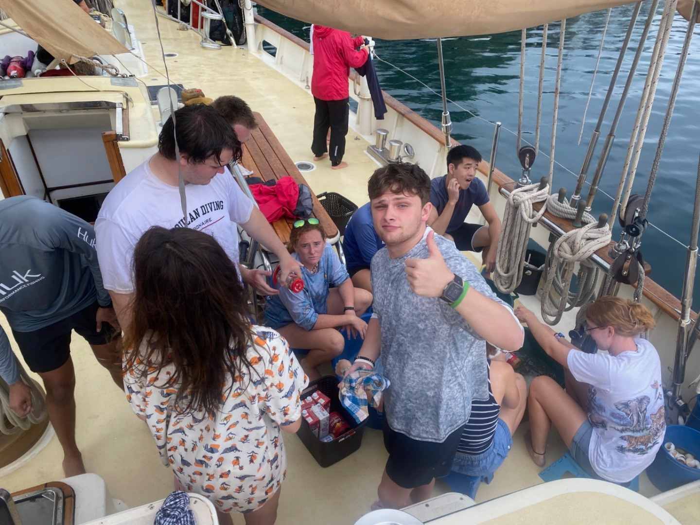 This morning was definitely the most eventful morning we’ve had since arrival. At around 7:15 am, we began the process of leaving the area of the dock that we were anchored at to get fuel from Sam’s Tours. The whole process of moving Argo is very detailed and lengthy and takes the whole crew to accomplish. My job was to be the relay between Tim, our captain, and Amanda C., our program manager, as she was on a dinghy and couldn’t communicate directly with Tim. Of course, as we are beginning our first move of Argo, it began POURING and continued to pour on us the entire time without letting up until we had finally completed the move and successfully docked at Sam’s. We then finally ate our breakfast which was crepes made by Tim, Rykleigh, and Will. We had some free time after breakfast, and then we convened in the salon for our “intro to academics,” which prepared us for taking classes on a boat without the internet (so weird). After that, we had Greek salad for lunch (not my fav). After lunch, we got to listen to our new friend, Matt, who taught us a lot about Palau’s history and interesting information. I really enjoyed his talk. We then began to dive into the classes that we will be taking on board this semester! I am especially excited about Marine Biology with Carolyn and getting to learn more about the marine life that is surrounding us for the next three months! We had some free time after that, and a few of us made some friendship bracelets and got to talk about our pets and families, which was pretty cool! Then we got to move Argo off the dock and out into the bay a little bit, which was SUPER COOL. Since we are now out at anchor, our anchor watch shifts start tonight. Overall, we had a pretty awesome day, and I can’t wait to continue experiencing new things with my new family!