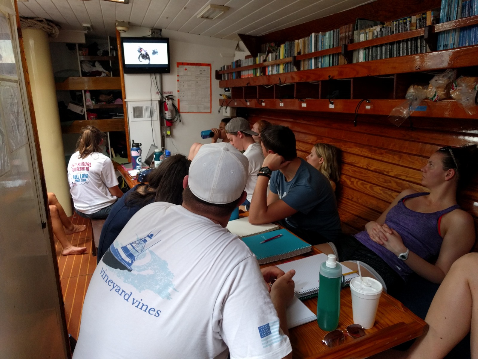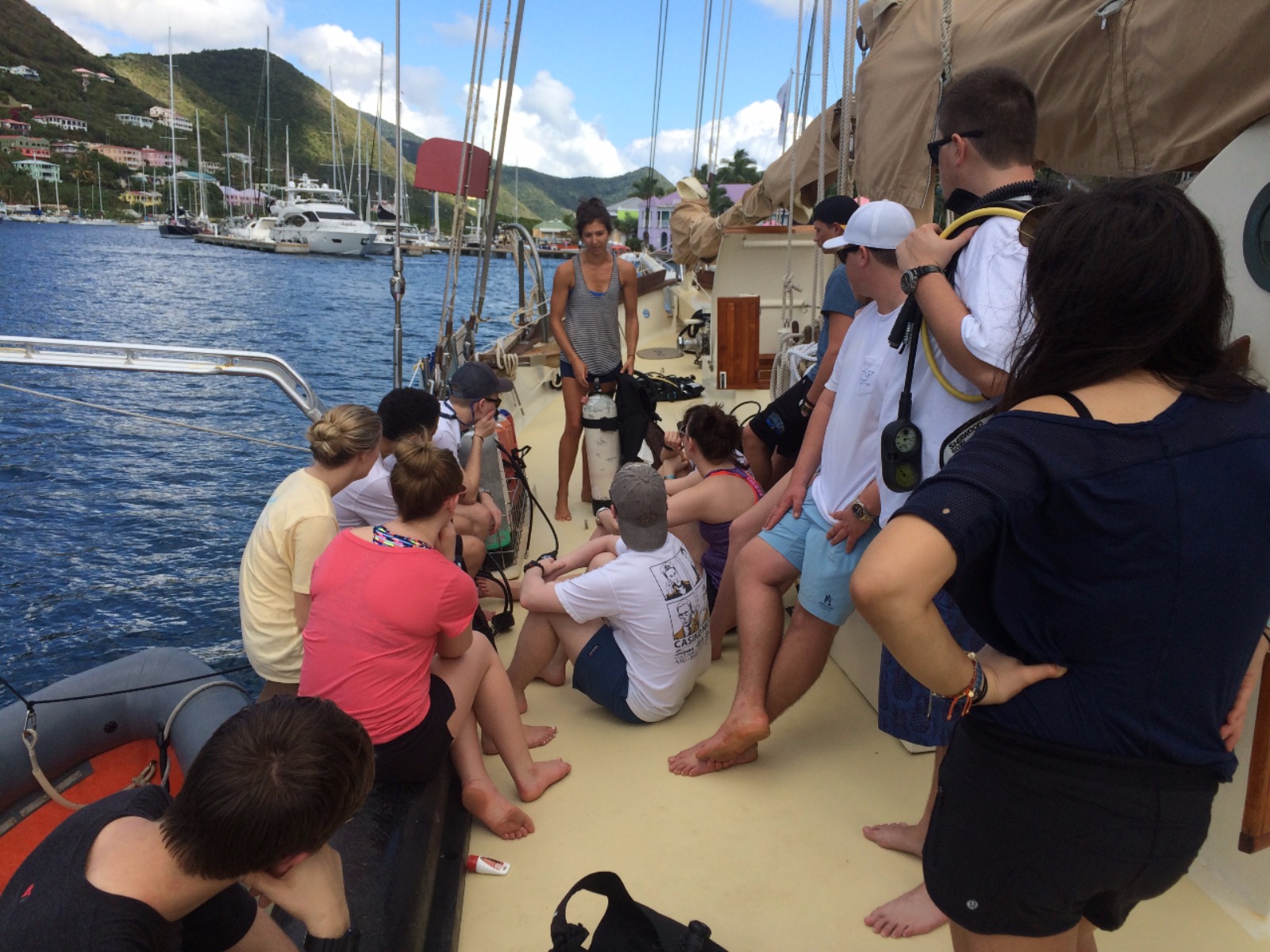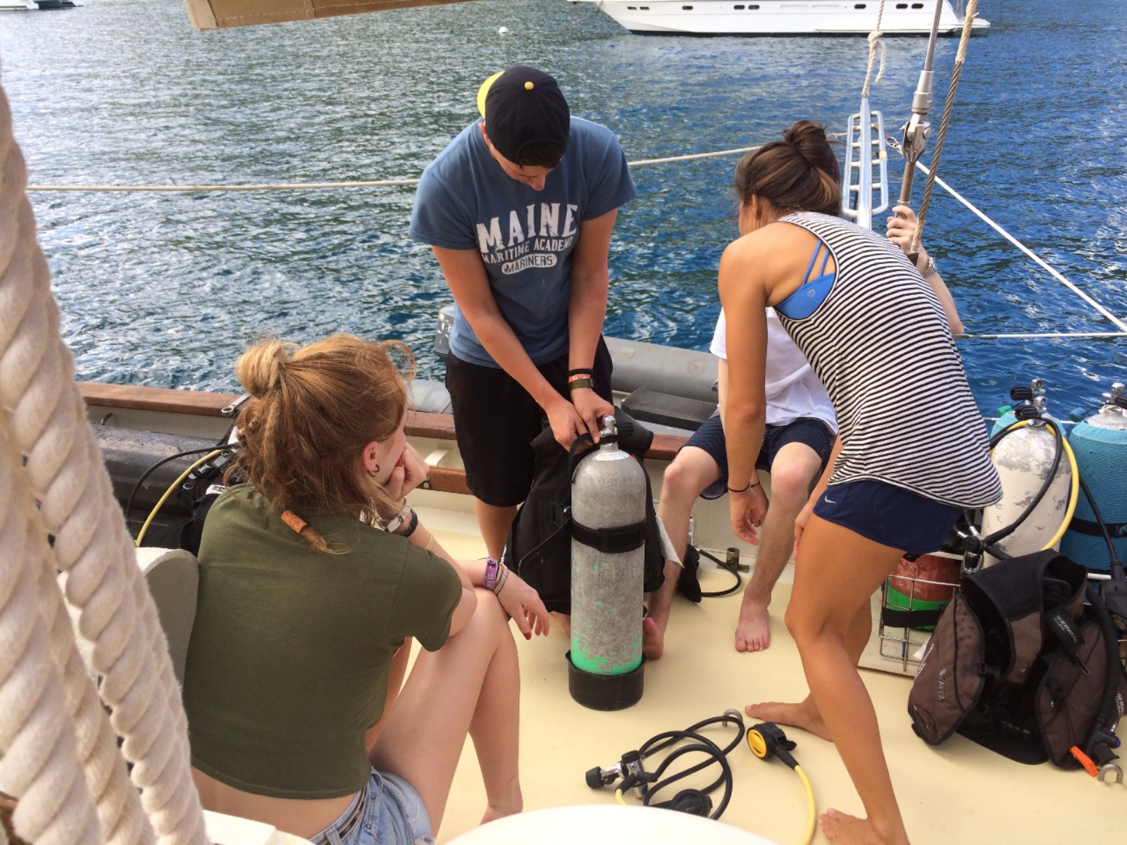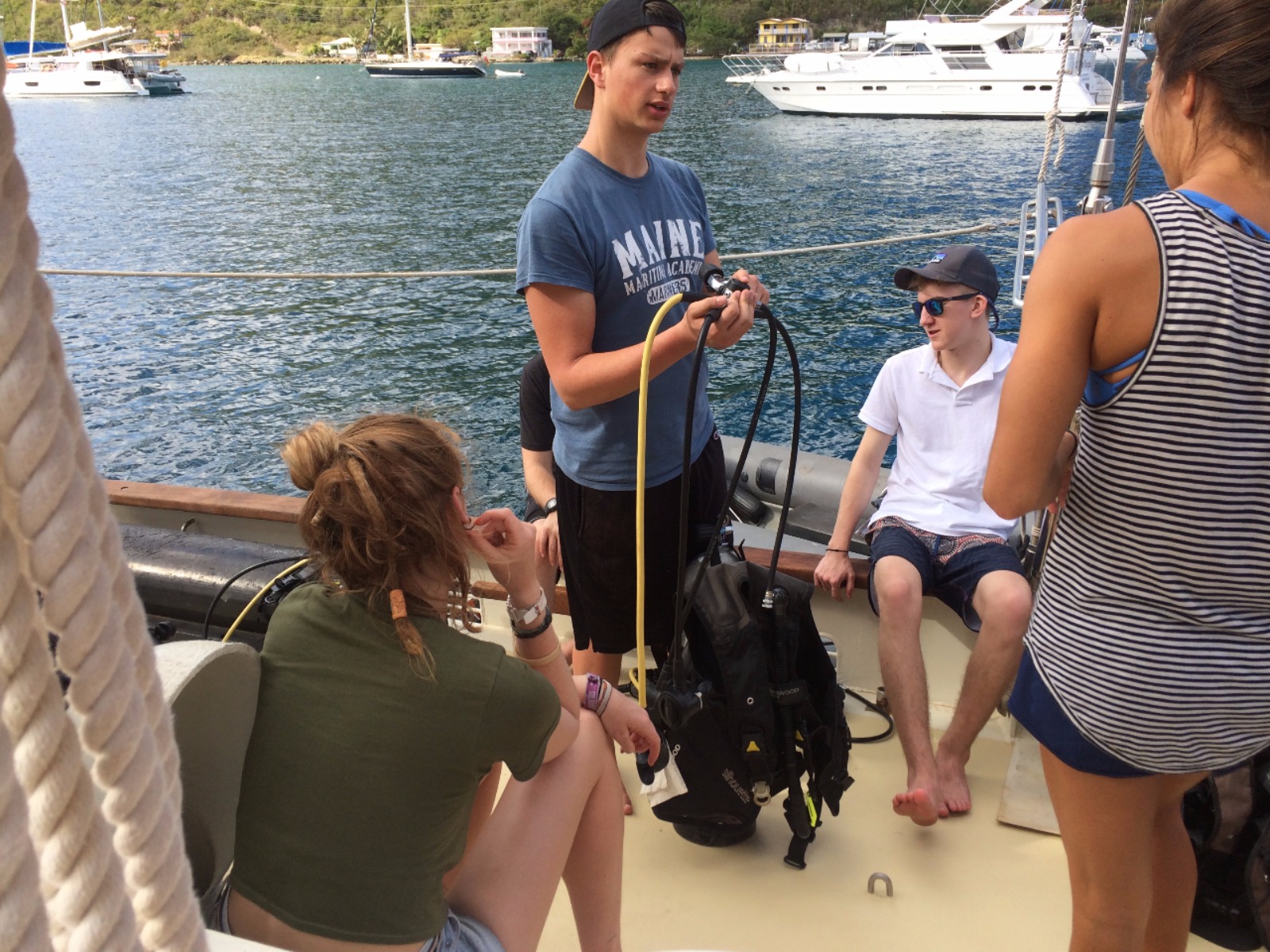 Ocean Star’s crew for the spring semester woke to their first morning on board their new home. After breakfast, the crew broke into their assigned jobs during the first of many meal clean-ups. Under the guidance of the staff, the shipmates learned the finer aspects of what it means to be deckies, salties, gophers, stewards, and all the other daily jobs needed to be done to keep Ocean Star in good working order. After a quick meeting reviewing the expectations we have for our shipmates and our trip, the shipmates went to grab their Type I and Type V PFDs to learn about one of the most important pieces of safety equipment they’ll use during our voyage. After an awesome lunch of ABCLT’s prepared by Marina and Max, our Open Water students went below to watch the first of their Open Water videos and completed the first of their knowledge reviews. After this, they practiced setting up and breaking down dive gear to become more familiar with the equipment. Ian and I began the crew’s seamanship training, teaching them the basics of line handling skills that will soon become second nature. After a dinner of chicken wings and sweet potato mash, the shipmates participated in their first “squeeze,” They all shared the things they were most looking forward to on our voyage together. Listening to all the different answers shared around the table, we’re reminded of all the amazing things we’re about to do. We can’t help but be excited about our adventure together.