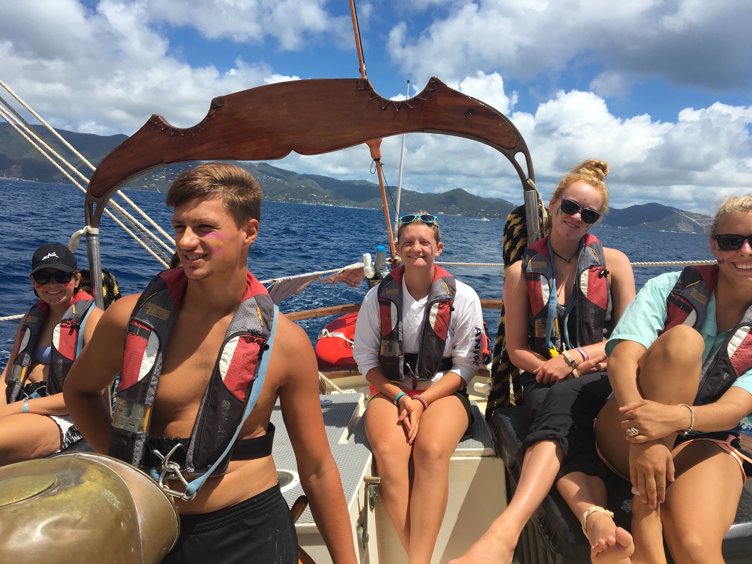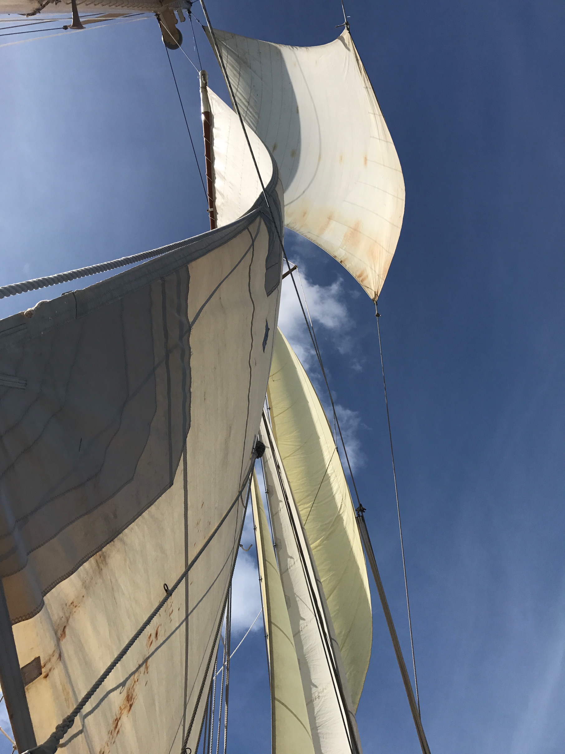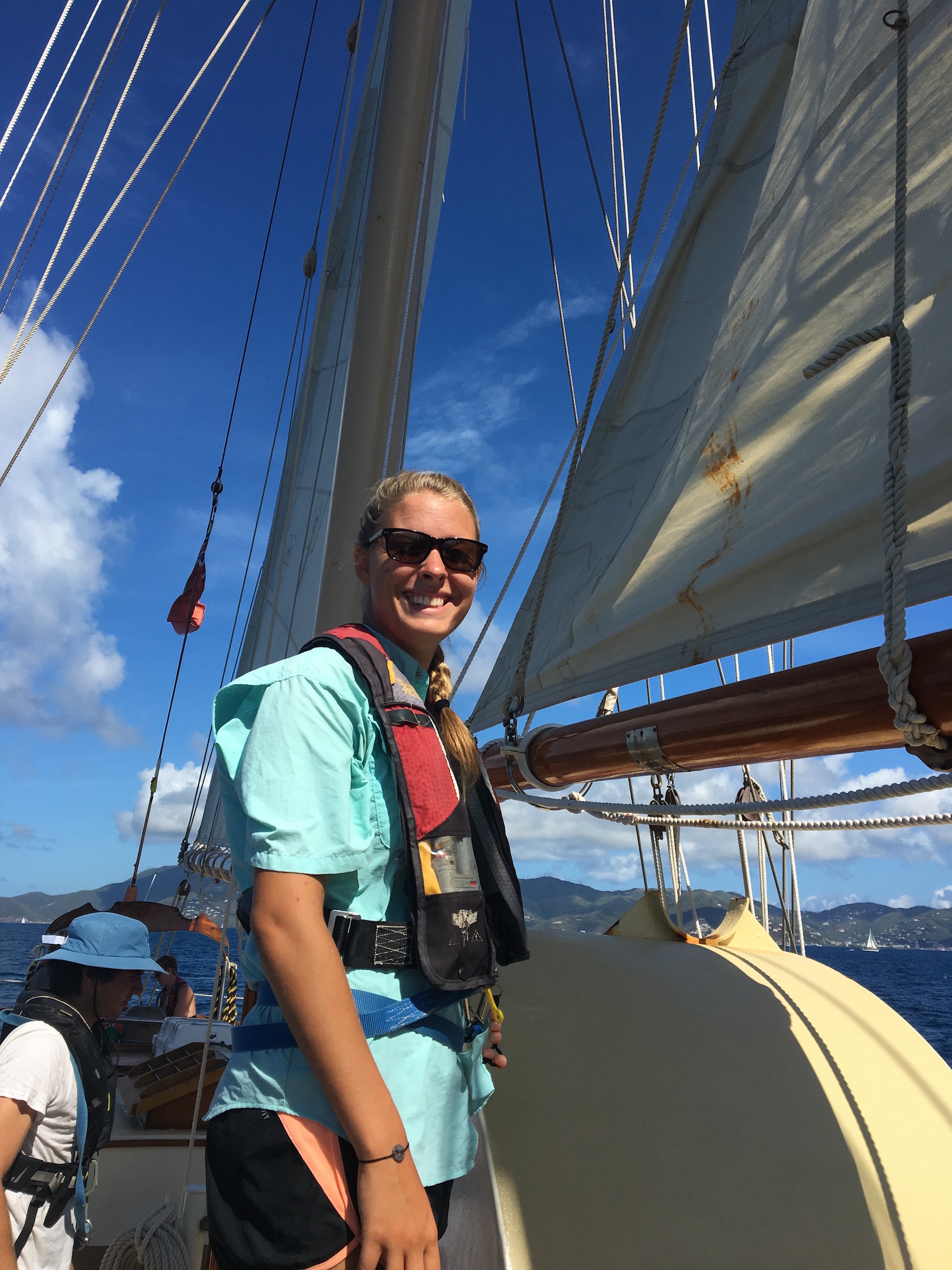 This morning, we headed from GHP to Norman Island for our final day of sailing. We will motor for the last days of our trip because the locations are close together, so the crew was pretty excited to throw the sails up one last time. The wind was favorable, and we had the sails up in less than 10 minutes. As we steered for Norman Island, the staff decided that conditions were favorable enough for us to raise the sixth and final sail onboard Ocean Star: the fisherman. Up until now, the staff had only talked about it, and we were eager to see it in action. With all sails up, we were making 10 knots towards Norman Island in just 15 knots of wind.