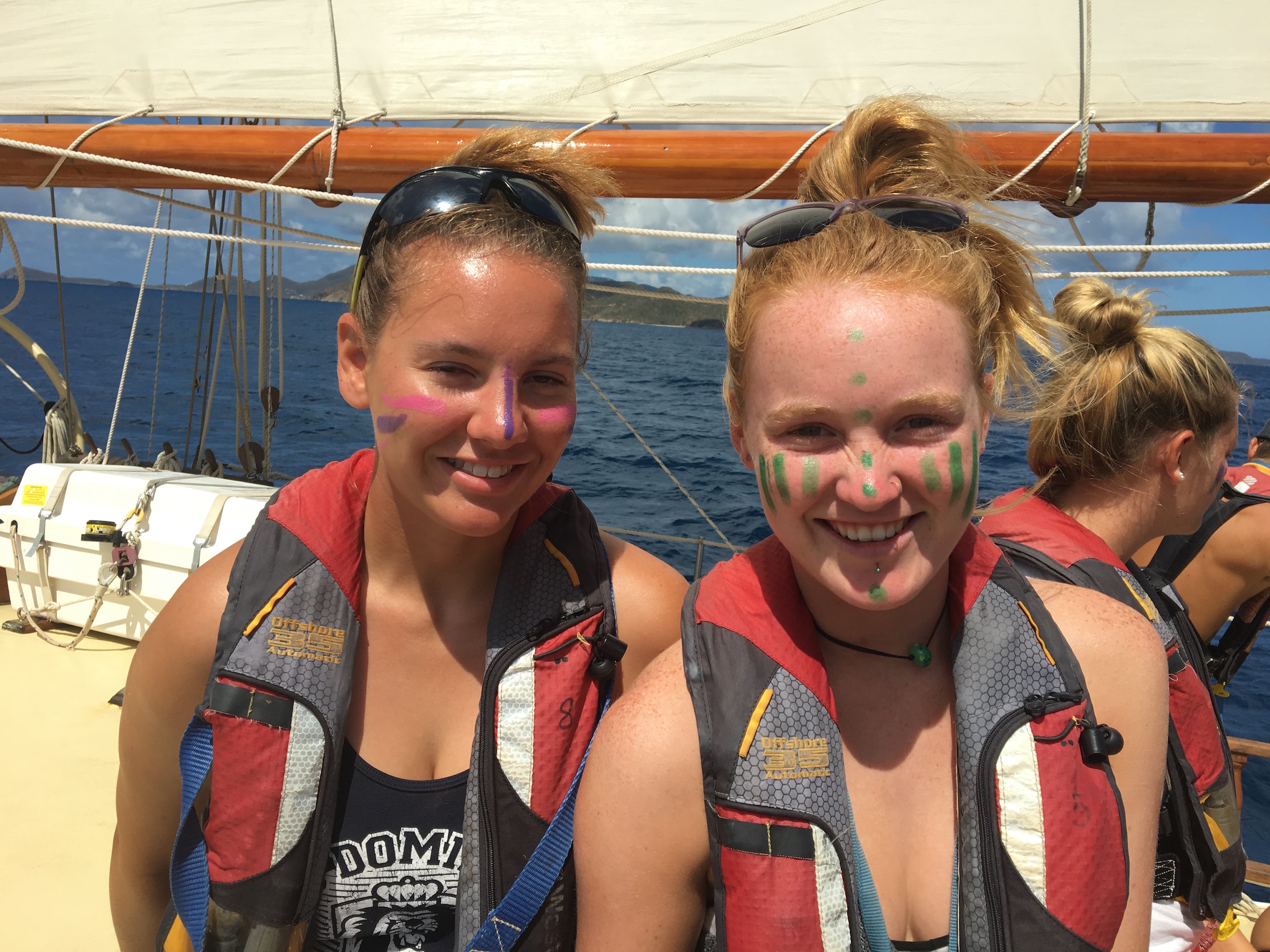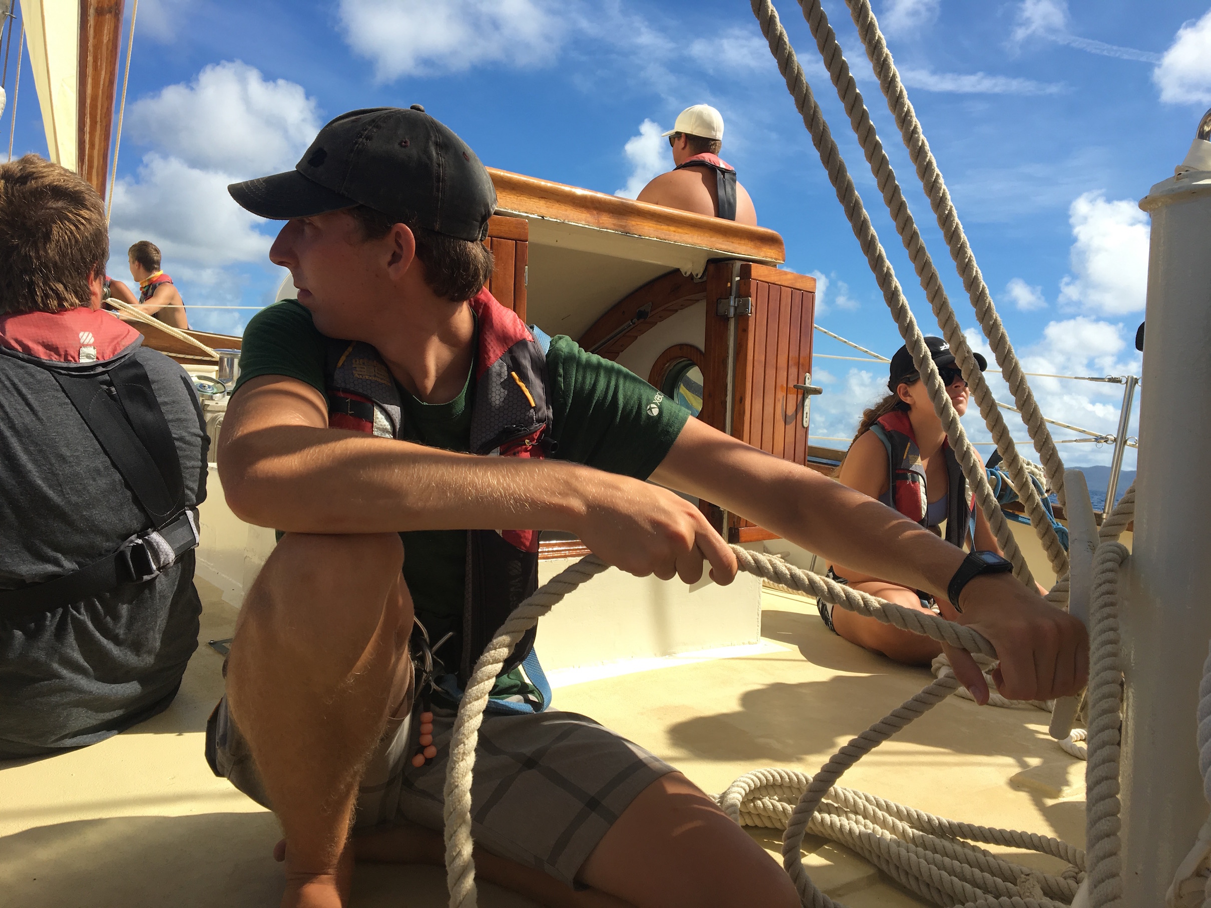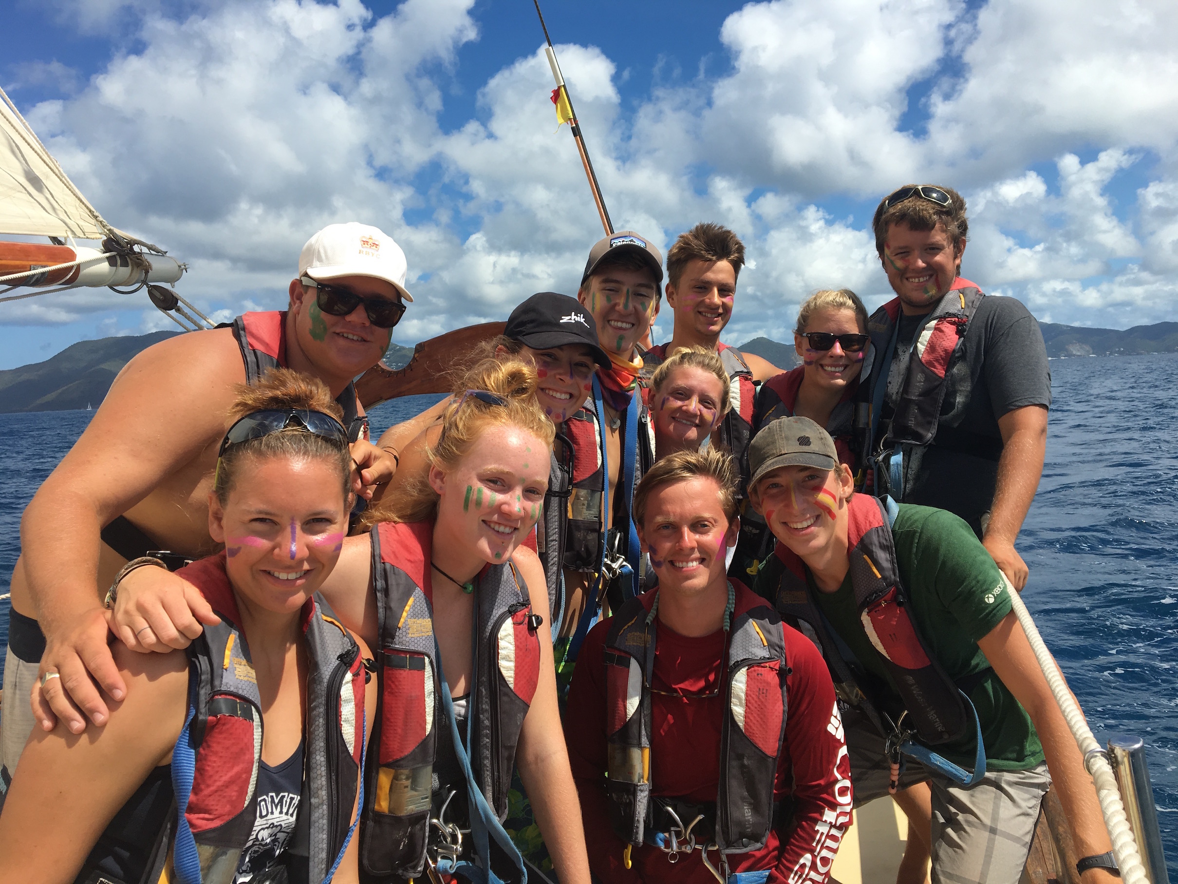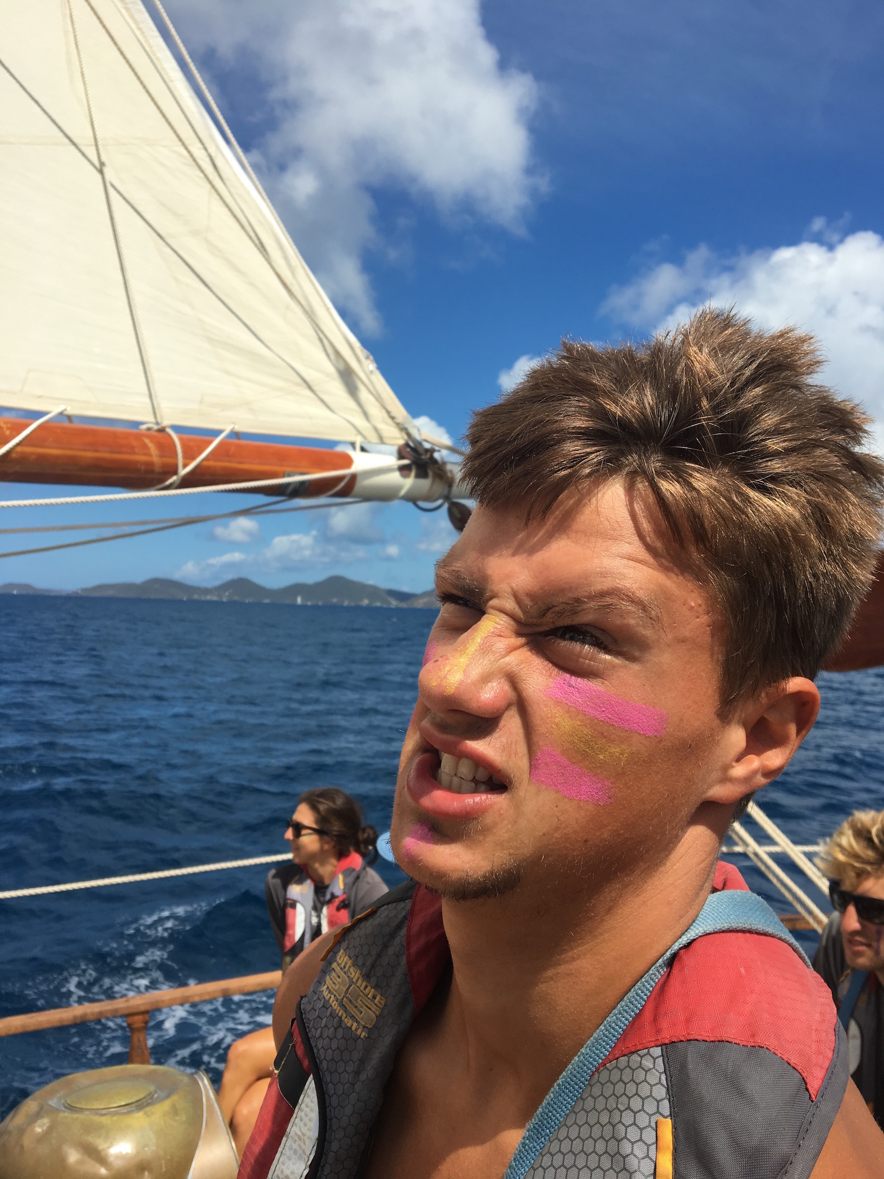 This morning, we headed from GHP to Norman Island for our final day of sailing. We will motor for the last days of our trip because the locations are close together, so the crew was pretty excited to throw the sails up one last time. The wind was favorable, and we had the sails up in less than 10 minutes. As we steered for Norman Island, the staff decided that conditions were favorable enough for us to raise the sixth and final sail onboard Ocean Star: the fisherman. Up until now, the staff had only talked about it, and we were eager to see it in action. With all sails up, we were making 10 knots towards Norman Island in just 15 knots of wind.