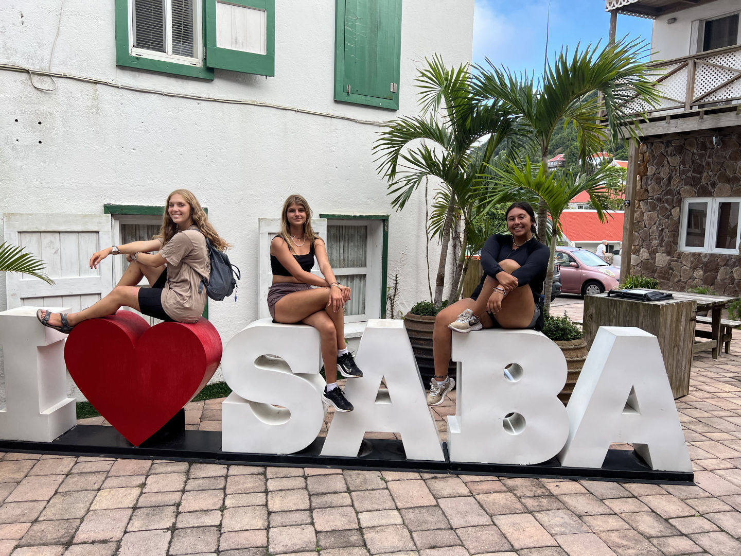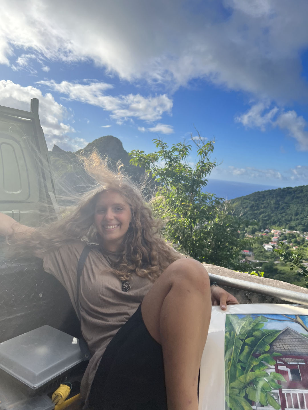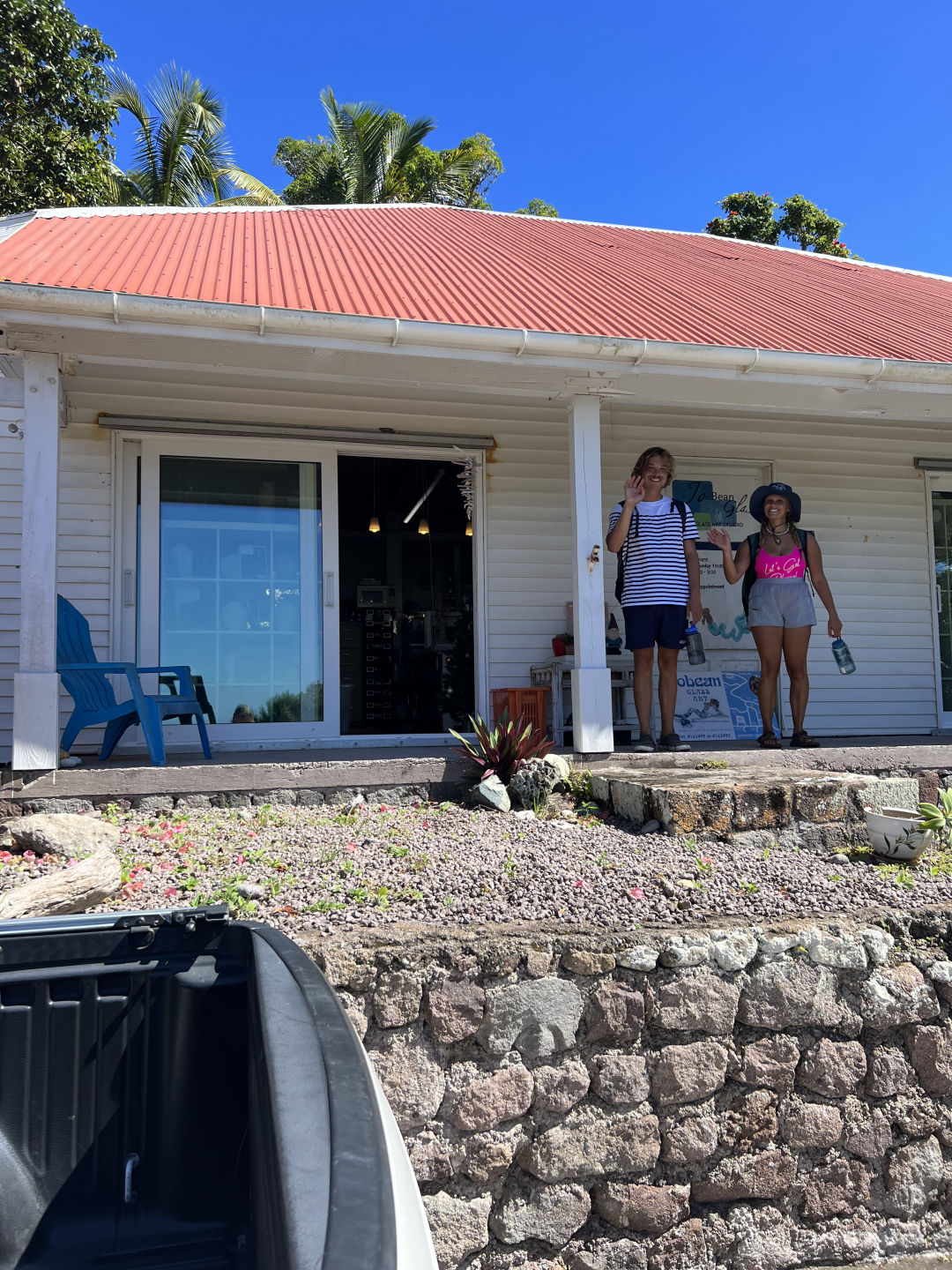Crazy seeing you guys here! My shore day started off a little rocky, literally and figuratively. The ladder. WOW. That ladder was like the stairway to heaven. Unbelievably long and almost killed me. But do not fret! I persevered and made it to the main road to catch a ride. After about 15 minutes of standing in the middle of the road with my thumb up, feeling (and I’m sure also looking) like a fool, a nice man in a truck drove by and turned around to pick us up. Here in Saba, the main mode of transportation is hitchhiking; the locals are very familiar with picking people up for no other reason than kindness. The first man that gave us a ride only made us pay in the currency of helping lift a table into the back of his truck. The feeling of riding through hilly Saba and seeing the views from the peaks and valleys of the road was unbelievable. He then dropped us off at the bottom of the Mt. Scenery Trail! The crew on that ride began our trek up the highest peak in the Netherlands for a few minutes until we stopped lying to ourselves and turned right back around to check out the town. Kebo, KT, and I began a whole new trek, one to the infamous JoBean. A wonderful woman on the island that makes beautiful glass art that we all visited to admire her work. Post-JoBean, I do what I do best onshore days, which is sit my butt down and eat at a restaurant. We enjoyed a wonderful meal and then proceeded to walk all around the island (partially because we got lost but mostly just to explore). We then circled back around to where it all began, the trailhead, and awaited for another driver to come our way.