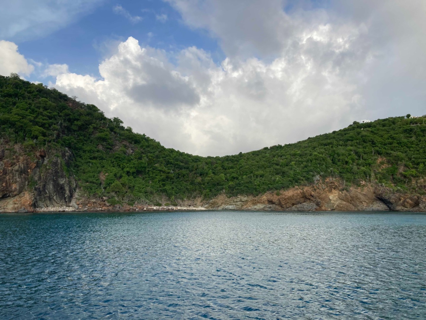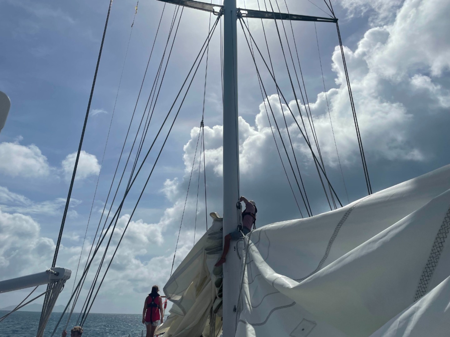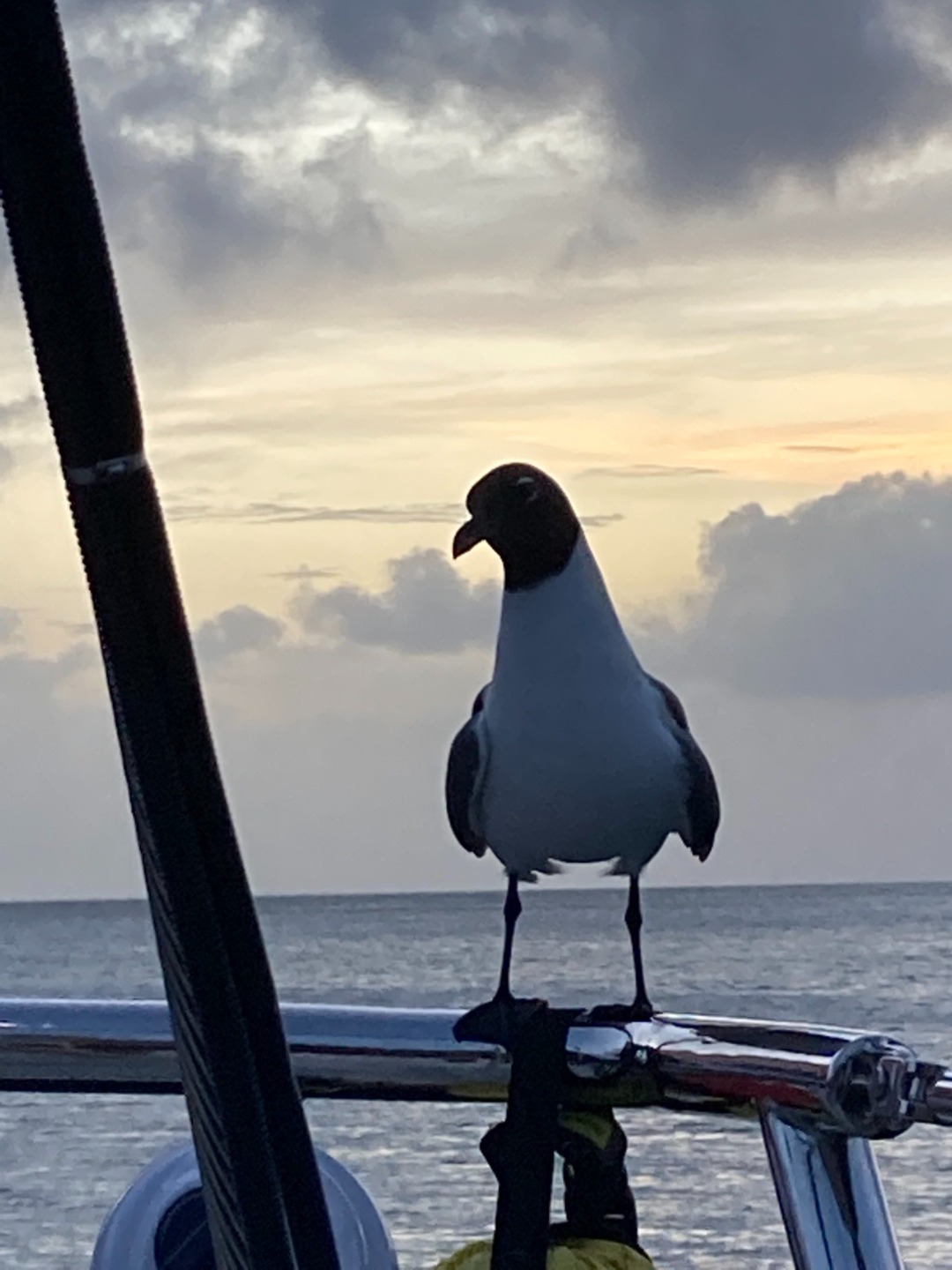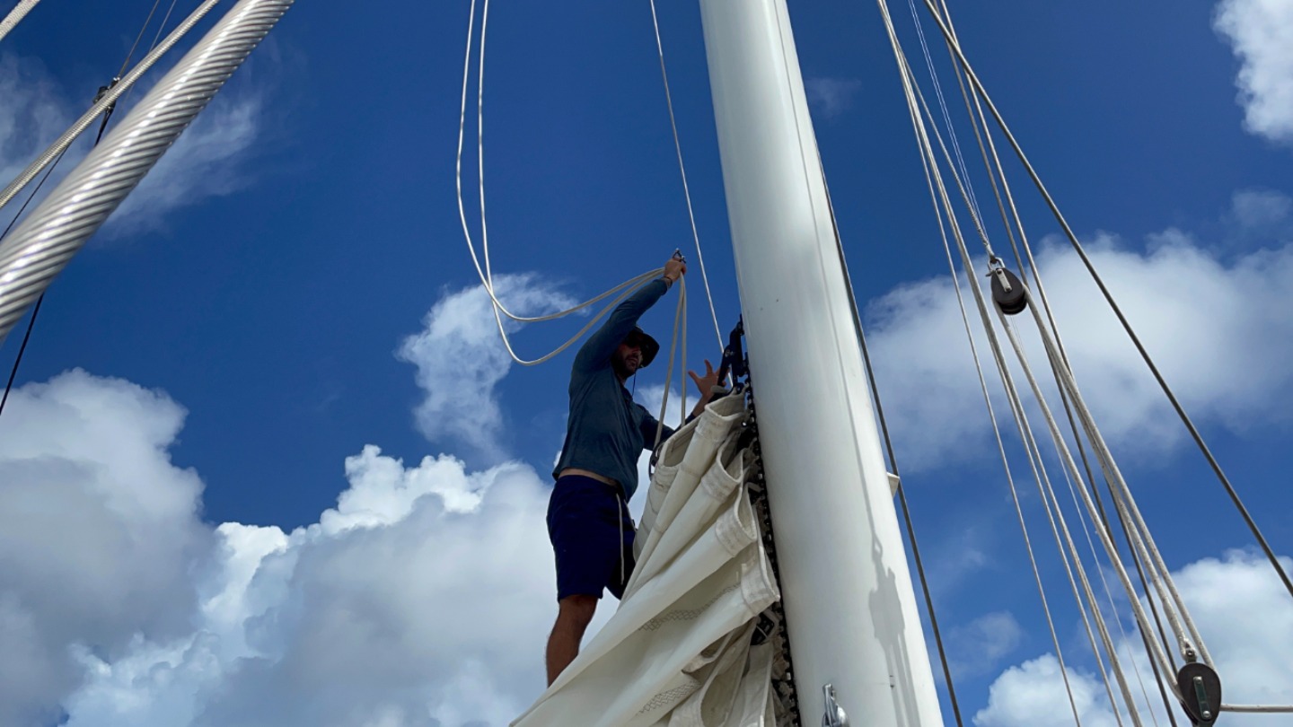 Today aboard Vela was a busy and wet day to be had by all. After a lovely breakfast of banana bread and orange-cranberry loaf, we began a boat walkthrough, becoming more confident and knowledgeable about our home for the next 65 days. This is also where the imposing rain stepped in, frequently pelting us with rain and chilling us with the wind. Despite it all, we managed to get the sails raised and were underway to Muskmelon Bay. Lunch underway went swimmingly, burrito bowls with the addition of occasional squalls and moments of high wind. Before we knew it, we were dropping those full sails in exchange for a bit of engine power and an anchor in a gorgeous bay, surrounded by high cliffs and a wide-open entrance/exit. Once everything necessary to anchor was completed, we went below deck for introductory lessons to the two courses taken by all students; Basic Seamanship and Student Leadership. Both classes will deem useful, if not vital, to group cohesion and overall a better experience aboard Vela. As soon as class was over, I was brought back to my school days, with everyone rushing to get out of the benches and up on deck for swims and showers. Dinner tonight was amazing, simply called Asian Bowls; it reminded me of deconstructed sushi with cucumber, tomato, rice, seaweed, fried eggs, and either chicken or tofu. During dinner, we had a special visitor, Steven Seagull, who sat on the stern of Vela just eyeing up the meal. He/she only stuck around for a few moments before flying off and taking a fish out of the water. That was our day today, and now, anchor watch begins. Skipper of the day, signing off…