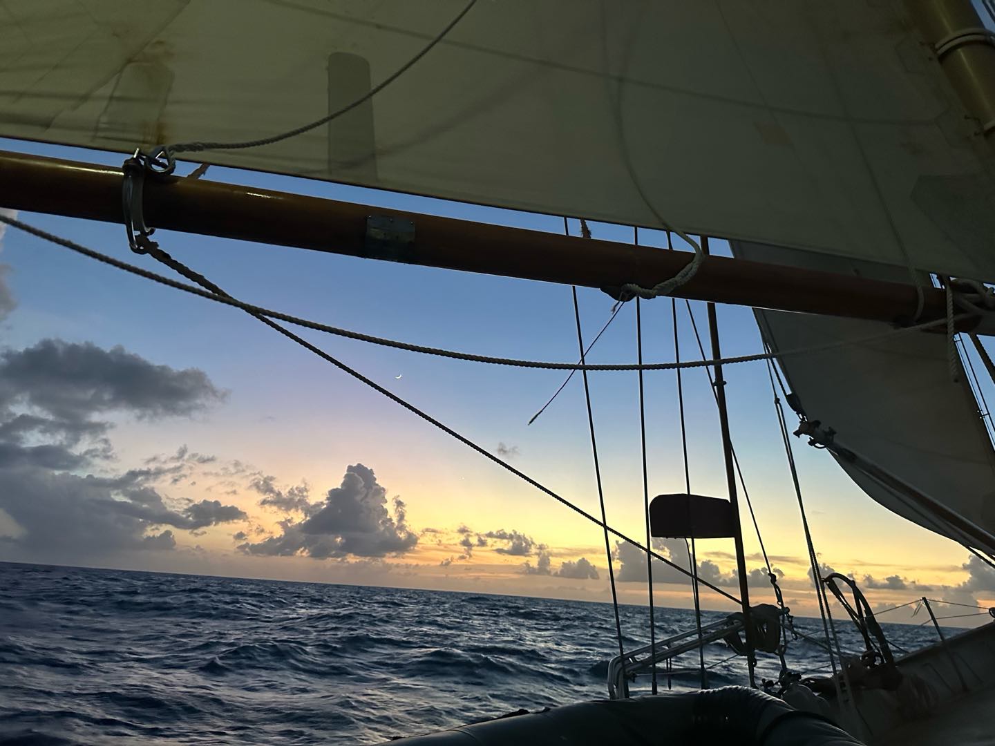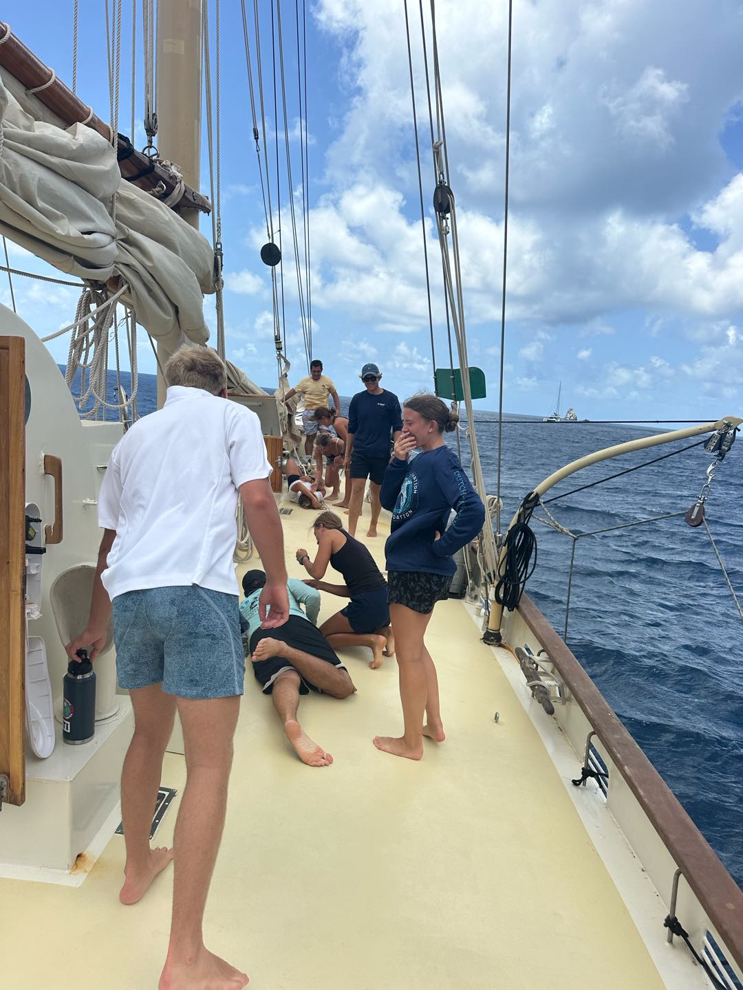 We had a nice wind gust, which allowed us to maintain good speed, giving us an ETA of tomorrow morning around breakfast. We then had a practice medical emergency as part of our EFR training, this time involving Zoe and a spinal injury and Nick with a serious bleed after an incident with the fire axe. Our afternoon consisted of two more classes, another Oceanography lecture held by Ben, and an introduction to VHF by Captain Nick. I found the oceanography lecture to be quite engaging at first, but with the rocking of the boat and the salon’s exhausting heat, my eyes began to close. I didn’t expect to doze off but everyone else was starting to do it too, that’s when all the sudden I felt a kick from under the table which was Bens way of saying wake up without shouting. That was the last time I closed my eyes during class; however, other students couldn’t resist. Unfortunately, I didn’t get to use my radio during the VHF class, but next time, I’ll make some good use of it.
