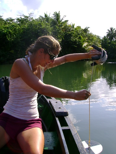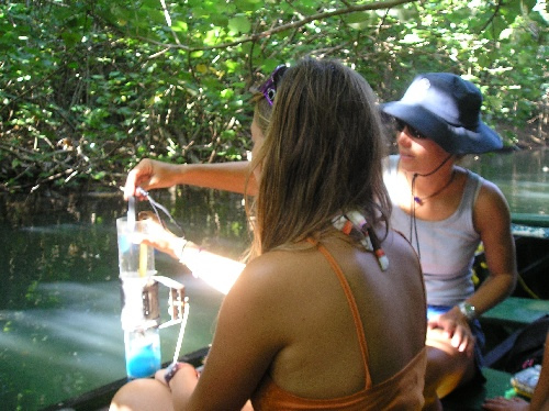 Today was another exciting day in Dominica, exploring the island. The day began with a drive up the leeward side of the island to Portsmouth, where we rowed up the Indian River with our local guides. During this, we took salinity and temperature measurements at different depths. We will be analyzing and graphing our data in a later science class and then determining what category of the estuary the river was exemplifying. It was a great opportunity for some real hands-on science in a very picturesque environment. We kept our eyes out and saw some mullets, crabs, and egrets in the mangroves. We then headed over to the windward side, stopping en route for guavas, coconuts, and seeds for making necklaces. We enjoyed a tasty lunch of freshly baked bread sandwiches, coconuts, and almonds fresh from the trees. After lunch, we headed over to the Carib Indian settlement, the only remaining original settlers. Here, we stopped for some delicious cassava bread, gift shopping at the local craft stalls, and some more fruit, such as sweetsop and custard appleso many new tastes to experience. We stopped by one of Sea Cats’ friends’ houses for some fresh cocoa, coconut water, herbal teas, and more local herbs and spices. Driving back along the windward coast, we stopped at a banana plantation and a citrus farm – loading up with yet more fresh local fruits.