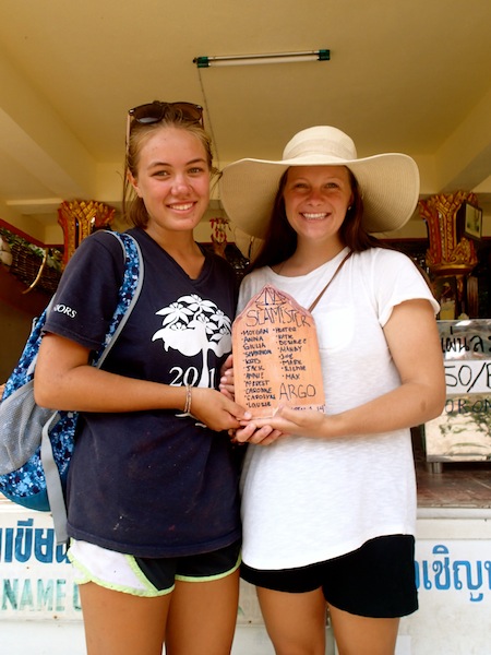 Today has been a good day. I think I speak for everyone on Argo when I say that we are so happy to be back in Thailand. We woke this morning to Richie, Shannon, and Carolyn’s freshly made chocolate and cinnamon apple donuts, which were delicious! We promptly cleaned up and headed to shore to get in some tour buses that were going to show us around the island. The weather was scorching, so the air-conditioned vans were a very welcome luxury. Our first stop was the large Buddha statue set in a temple on the coast. Many of the shipmates gave a few donations to the temple there and were granted a blessing from the monk. He tied a multicolored bracelet around each of their wrists. Our second stop along the way was a beautiful overlook showing the coastline all down one side of the island, including a view of Argo, anchored very far in the distance. We only stopped there for a short time because we wanted to see the Grandfather and Grandmother rock structures along the far coast. Now, if none of y’all know what these are and really want to know, I would recommend researching them yourselves; let’s just say it was quite an interesting site. We departed the shops and rock structures to head to our second temple of the day. This temple was special, however, because it harbored the mummified monk. As we walked in, there was a large ceremonial structure set up with a glass case in the middle. Inside this case, there was the mummified monk. He sat in traditional orange robes cross-legged and praying. The best part of this experience, however, was the brand-new black Ray-Ban glasses that the monk was sporting. At least we know that the monks had a sense of humor. From there, we all packed back into the van, where we took a 30-minute trek into the jungle to an 80-meter waterfall. The pictures we had seen were beautiful, and all the shipmates had their swimsuits and towels ready to jump in and swim for a bit. To our dismay, we were there in the dry season, and the waterfall had reduced to nothing but a trickle. But our trek out there had not been for anything! We were greeted by a baby elephant and were able to feed it bananas from across a fence. Many shipmates got to experience seeing an elephant for the first time outside of a zoo, and it was quite adorable. Our tour ended with a delicious meal of traditional Thai food right on the beach. We took the buses back to our anchorage and headed home for dinner. Richie and Carolyn surprised us again with fried fish sandwiches, onion rings, and french fries! Yummmm. The boat is all tucked in for bed, and the waves are lulling us to sleep. Sweet dreams, everyone. Until a new day. -M