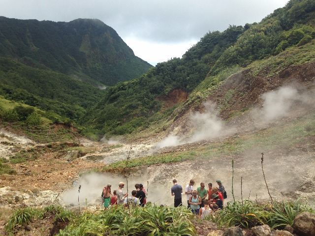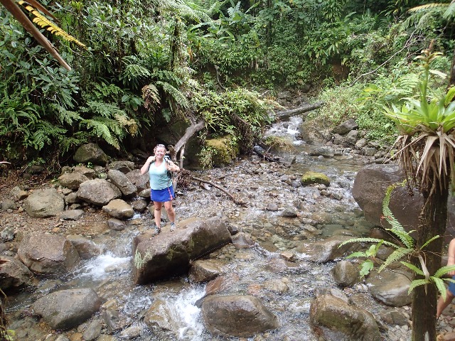 Today was the Boiling Lake hike in Dominica, dreaded for some, feared for others, and long-awaited for everyone else. We got an early start to the morning and headed out in two vans for the hike at about 8:00 am. Zack could barely stay in his seat because he was so excited. On the other hand, some of us wished the drive could continue on to the very top of the hike. After the beautiful drive around Dominica, we finally arrived at the trailhead and piled out of the vans, ready for an adventure. It started out easy, a paved path that led through the trees, but that only lasted about 100ft. It quickly turned to dirt and a log path leading us deep into the rainforest with birds chirping all around. In the beginning, our journey was not too strenuous, though we all tried to hop over puddles to prevent our shoes from getting dirty. We went up and down and up and down the terrain, hopping on rocks to cross a river, and then headed up and up and up, surrounded by so much green. The trail got steeper. The logs got farther apart, but we pushed on until we reached the highest point in the hike. Next, we headed for the Valley of Desolation. However, getting there was quite a challenge. We came upon a stretch of stairs and headed down to the valley that was covered in mud. Lexie’s method was to go quickly and keep forward momentum to keep from falling. Some of us had better success “skiing” down the mud-covered stairway, trying to navigate around the trees and keep going down, down, down.