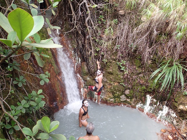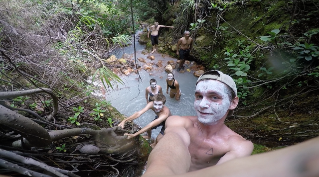 The cleanliness of our shoes was no longer of much concern. Instead, the goal was to try not to be covered in mud from head to toe. We finally made it through the mud trap and kept on climbing down to the Valley of Desolation, where we found rocky, treeless terrain and a hot spring. Our guide, Pancho, kindly boiled eggs for us in hot water. We also enjoyed Pancho’s fish salad sandwiches, and after refueling, we were ready to proceed. However, we didn’t travel very far. A few steps down the way, we stopped to scrape some mud from the riverbed and enjoy a natural face mask. After quickly applying the mud to our faces, we marched on. Up and down, we went back into the trees and the rainforest, where we found the perfect swimming hole from the hot spring water where we could wash our face masks off. It was the hottest shower we have had since Cape Town. Most of us could have relaxed for another few hours, but it was time to move on. Lunch was in sight.
