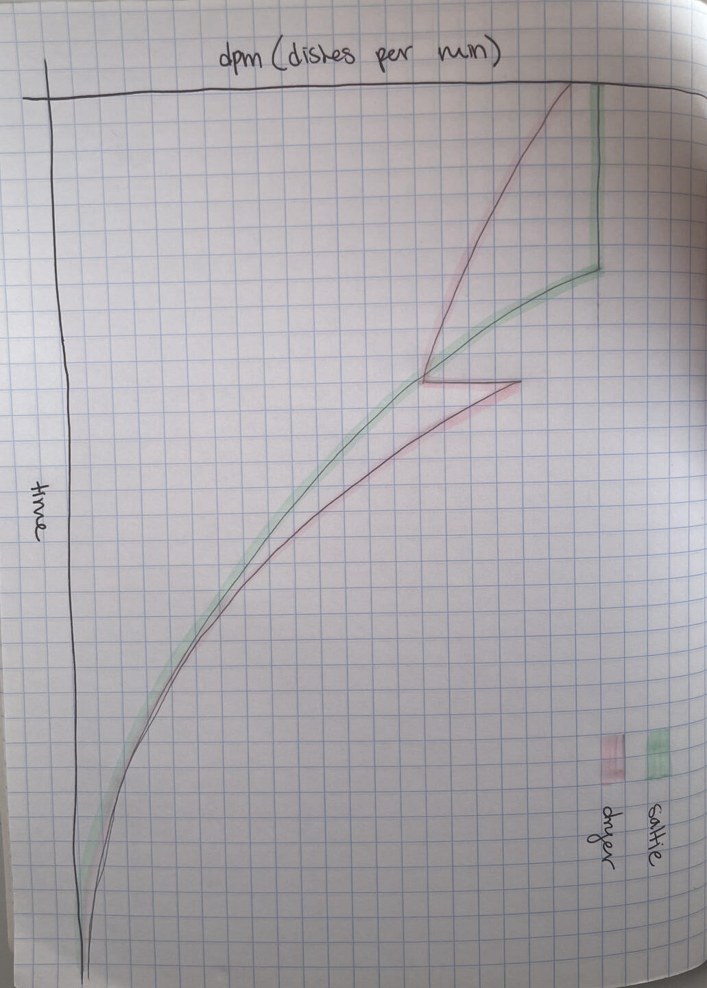 On the other side of the pit, we have the dryers. One would think that the dryer dpm graph would look very similar to the salties, but I disagree. Initially, it’s assumed that the dryer starts with a bone-dry towel (this is not usually true, but for the sake of the argument, we will state this). Dryers are able to dry at a slightly lower rate than the salties can clean things like bowls/plates/silverware. Additionally, as more dishes are done, the drying tools (towels) get wetter and wetter, increasing the drying time of every item and decreasing the dpm. Eventually, a point is hit where the dryer must get a new dry towel. This point usually hits after the dpm of the salty pit has already decreased, so now the dpm of the dryers is higher than that of the salties. But wait, you say, the dryers can’t dry any faster than the salties salt because they need their dishes to dry! While this is a good thought, you have to remember that initially, the salties are producing faster than the dryers can dry, so there is a bit of a backlog (think of the integrals, and it will all make sense). During the fresh towels, while still having a backlog overlap, the dryer dpm is higher than the salty dpm. After the backlog is made up for the dryers, only dry at the dpm that the salties clean at, also eventually reaching zero when the dishy pit is done.