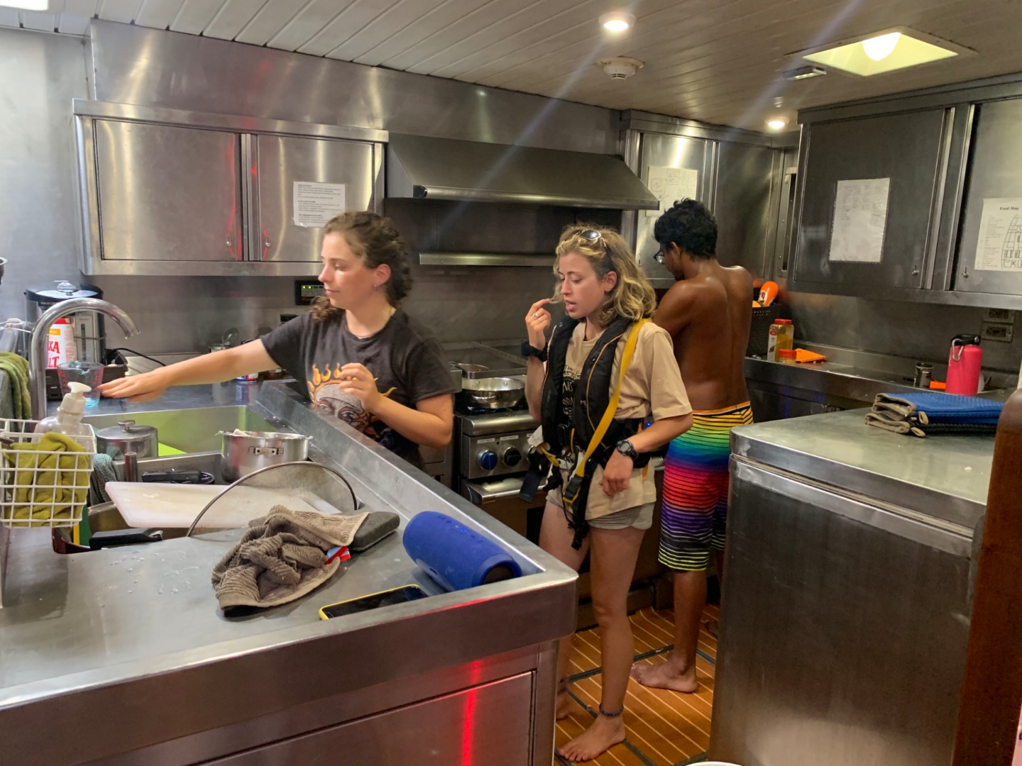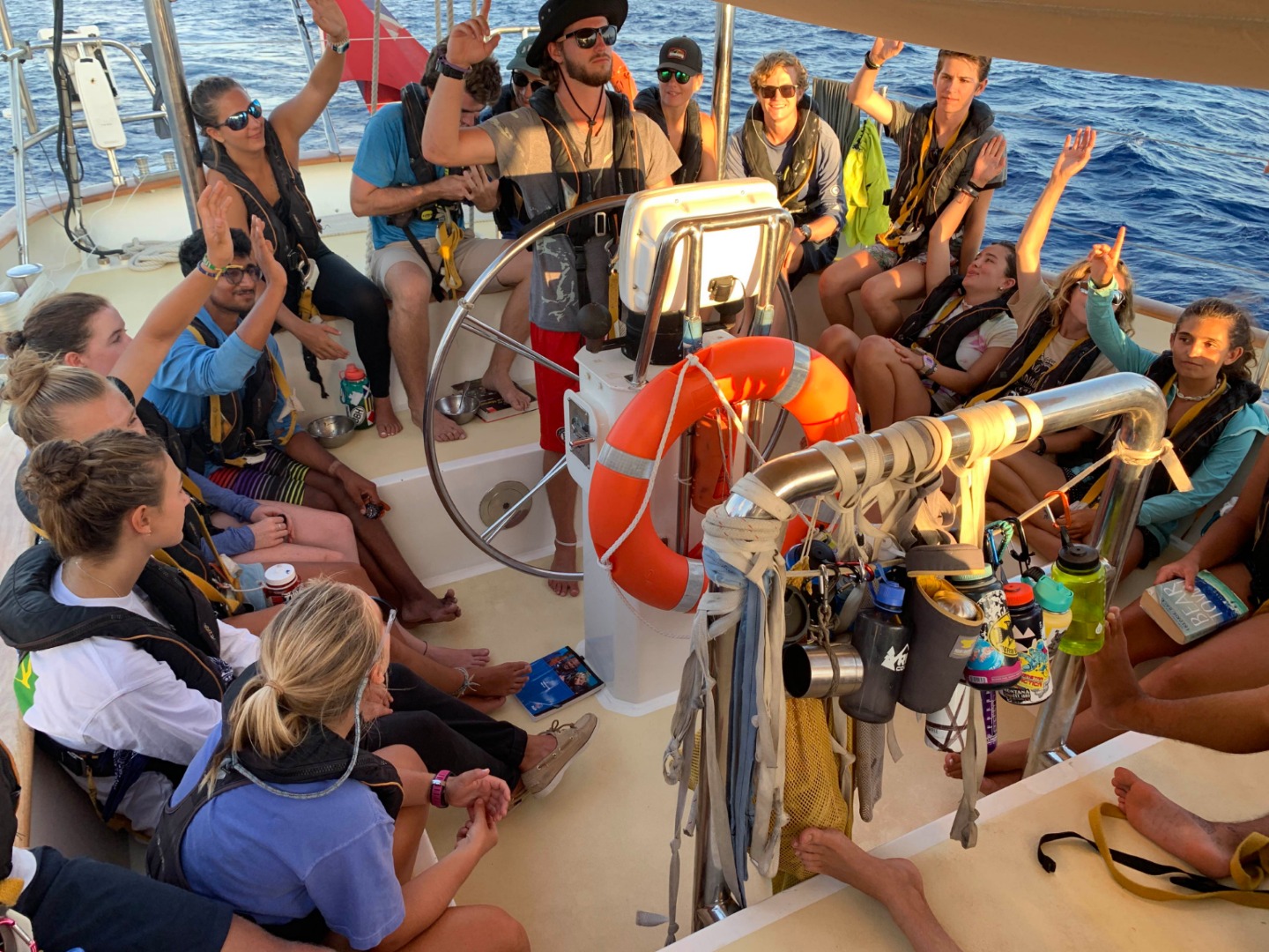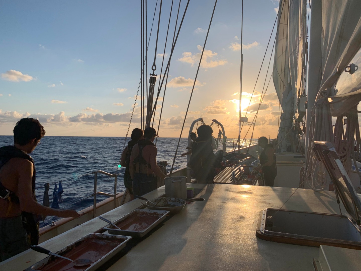 Day 7 of passage started with a great Indian meal for lunch, chefed up by Sam O; The naan was very good. Following lunch, we had a very interesting oceanography class. Alex taught us all about waves, including rough waves, tsunamis, and what creates waves. Everyone found this pretty intriguing, considering we are headed to South Africa, which is known for big swells. We also had seamanship today, where we began our Nav Master. Our Nav Master consist of many different skills which include, plotting coordinates, reading charts, and chart work. Today we practiced plotting coordinates, which is a very useful skill that we use every time we are on watch. The group looks forward to continuing to expand our Nav Master knowledge. After class and showers, we had another great meal, chicken tandoori.