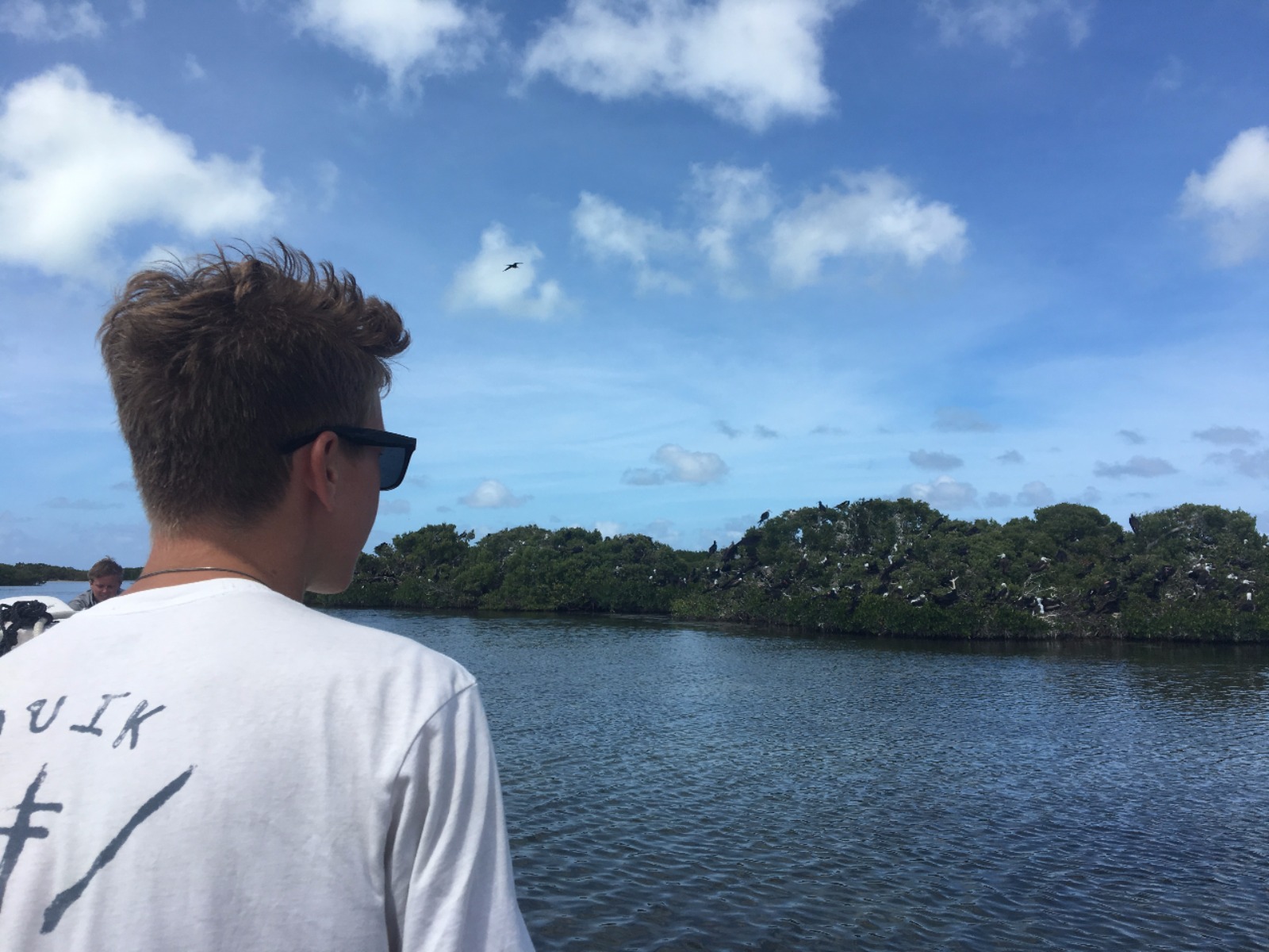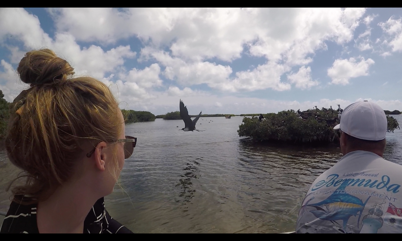 After a delicious lunch of black bean burgers prepared by our chefs, Thomas and Drew, everyone grabbed their fins, masks, and snorkels and took a very wet dinghy ride to shore. One of the early highlights of this trip ashore was the unexpected time spent body surfing and playing in the waves as we waited for everyone to make their way onto shore. Afterward, we met up with our wonderful tour guide, George, and began a boat ride over to the magnificent frigate bird sanctuary, which is the largest in the world! Seeing the abundance of these beautiful birds and their nests in the mangroves was absolutely amazing. The males inflated and displayed their red chests, looking for mates late in the mating season, and the females soared overhead, eyeing potential mates. Many of the couples had already hatched chicks, and there were several white-headed juvenile birds among the mangroves. We finally got to cool down after cruising around the magnificent sanctuary. We hopped in the water and got our chance to snorkel around the mangrove trees to see up close all the neat plants and organisms that live in that area. The mangroves create a nursery for many young fish to hide and grow into adulthood. There were many juvenile barracuda and other juvenile fish hiding in the shade of the trees. As the night drew to a close, we took our 4th oceanography quiz and followed that up with a documentary titled “End of the Line.” This documentary investigates the fishing industry and the current state of affairs concerning the world’s fish populations. Let us just say it is looking a bit grim at the moment. Another busy and exciting day is over, and the crew becomes more and more excited about our overnight passage to St. Barths tomorrow.